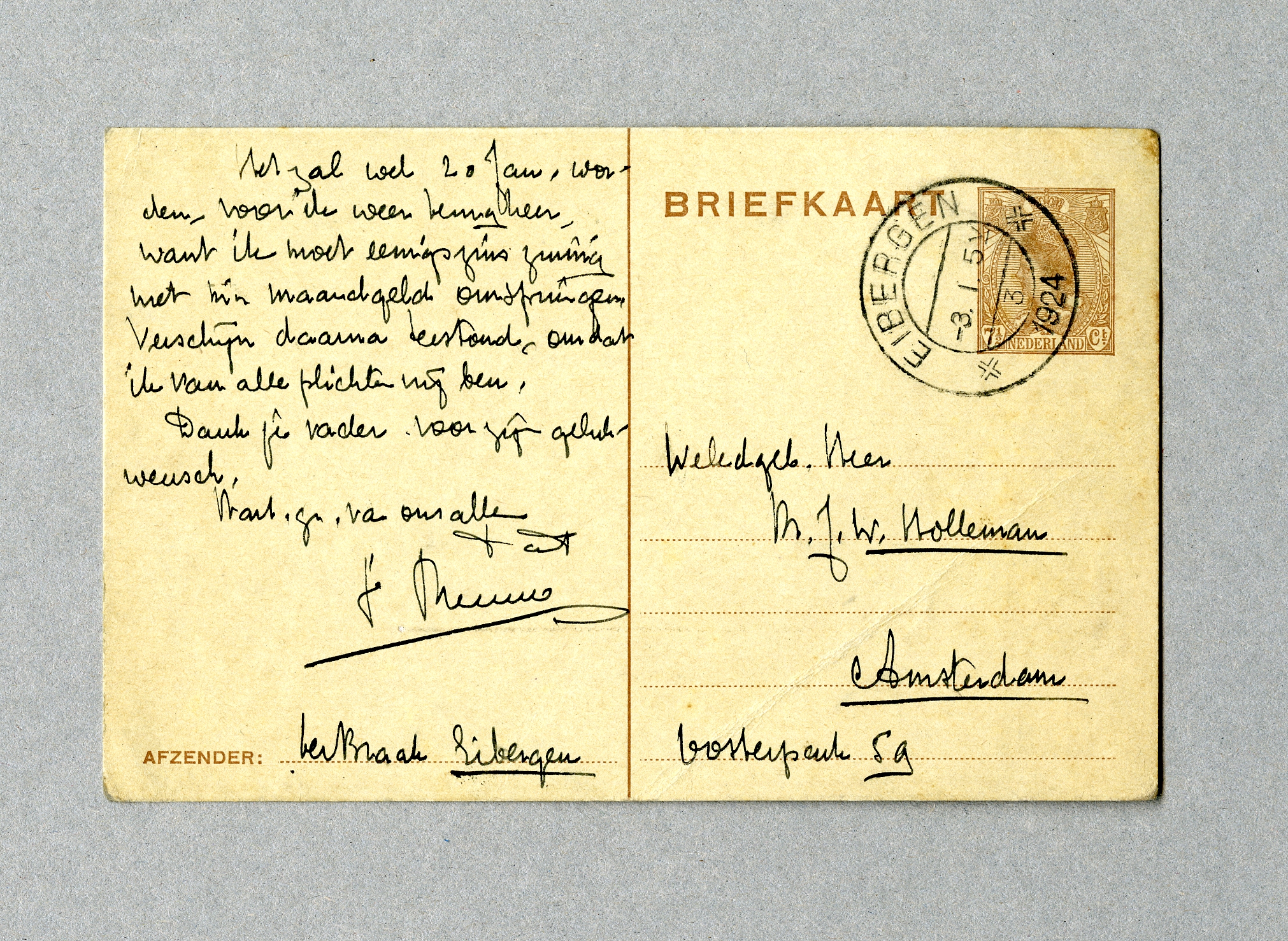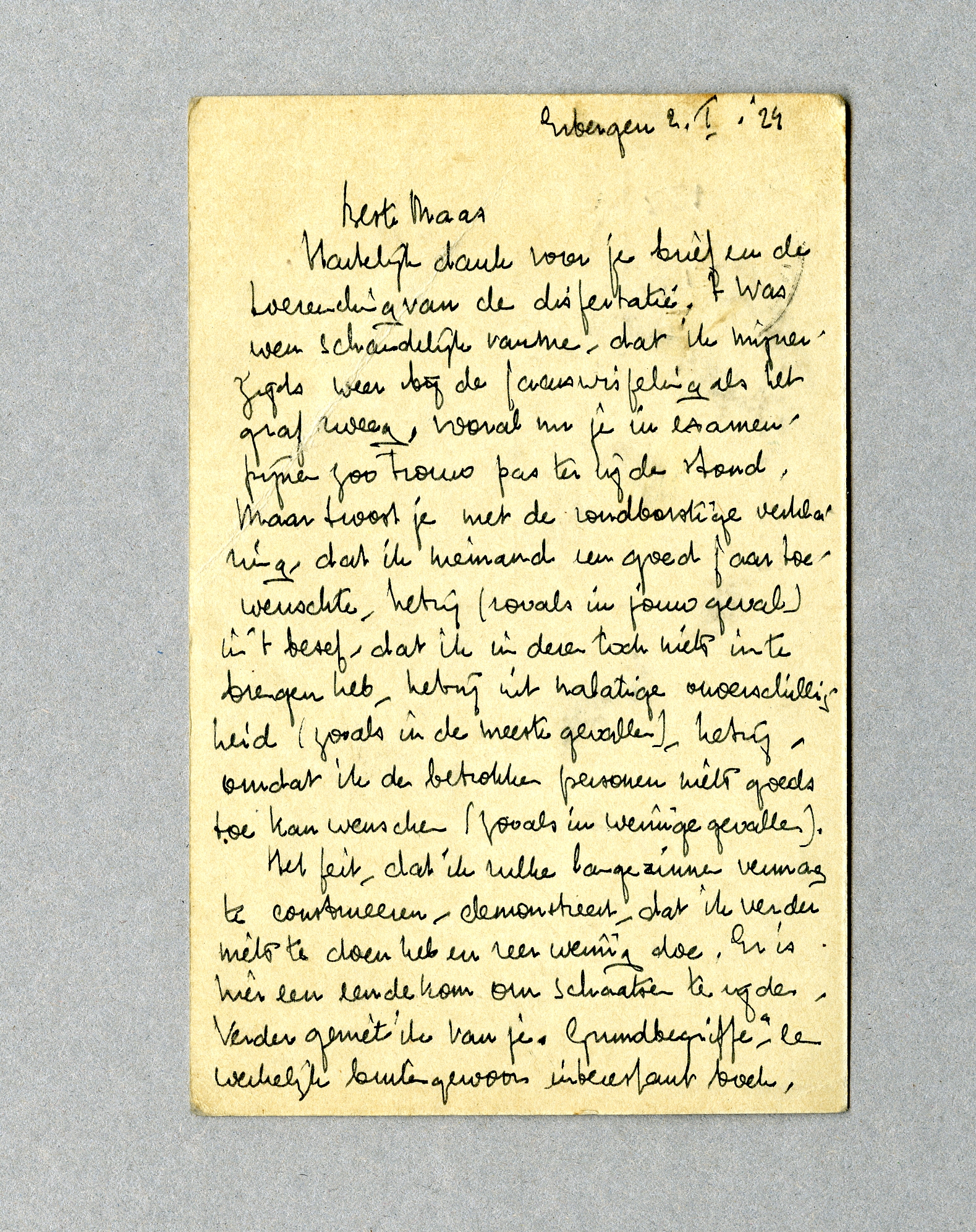 Hartelijk dank voor je brief en de toezending van de dissertatie. 't Was weer schandelijk van me, dat ik mijnerzijds weer bij de jaarswisseling als het graf zweeg, vooral nu je in examenpijnen zoo trouw pas ter zijde stond. Maar troost je met de rondborstige verklaring, dat ik niemand een goed jaar toewenschte, hetzij (zooals in jouw geval) in 't besef, dat ik in dezen toch niets in te brengen heb, hetzij uit nalatige onverschilligheid (zooals in de meeste gevallen), hetzij, omdat ik de betrokken personen niets goeds toe kan wenschen (zooals in weinige gevallen).