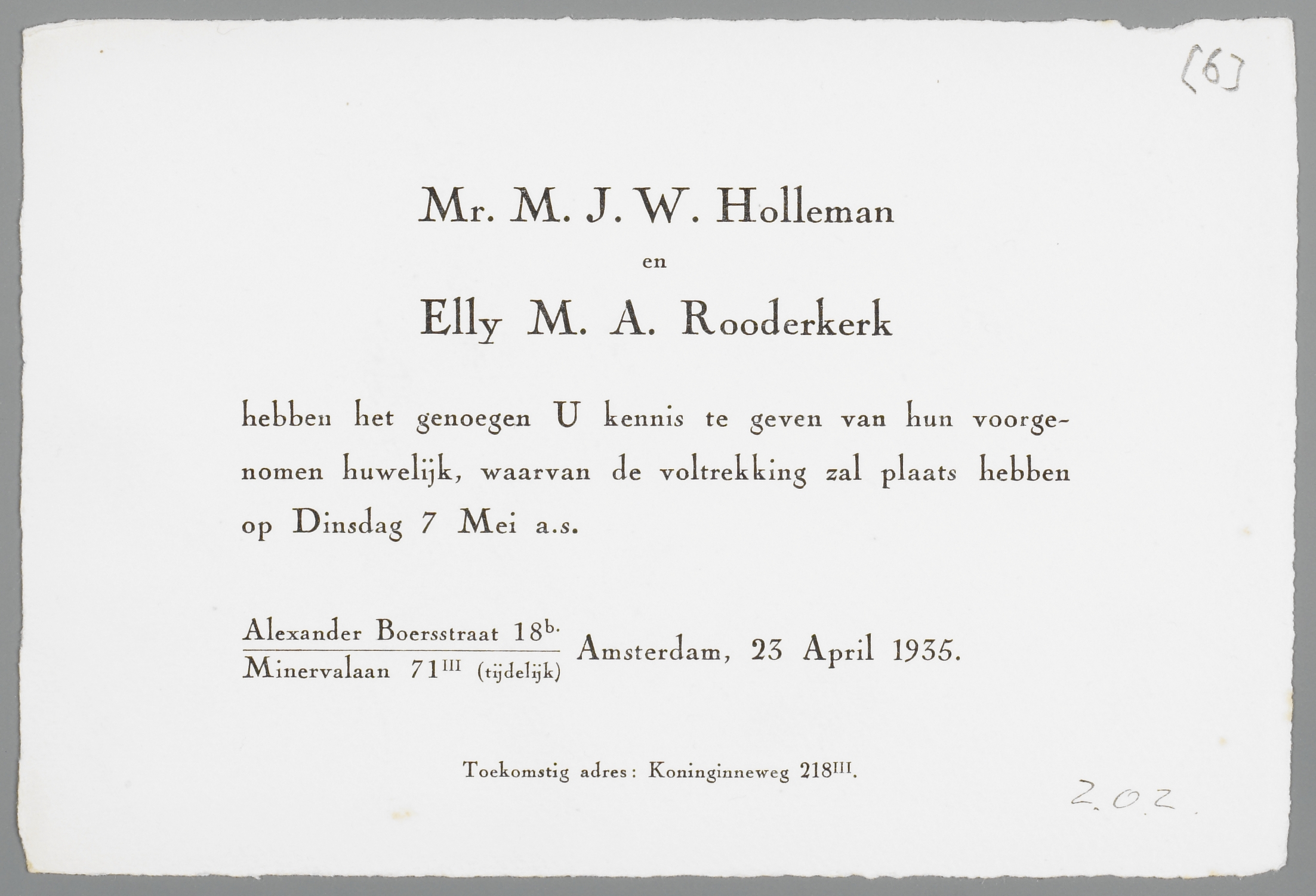 [Aankondiging huwelijk tussen Mr. M.J.W. Holleman en Elly M.A. Rooderkerk Zie: origineel]