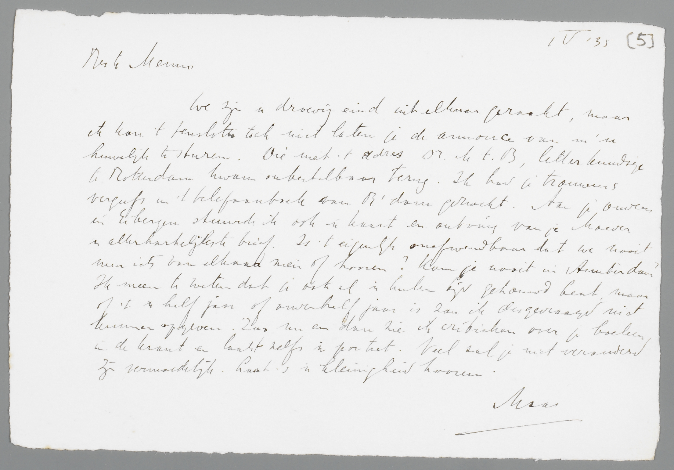 We zijn 'n droevig eind uit elkaar geraakt, maar ik kon 't tenslotte toch niet laten je de annonce van m'n huwelijk te sturen. Die met 't adres Dr. M.t.B, letterkundige te Rotterdam kwam onbestelbaar terug. Ik had je trouwens vergeefs in 't telefoonboek van R'dam gezocht. Aan je ouders in Eibergen stuurde ik ook 'n kaart en ontving van je Moeder 'n allerhartelijkste brief. Is 't eigenlijk onafwendbaar dat we nooit meer iets van elkaar zien of hooren? Kom je nooit in Amsterdam? Ik meen te weten dat je ook al 'n heelen tijd getrouwd bent, maar of 't 'n half jaar of anderhalf jaar is zou ik desgevraagd niet kunnen opgeven. Zoo nu en dan zie ik critieken over je boeken in de krant en laatst zelfs 'n portret. Veel zal je niet veranderd zijn vermoedelijk.