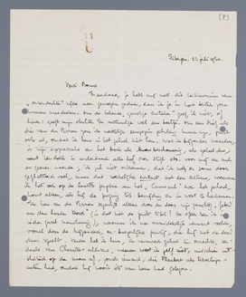 Ik hoop eind Juli voor eenige dagen in R'dam te komen, om te verhuizen; ik eet dan wel in Caland, zal anders zeker een poging doen, je te bezoeken aan de Zeekant. Naar het tijdschrift ben ik zeer benieuwd; alleen lijkt me een conditio sine qua non, om er tegelijkertijd minstens drie de nek om te draaien! Voor een nieuwe en betere concentratie zou ik alles voelen. En dan financieren met roemeensche percenten uit perspompen gewonnen.