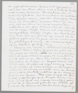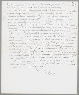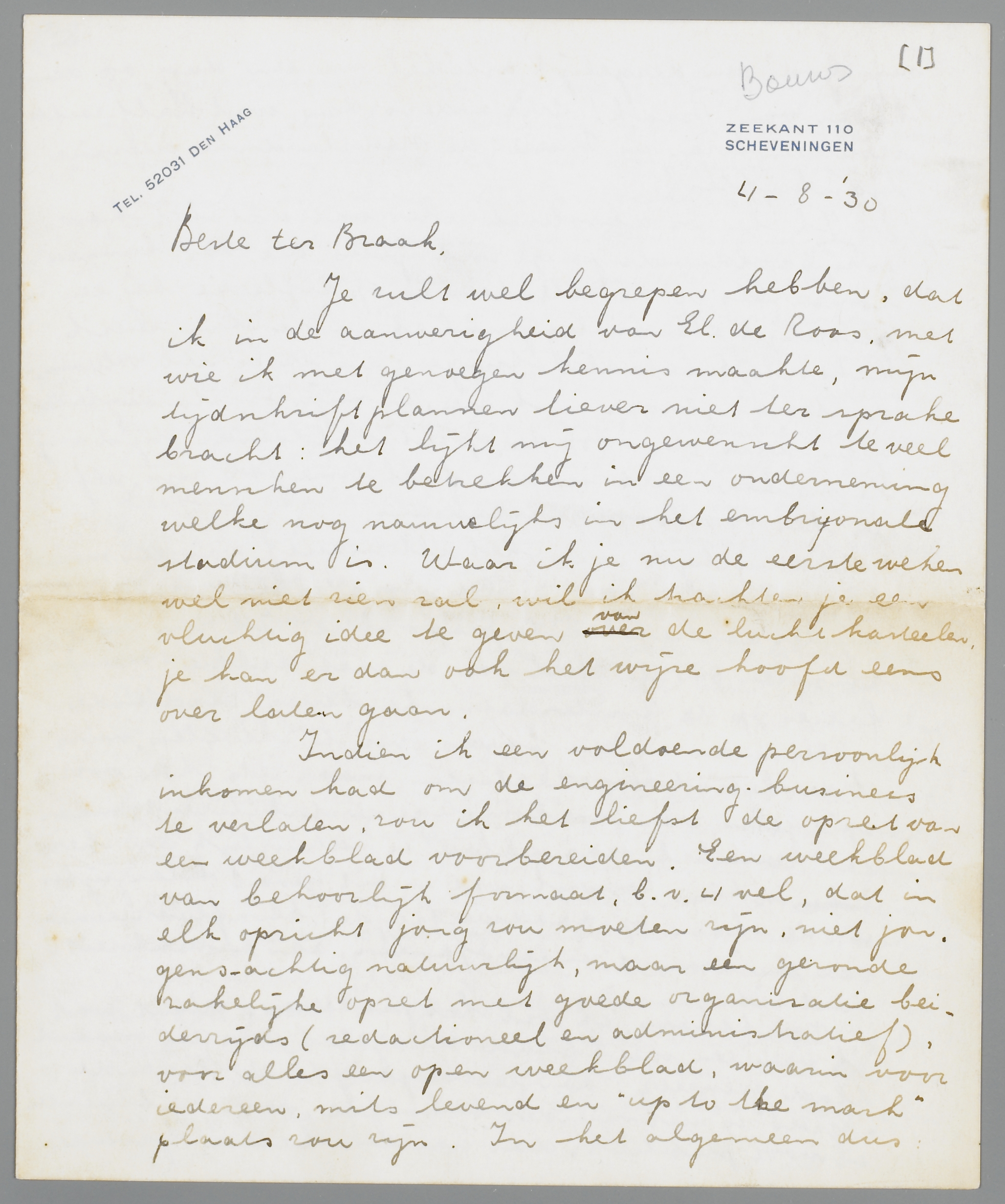 Je zult wel begrepen hebben, dat ik in de aanwezigheid van El. de Roos, met wie ik met genoegen kennis maakte, mijn tijdschriftplannen liever niet ter sprake bracht: het lijkt mij ongewenscht te veel menschen te betrekken in een onderneming welke nog nauwelijks in het embryonale stadium is. Waar ik je nu de eerste weken wel niet zien zal, wil ik trachten je een vluchtig idee te geven van de luchtkasteelen, je kan er dan ook het wijze hoofd eens over laten gaan.