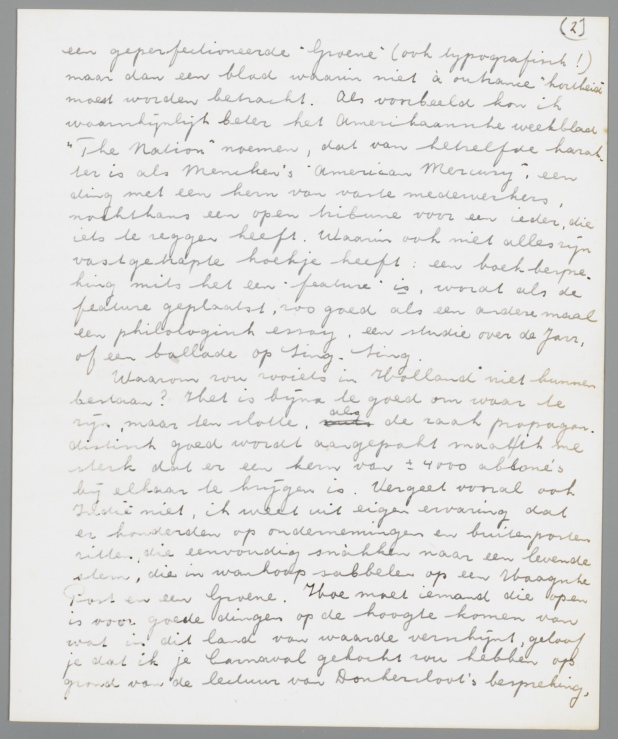 Indien ik een voldoende persoonlijk inkomen had om de engineering business te verlaten, zou ik het liefst de opzet van een weekblad voorbereiden. Een weekblad van behoorlijk formaat, b.v. 4 vel, dat in elk opzicht jong zou moeten zijn, niet jongens-achtig natuurlijk, maar een gezonde zakelijke opzet met goede organisatie beiderzijds (redactioneel en administratief), voor alles een open weekblad, waarin voor iedereen, mits levend en ‘up to the mark’ plaats zou zijn. In het algemeen dus een geperfectioneerde ‘Groene’ (ook typografisch!) maar dan een blad waarin niet à outrance ‘hardheid’ moest worden betracht. Als voorbeeld kon ik waarschijnlijk beter het Amerikaansche weekblad ‘The Nation’ noemen, dat van hetzelfde karakter is als Mencken's ‘American Mercury’, een ding met een kern van vaste medewerkers, nochthans een open tribune voor een ieder, die iets te zeggen heeft. Waarin ook niet alles zijn vastgetrapte hoekje heeft: een boekbespreking mits het een ‘feature’ is, wordt als de feature geplaatst, zoo goed als een andere maal een philologisch essay, een studie over de Jazz, of een ballade op Sing-Sing.