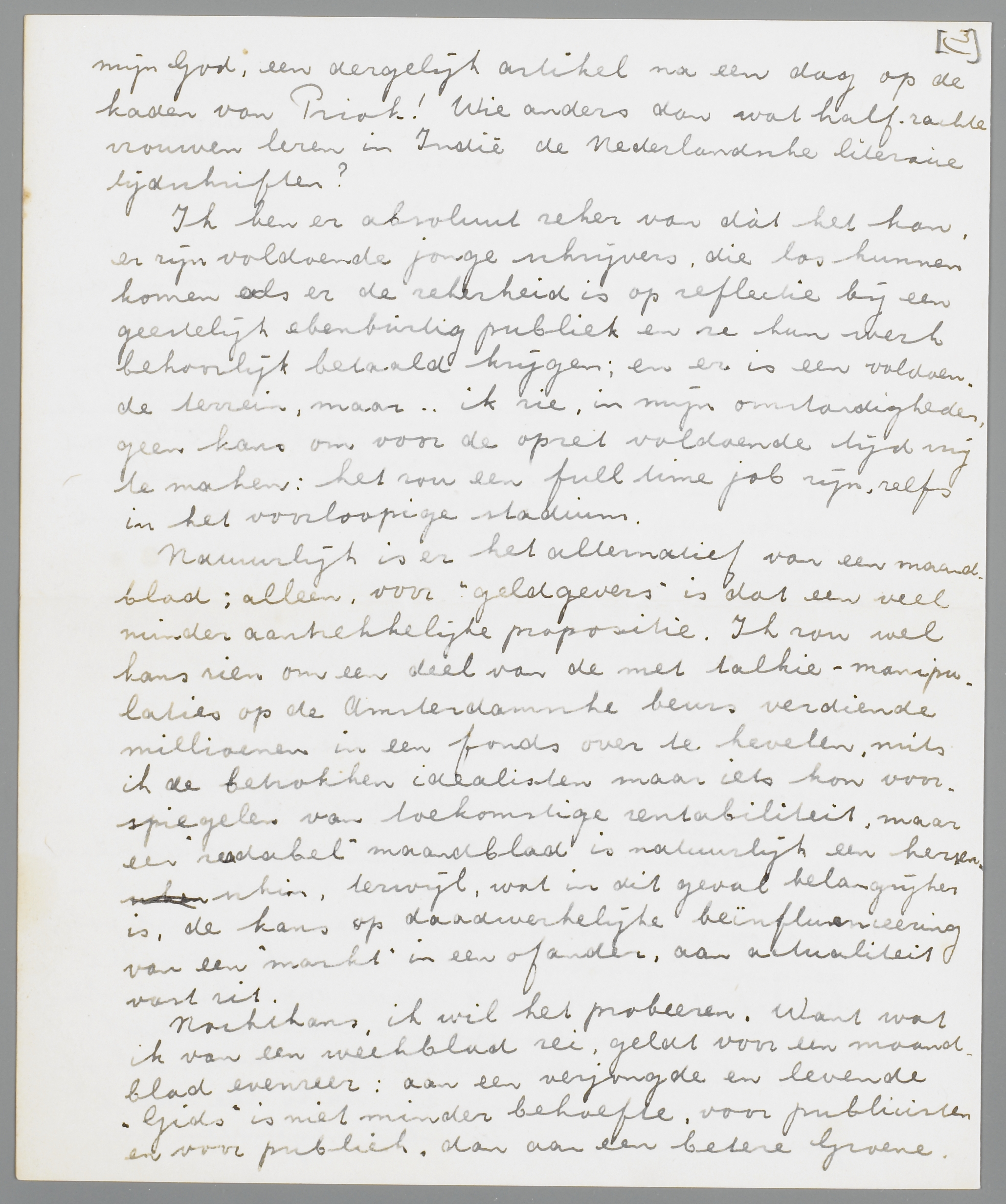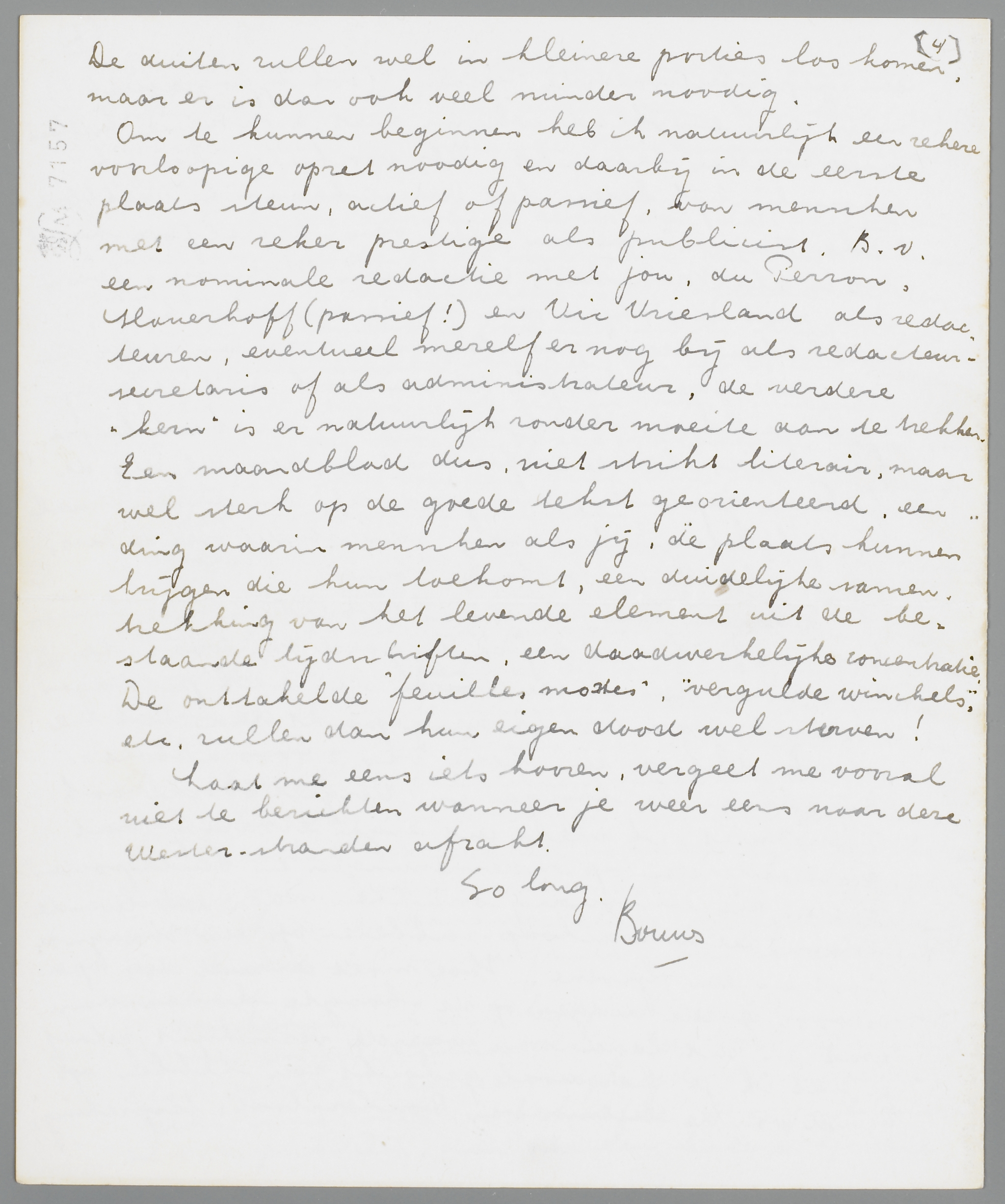 Om te kunnen beginnen heb ik natuurlijk een zekere voorloopige opzet noodig en daarbij in de eerste plaats steun, actief of passief, van menschen met een zeker prestige als publicist. B.v. een nominale redactie met jou, Du Perron, Slauerhoff (passief!) en Vic Vriesland als redacteuren, eventueel mezelf er nog bij als redacteur-secretaris of als administrateur, de verdere ‘kern’ is er natuurlijk zonder moeite aan te trekken. Een maandblad dus, niet strikt literair, maar wel sterk op goede tekst georienteerd, een ding waarin menschen als jij, de plaats kunnen krijgen die hun toekomt, een duidelijke samentrekking van het levende element uit de bestaande tijdschriften, een daadwerkelijke concentratie. De onttakelde ‘[feuilles mortes]’, ‘vergulde winckels’, etc. zullen dan hun eigen dood wel sterven!