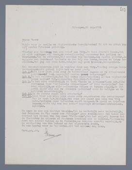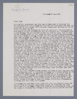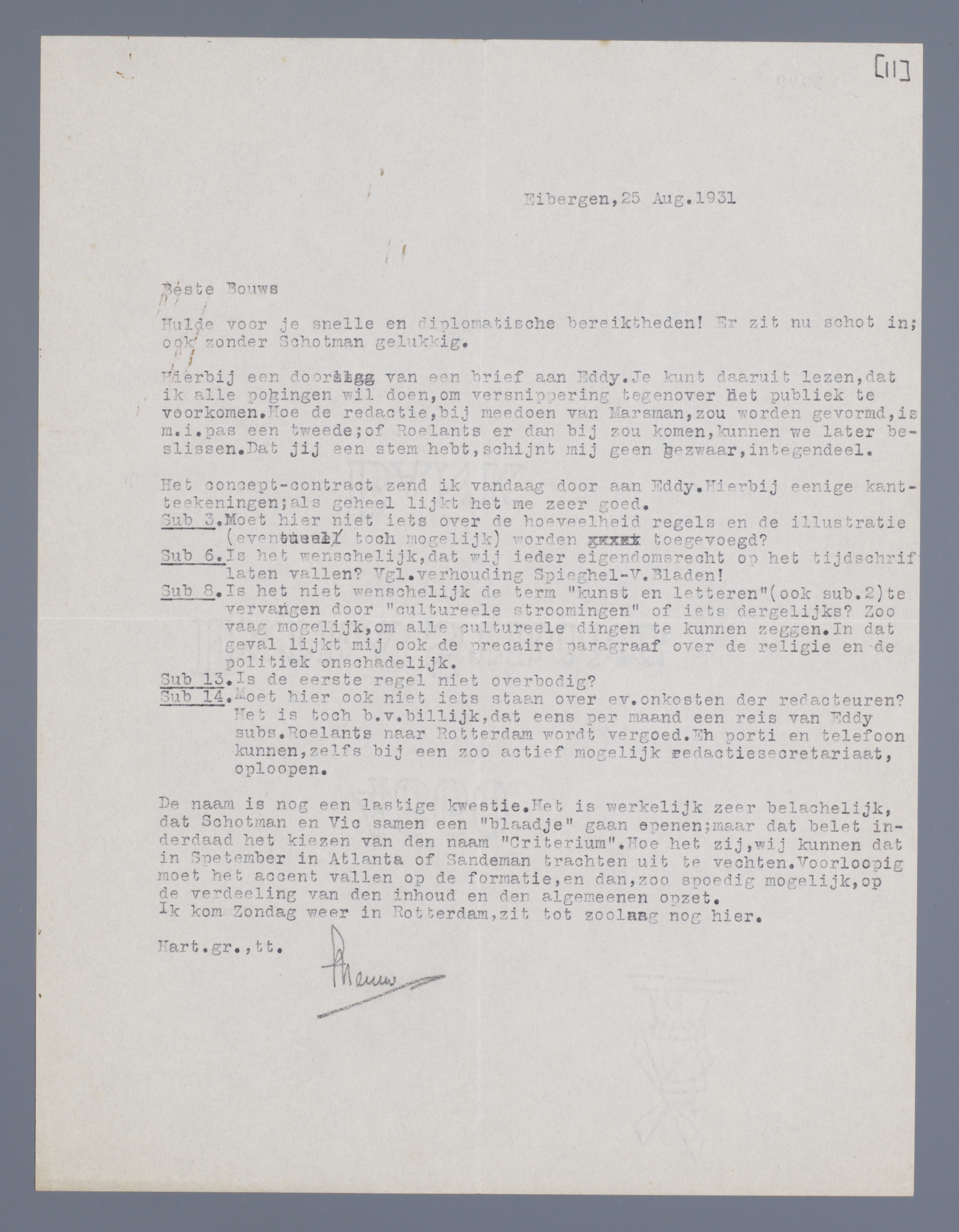 De naam is nog een lastige kwestie. Het is werkelijk zeer belachelijk, dat Schotman en Vic samen een ‘blaadje’ gaan openen; maar dat belet inderdaad het kiezen van den naam ‘Criterium’. Hoe het ook zij, wij kunnen dat in September in Atlanta of Sandeman trachten uit te vechten. Voorloopig moet het accent vallen op de formatie, en dan, zoo spoedig mogelijk, op de verdeeling van den inhoud en den algemeenen opzet.
