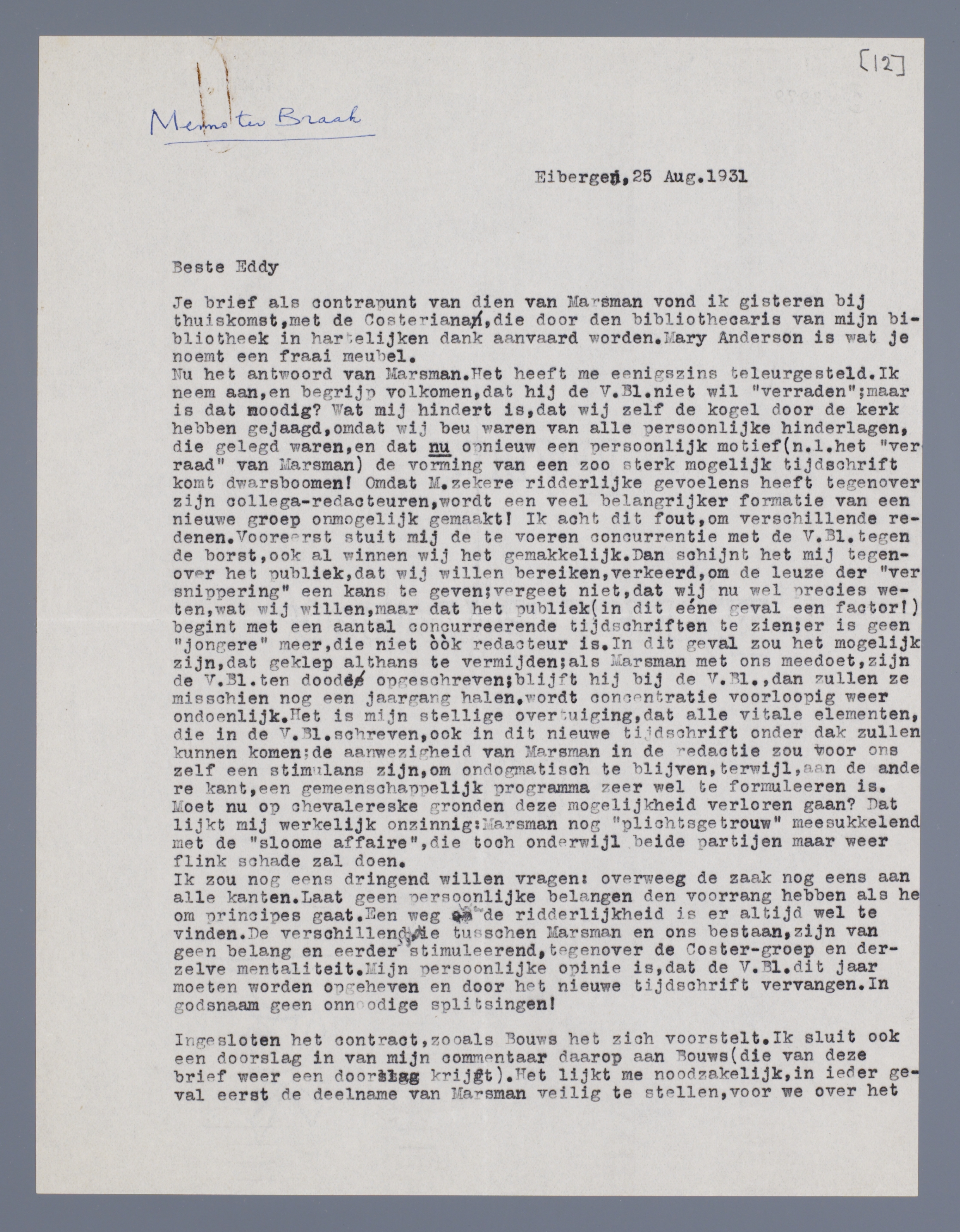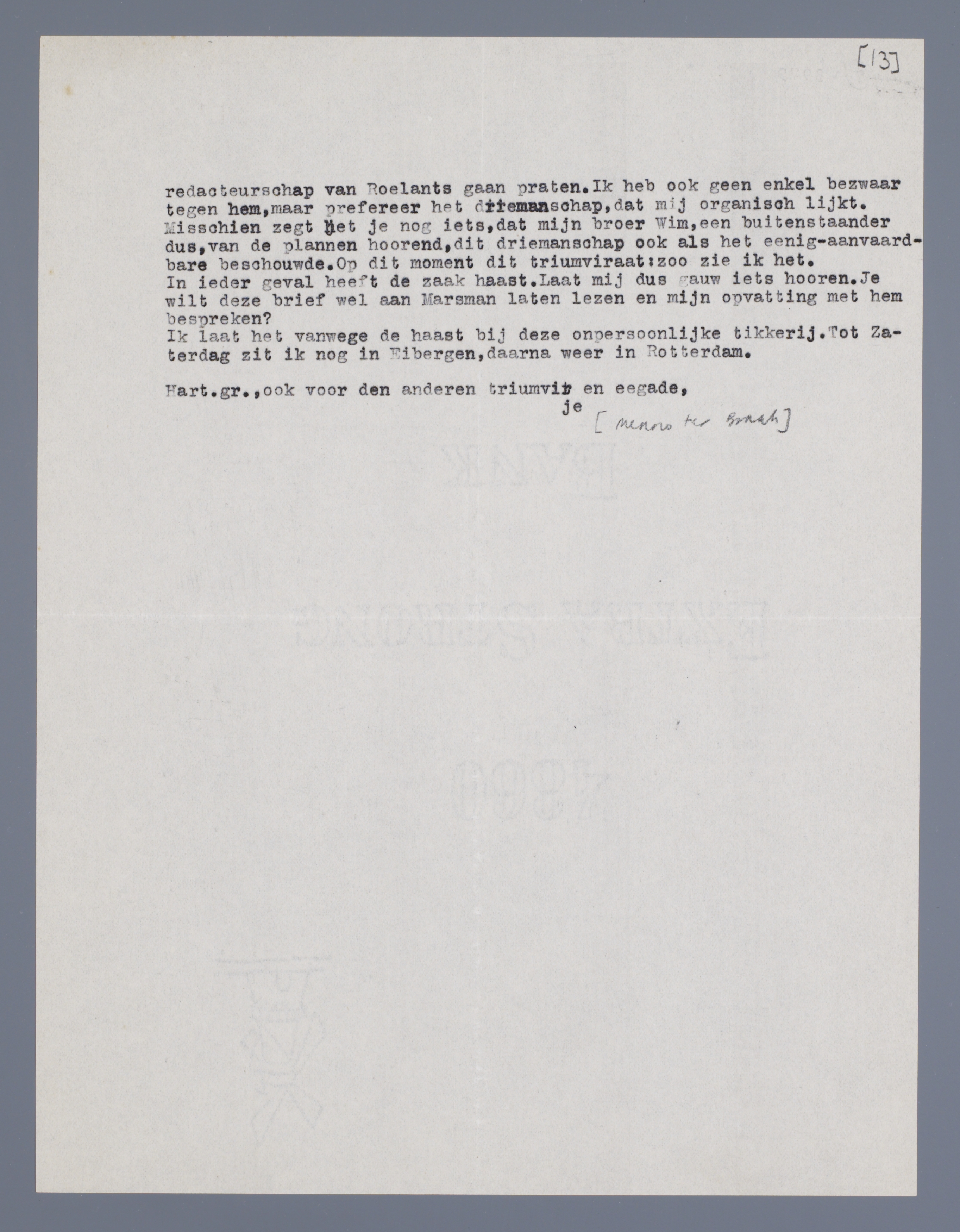 Hierbij een doorslag van een brief aan Eddy. Je kunt daaruit lezen, dat ik alle pogingen wil doen, om versnippering tegenover het publiek te voorkomen. Hoe de redactie, bij meedoen van Marsman, zou worden gevormd, is m.i. pas een tweede; of Roelants er dan bij zou komen, kunnen we later beslissen. Dat jij een stem hebt, lijkt mij geen bezwaar, integendeel.