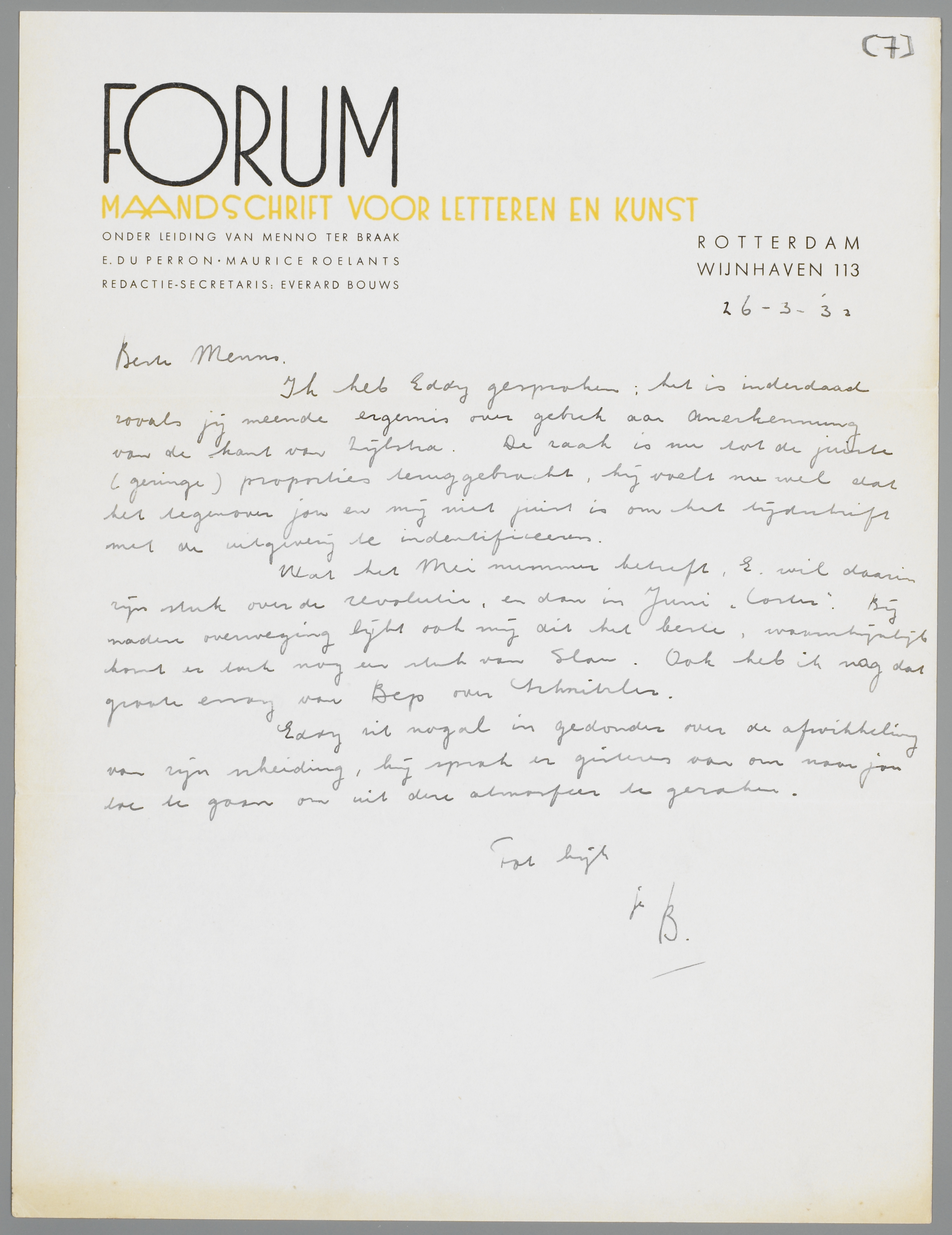 Ik heb Eddy gesproken: het is inderdaad zooals jij meende ergernis over gebrek aan Anerkennung van de kant van Zijlstra. De zaak is nu tot de juiste (geringe) proporties teruggebracht, hij voelt nu wel dat het tegenover jou en mij niet juist is om het tijdschrift met de uitgeverij te identificeeren.