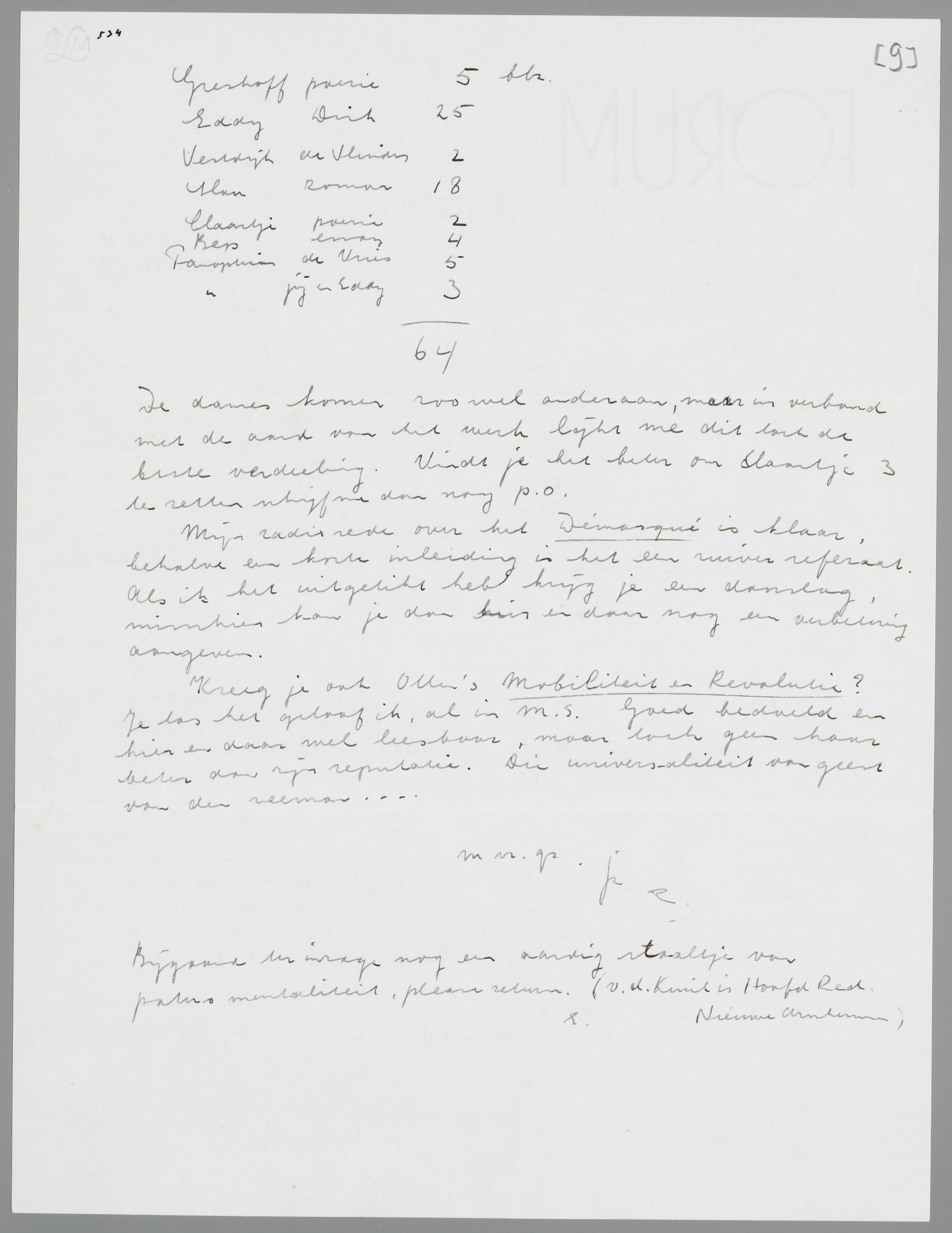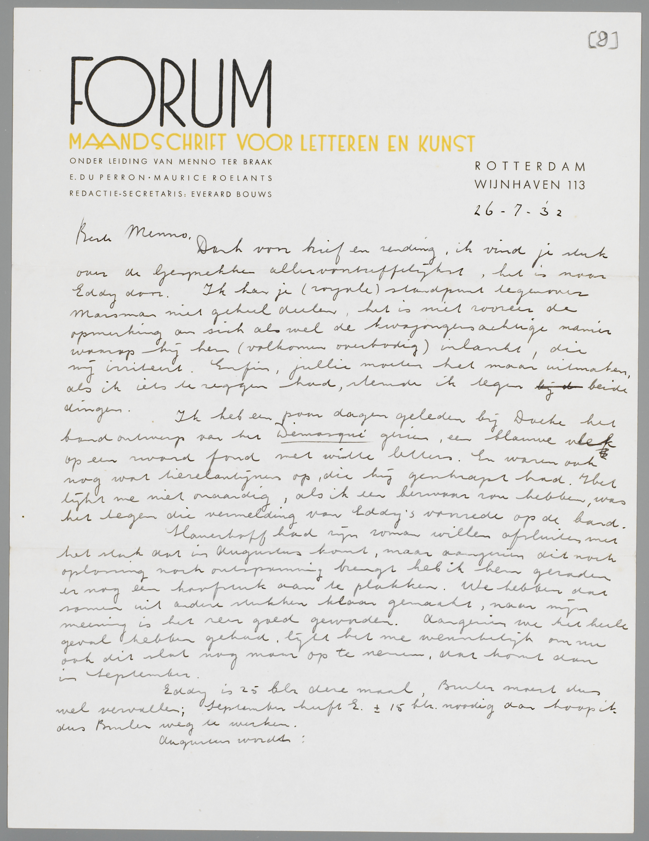 Dank voor brief en zending, ik vind je stuk over de Gesprekken allervoortreffelijkst, het is naar Eddy door. Ik kan je (royale) standpunt tegenover Marsman niet geheel deelen, het is niet zoozeer de opmerking an sich als wel de kwajongensachtige manier waarop hij hem (volkomen overbodig) [inlascht], die mij irriteert. Enfin, jullie moeten het maar uitmaken, als ik iets te zeggen had, stemde ik tegen beide dingen.