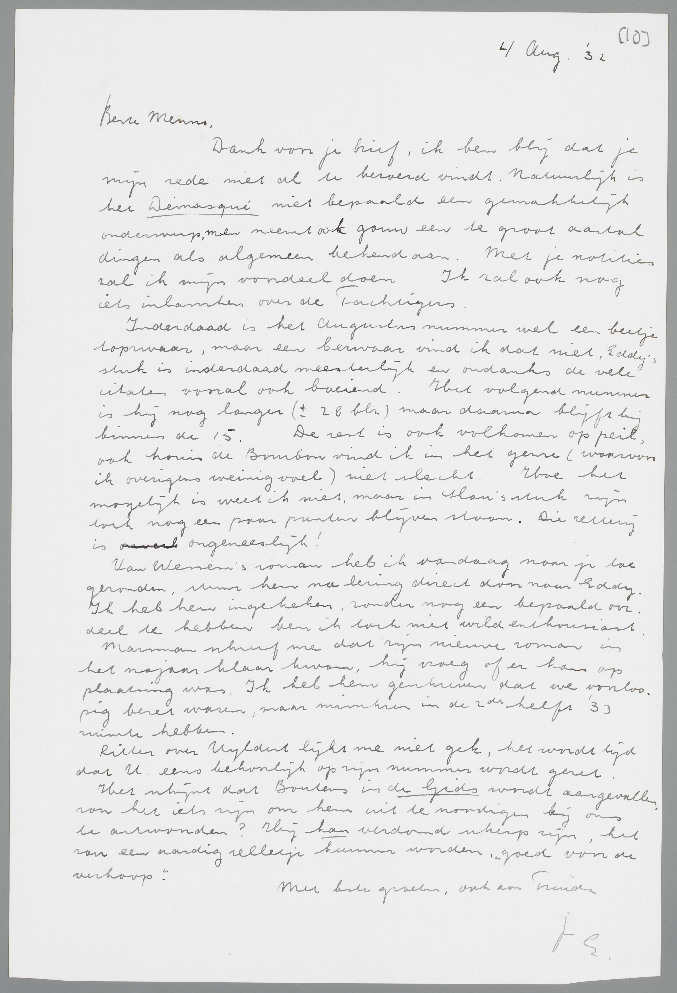 Marsman schreef me dat zijn nieuwe roman in het najaar klaar kwam, hij vroeg of er kans op plaatsing was. Ik heb hem geschreven dat we voorloopig bezet waren, maar misschien in de 2de helft '33 ruimte hebben.
