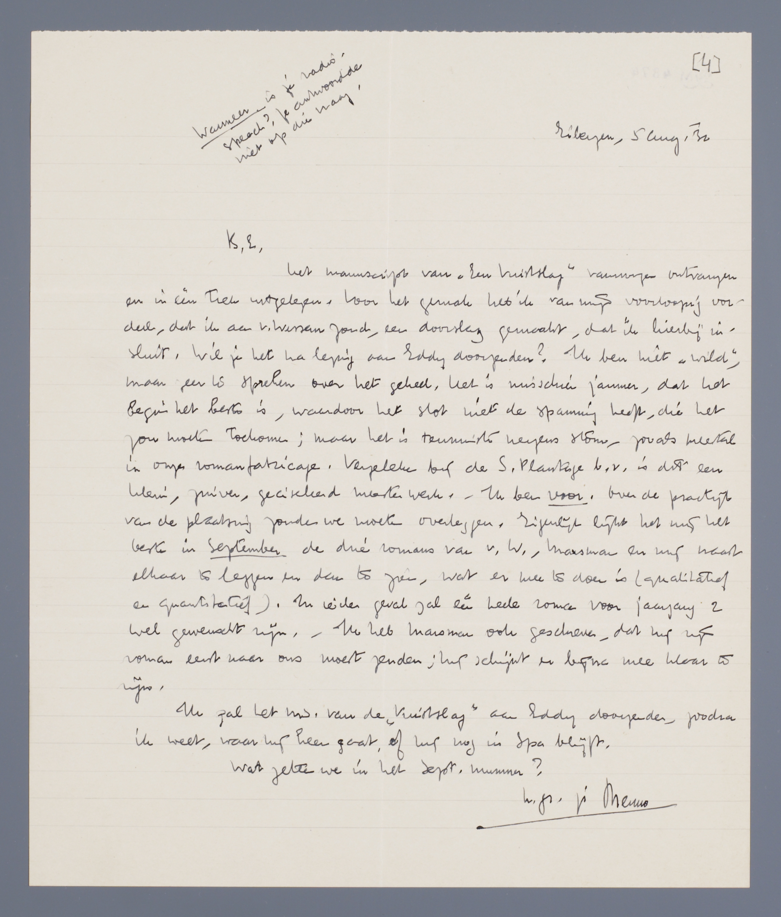 het manuscript van ‘Een Vuistslag’ vanmorgen ontvangen en in één trek uitgelezen, voor het gemak heb ik van mijn voorloopig oordeel, dat ik aan v. Wessem zond, een doorslag gemaakt, dat ik hierbij insluit. Wil je het na lezing aan Eddy doorzenden? Ik ben niet ‘wild’, maar zeer te spreken over het geheel, het is misschien jammer, dat het begin het beste is, waardoor het slot niet de spanning heeft, die het zou moeten toekomen; maar het is tenminste nergens stom, zoals meestal in onze romanfabricage. Vergeleken bij de S. Plantage b.v. is dit een klein, zuiver, geciseleerd meesterwerk. Ik ben voor, over de practijk van de plaatsing zouden we moeten overleggen. Eigenlijk lijkt het mij het beste in September de drie romans van v.W., Marsman en mij naast elkaar te leggen en dan te zien, wat er mee te doen is (qualitatief en quantitatief). In ieder geval zal één heele roman voor jaargang 2 wel gewenscht zijn. Ik heb Marsman ook geschreven, dat hij zijn roman eerst naar ons moest zenden; hij schijnt er bijna mee klaar te zijn.