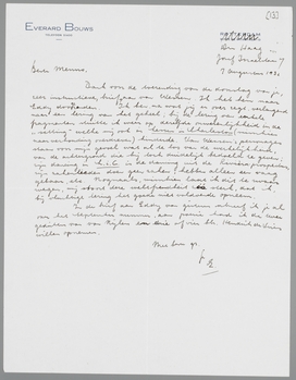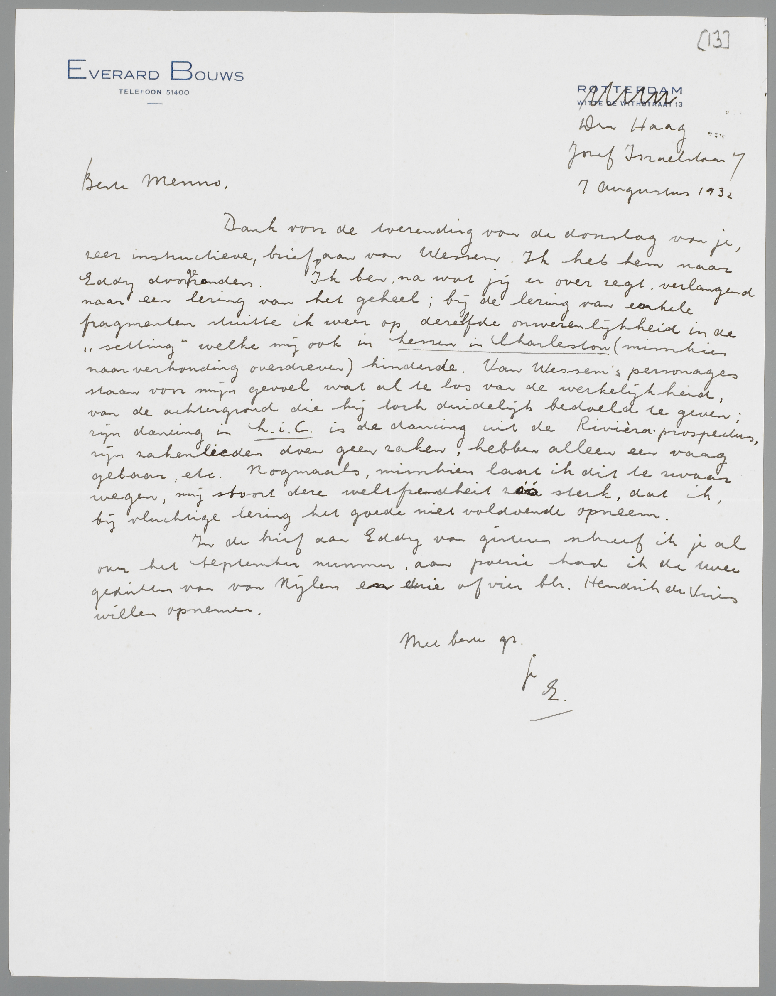 Dank voor de toezending van de doorslag van je, zeer instructieve, brief aan van Wessem. Ik heb hem naar Eddy doorgezonden. Ik ben, na wat jij er over zegt, verlangend naar een lezing van het geheel; bij de lezing van enkele fragmenten stuitte ik weer op dezelfde onwezenlijkheid in de ‘setting’ welke mij ook in Lessen in Charleston (misschien naar verhouding overdreven) hinderde. Van Wessem's personages staan voor mijn gevoel wat al te los van de werkelijkheid, van de achtergrond die hij toch duidelijk bedoeld te geven; zijn dancing in L.I.C. is de dancing uit de Rivièra-prospectus, zijn zakenlieden doen geen zaken, hebben alleen een vaag gebaar etc. Nogmaals, misschien laat ik dit te zwaar wegen, mij stoort deze weltfremdheit zóó sterk, dat ik, bij vluchtige lezing het goede niet voldoende opneem.