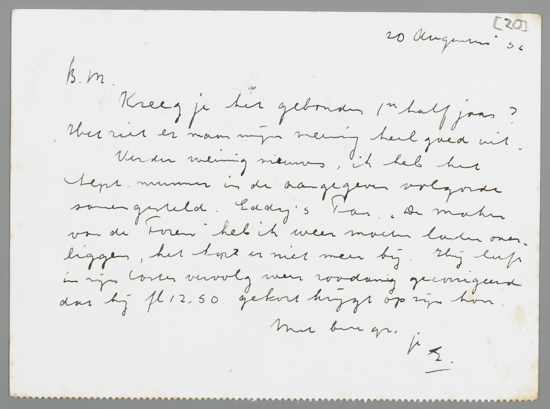 Verder weinig nieuws, ik heb het Sept. nummer in de aangegeven volgorde samengesteld. Eddy's Pan. ‘De maker van de Toren’ heb ik weer moeten laten overliggen, het [kon] er niet meer bij. Hij heeft in zijn Coster vervolg weer zoodanig gecorrigeerd dat hij fl 12,50 gekort krijgt op zijn hon.