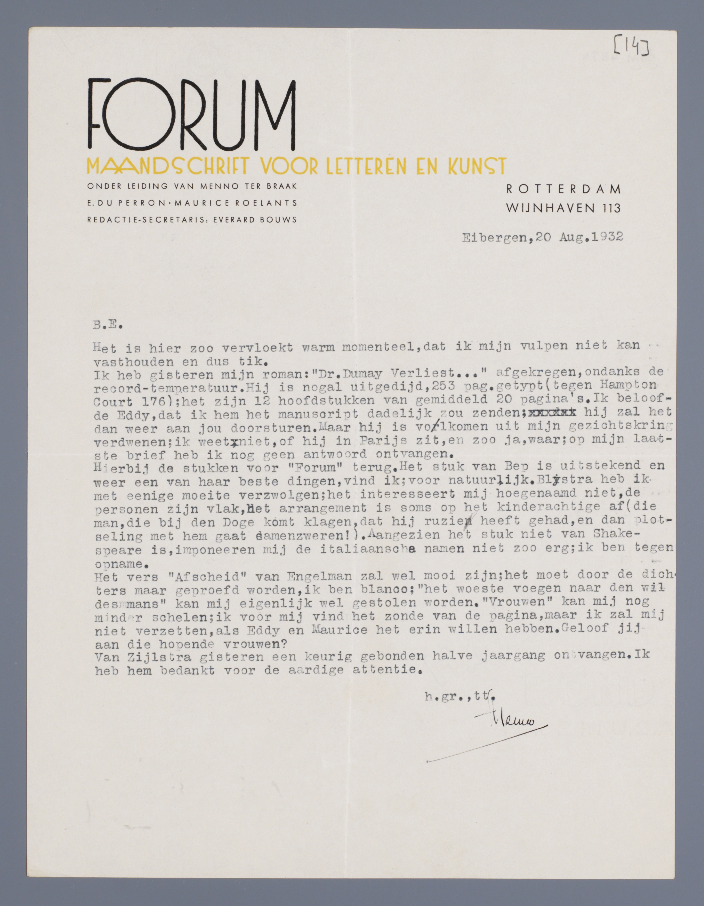 Hierbij de stukken voor ‘Forum’ terug. Het stuk van Bep is uitstekend en weer een van haar beste dingen, vind ik; voor natuurlijk. Blystra heb ik met eenige moeite verzwolgen; het interesseert mij hoegenaamd niet, de personen zijn vlak, het arrangement is soms op het kinderachtige af (die man, die bij den Doge komt klagen, dat hij ruzie heeft gehad, en dan plotseling met hem gaat samenzweren!). Aangezien het stuk niet van Shakespeare is, imponeeren mij de italiaansche namen niet zoo erg; ik ben tegen opname.