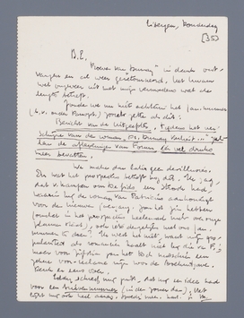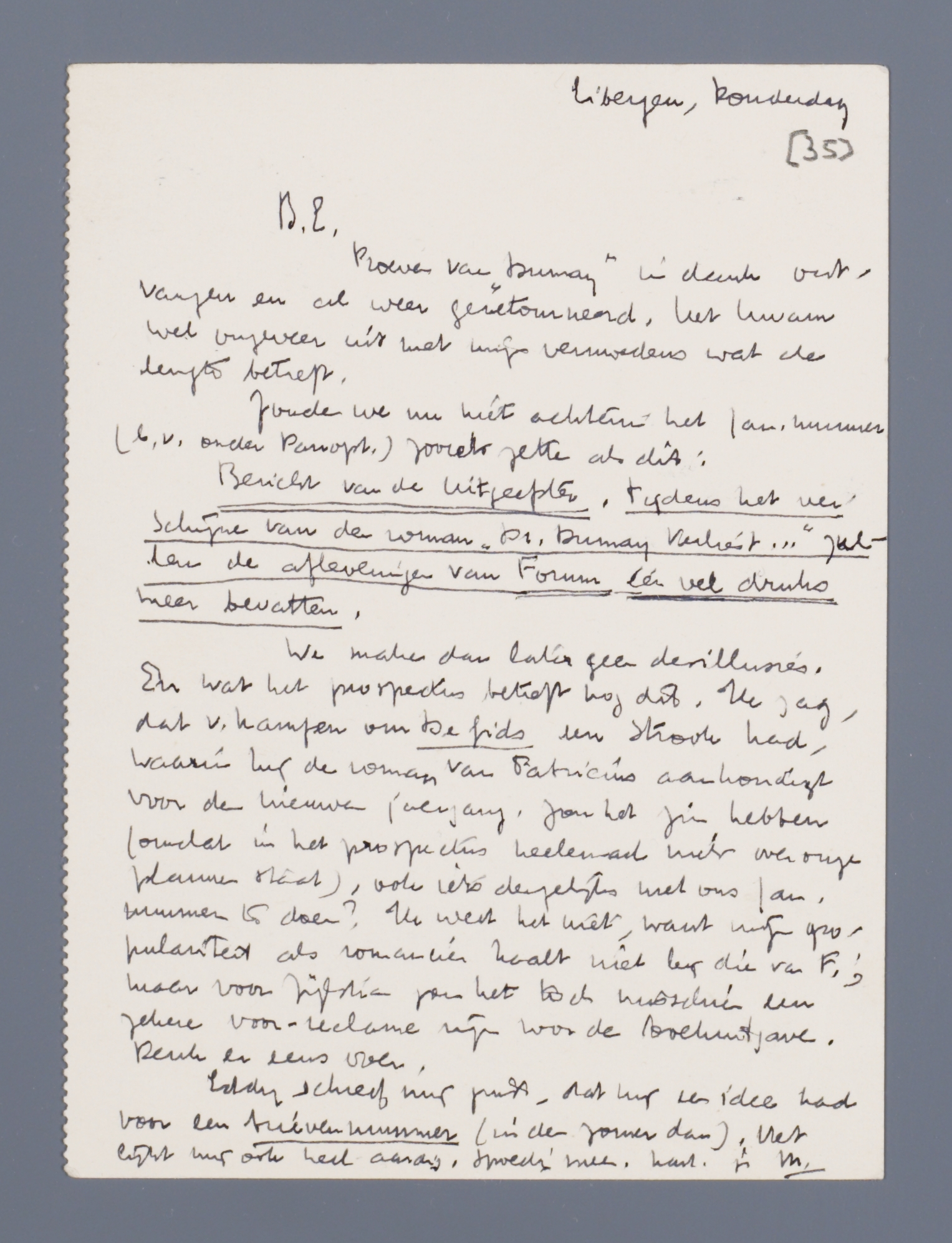 We maken dan later geen desillusies. En wat het prospectus betreft nog dit. Ik zag, dat v. Kampen van De Gids een strook had, waarin hij de roman van Fabricius aankondigt voor den nieuwen jaargang. Zou het zin hebben (omdat in het prospectus heelemaal niets over onze plannen staat), ook iets dergelijks met ons jan. nummer te doen? Ik [merk] het niet, want mijn populariteit als romancier haalt niet bij die van F., maar voor Zijlstra zou het toch misschien een zekere voor-reclame zijn voor de boekuitgave. Denk er eens over.