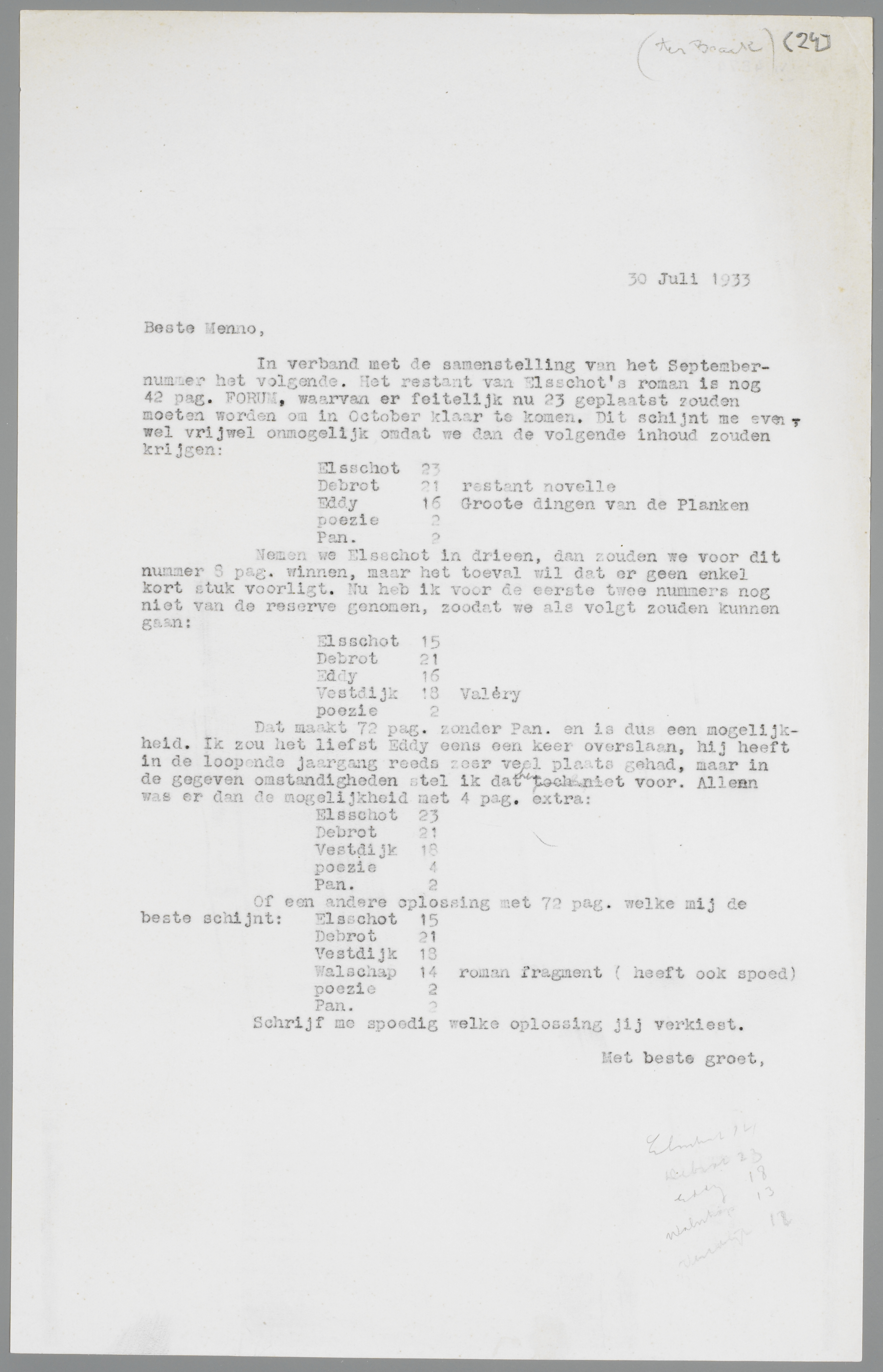 In verband met de samenstelling van het Septembernummer het volgende. Het restant van Elsschot's roman is nog 42 pag. FORUM, waarvan er feitelijk nu 23 geplaatst zouden moeten worden om in October klaar te komen. Dit schijnt me evenwel vrijwel onmogelijk omdat we dan de volgende inhoud zouden krijgen: