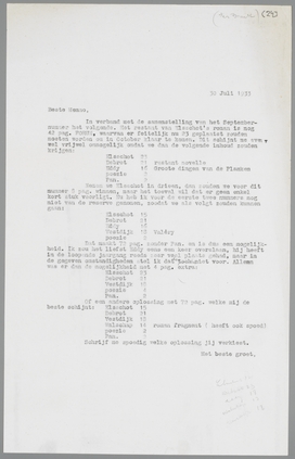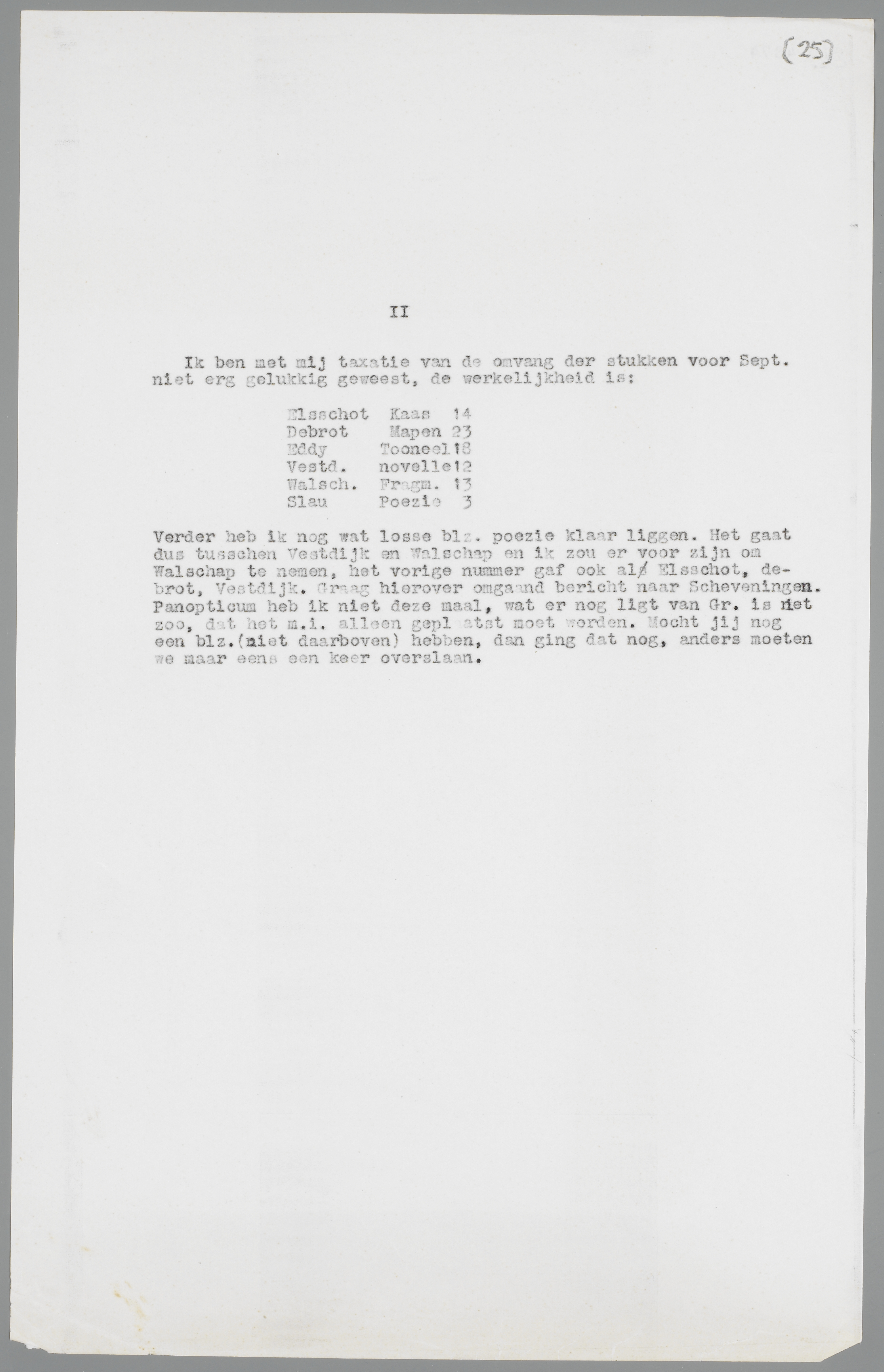 Verder heb ik nog wat losse blz. poezie klaar liggen. Het gaat dus tusschen Vestdijk en Walschap en ik zou er voor zijn om Walschap te nemen, het vorige nummer gaf ook al Elsschot, Debrot, Vestdijk. Graag hierover omgaand bericht naar Scheveningen. Panopticum heb ik niet deze maal, wat er nog ligt van Gr. is niet zoo, dat het m.i. alleen geplaatst moet worden. Mocht jij nog een blz. (niet daarboven) hebben, dan ging dat nog, anders moeten we maar eens een keer overslaan.