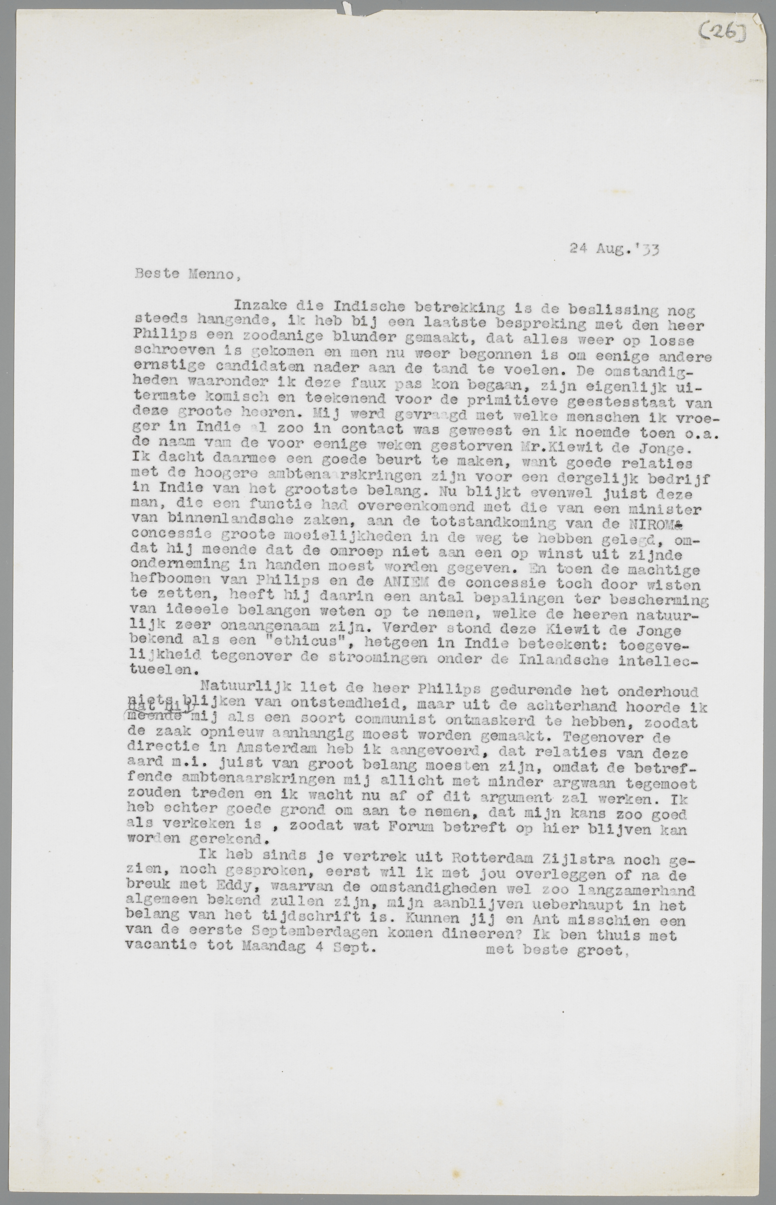 Natuurlijk liet de heer Philips gedurende het onderhoud niets blijken van ontstemdheid, maar uit de achterhand hoorde ik dat hij meende mij als een soort communist ontmaskerd te hebben, zoodat de zaak opnieuw aanhangig moest worden gemaakt. Tegenover de directie in Amsterdam heb ik aangevoerd, dat relaties van deze aard m.i. juist van groot belang moesten zijn, omdat de betreffende ambtenaarskringen mij wellicht met minder argwaan tegemoet zouden treden en ik wacht nu af of dit argument zal werken. Ik heb echter goede grond om aan te nemen, dat mijn kans zoo goed als verkeken is, zoodat wat Forum betreft op hier blijven kan worden gerekend.