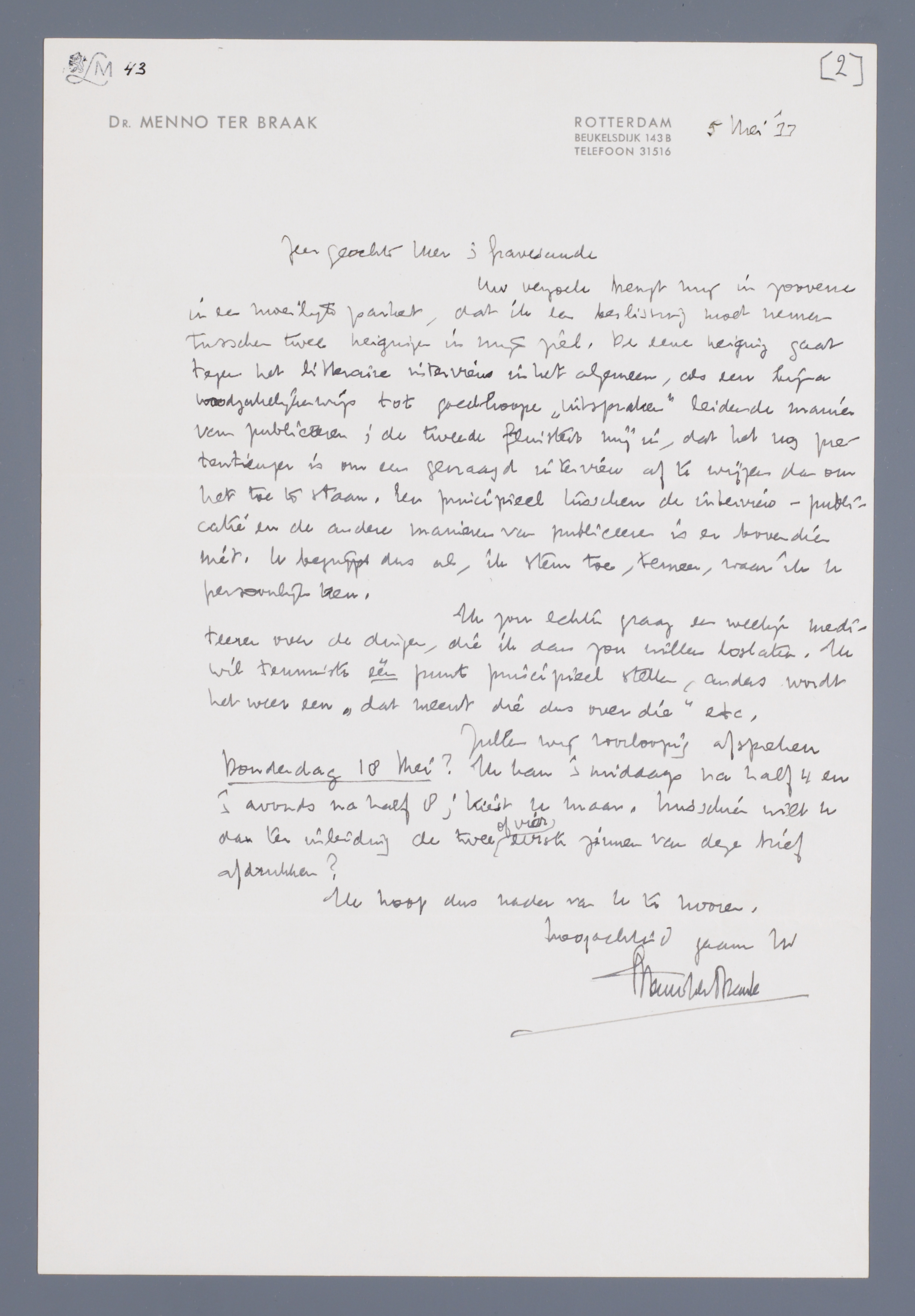 Zullen wij voorloopig afspreken Donderdag 18 mei? Ik kan 's middags na half 4 en 's avonds na half 8; Kiest u maar. Misschien wilt u dan ter inleiding de twee of vier eerste zinnen van deze brief afdrukken?