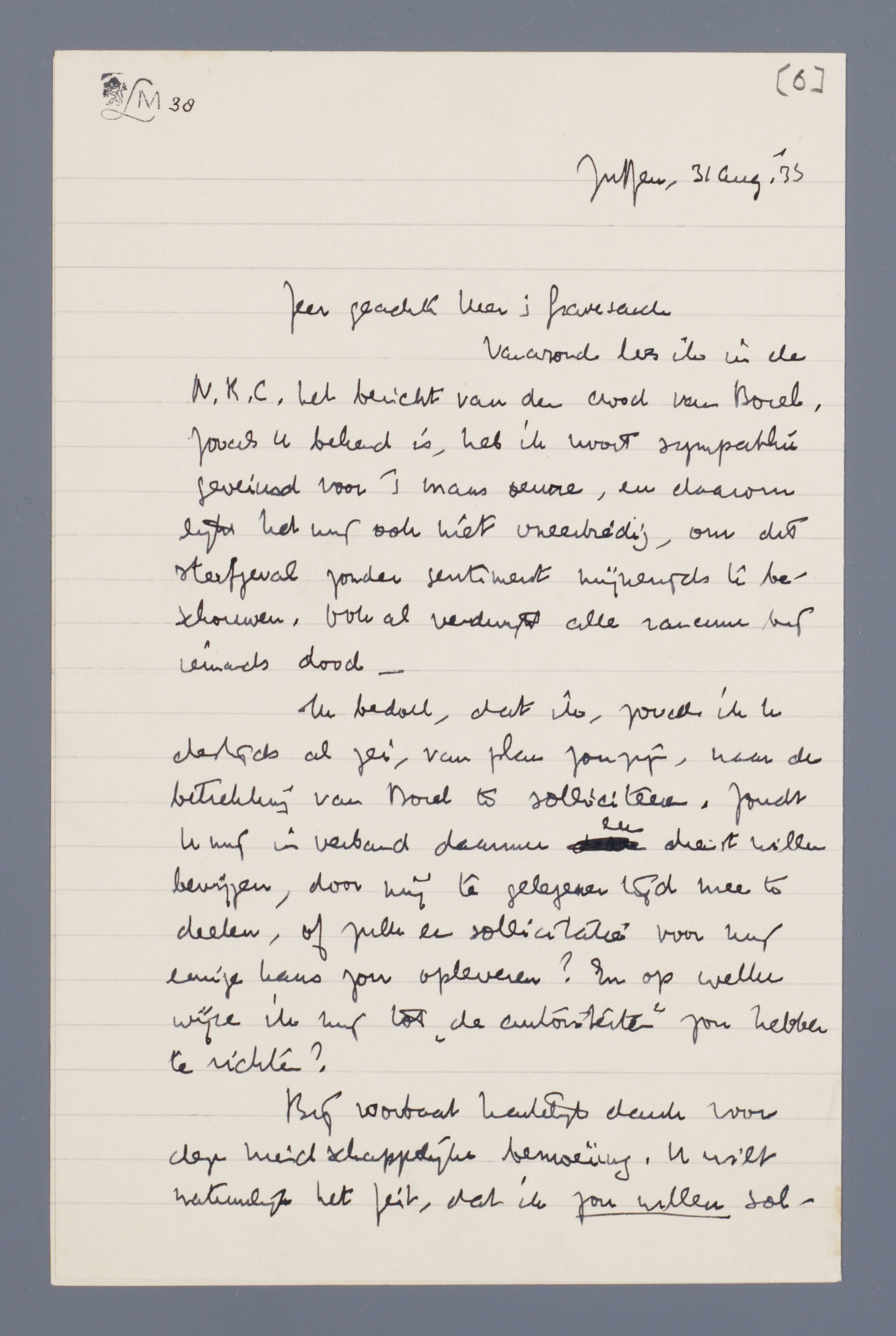 Vanavond lees ik in de N.R.C. het bericht van den dood van Borel. Zooals U bekend is, heb ik nooit sympathie geveinsd voor 's mans oeuvre, en daarom lijkt het mij ook niet oneerbiedig, om dit sterfgeval zonder sentiment mijnerzijds te beschouwen. Ook al verdwijnt alle rancune bij iemands dood -