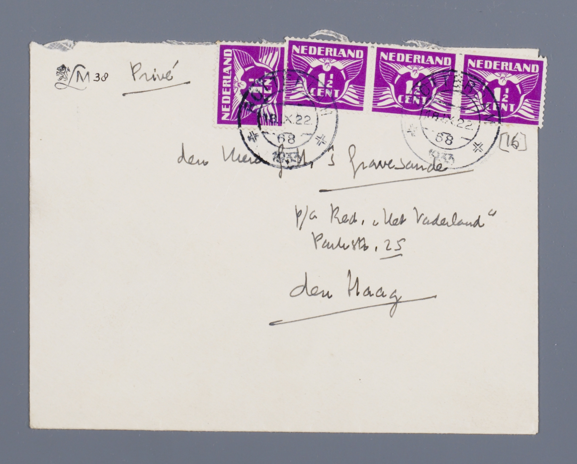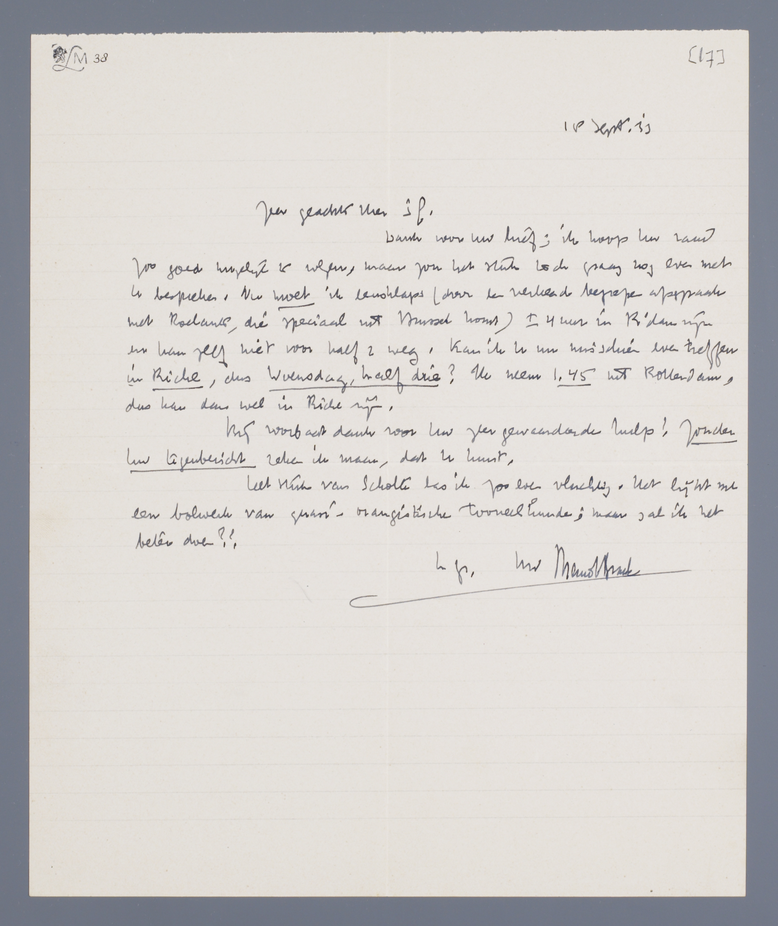Dank voor uw brief; ik hoop Uw raad zoo goed mogelijk te volgen, maar zou het stuk toch graag nog even met U bespreken. Nu moet ik eensklaps (door een verkeerd begrepen afspraak met Roelants, die speciaal uit Brussel komt) ± 4 uur in R'dam zijn en kan zelf niet voor half 2 weg. Kan ik u nu misschien even treffen in Riche, dus Woensdag, half drie? Ik neem 1.45 uit Rotterdam, dus kan dan wel in Riche zijn.