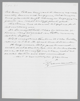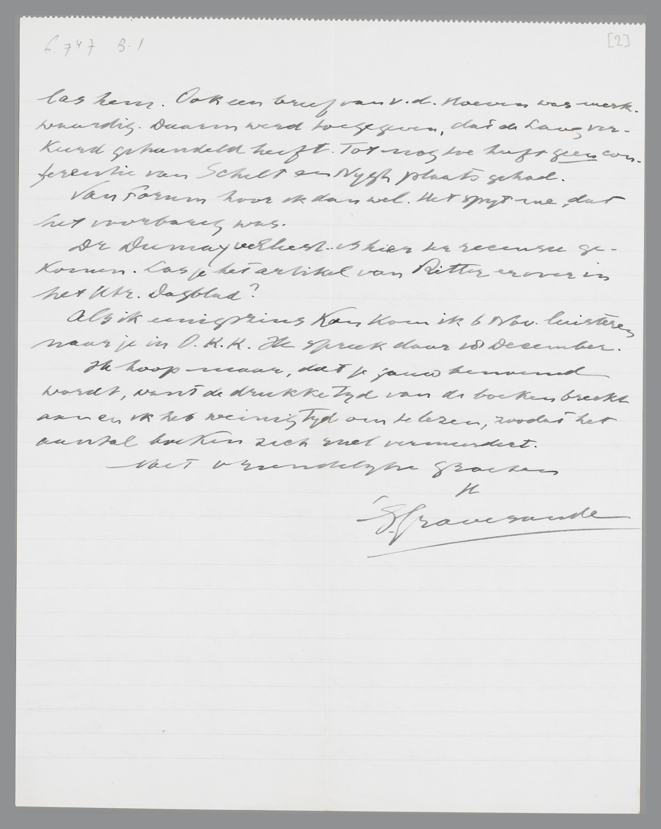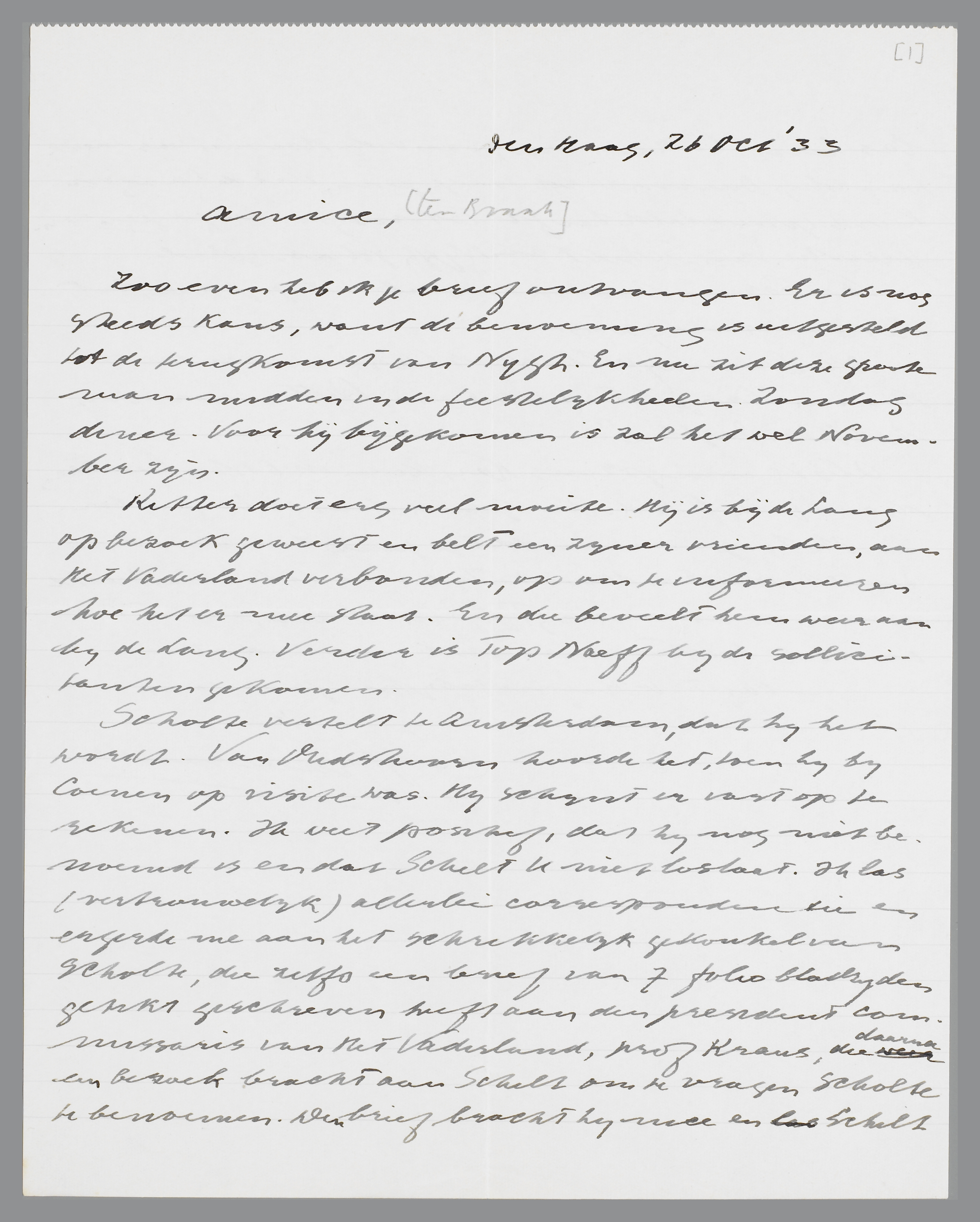 Zoo even heb ik je brief ontvangen. Er is nog steeds kans, want de benoeming is uitgesteld tot de terugkomst van Nijgh. En nu zit deze groote man midden in de feestelijkheden. Zondag [diner]. Voor hij bijgekomen is zal het wel November zijn.