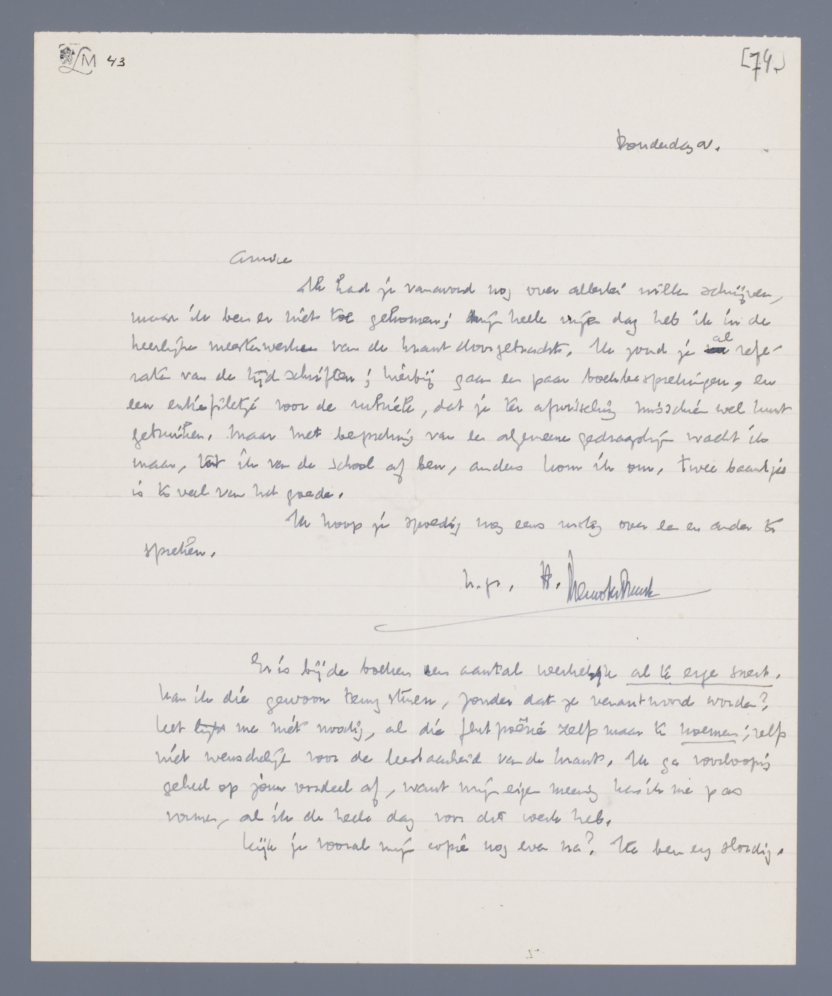 Ik had je vanavond nog over allerlei willen schrijven, maar ik ben er niet toe gekomen; mijn heele vrijen dag heb ik in de heerlijke meesterwerken van de krant doorgebracht. Ik zond je al referaten van de tijschriften; hierbij gaan een paar boekbesprekingen, en een entrefiletje voor de rubriek, dat je ter afwisseling misschien wel kunt gebruiken. Maar met bespreking van een algemeene gedragslijn wacht ik maar, tot ik van de school af ben, anders kom ik om, twee baantjes is te veel van het goede.