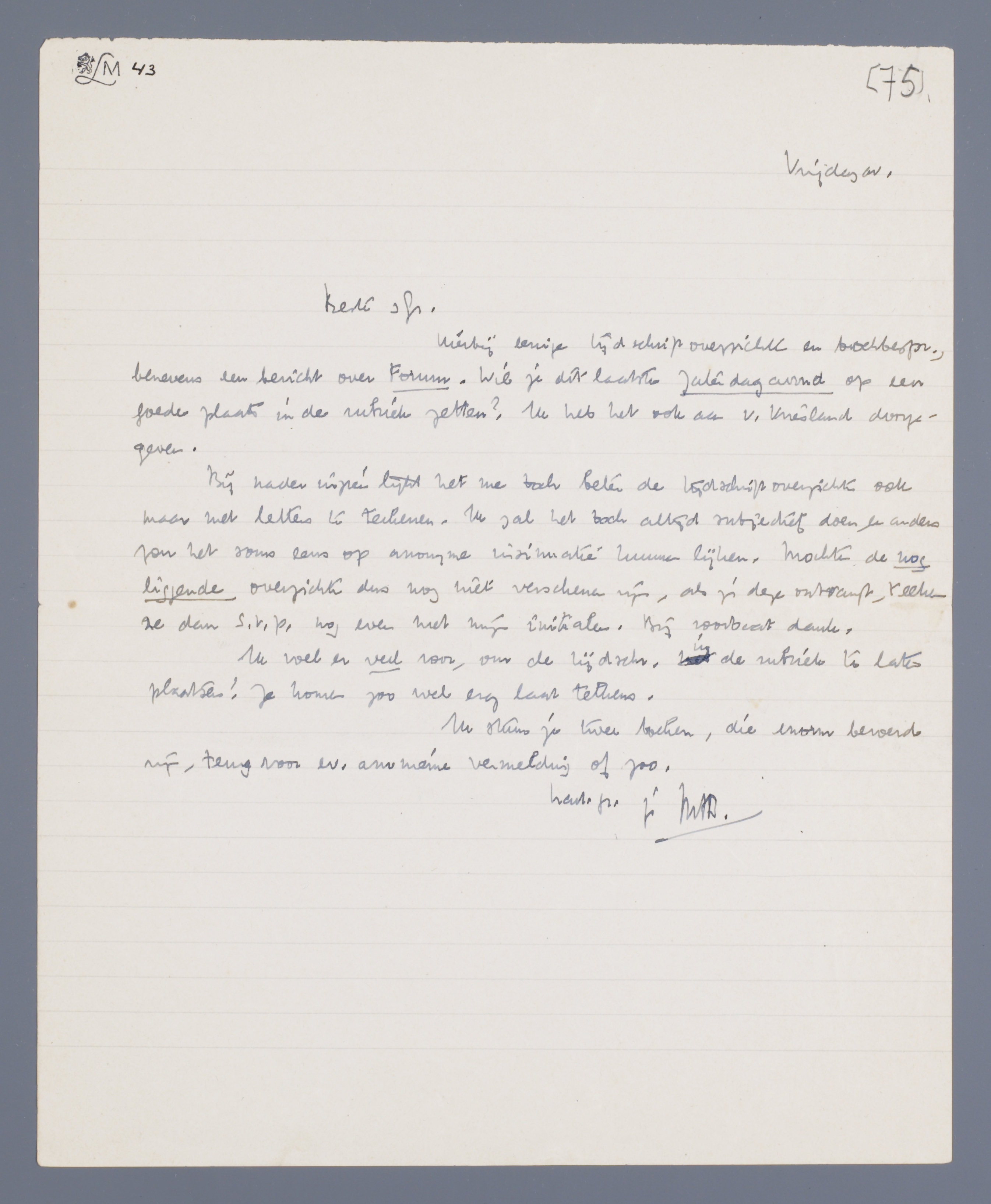 Hierbij eenige tijdschriftoverzichten en boekbespr. benevens een bericht over Forum. Wil jij dit laatste Zaterdagavond op een goede plaats in de rubriek zetten? Ik heb het ook aan v. Vriesland doorgegeven.