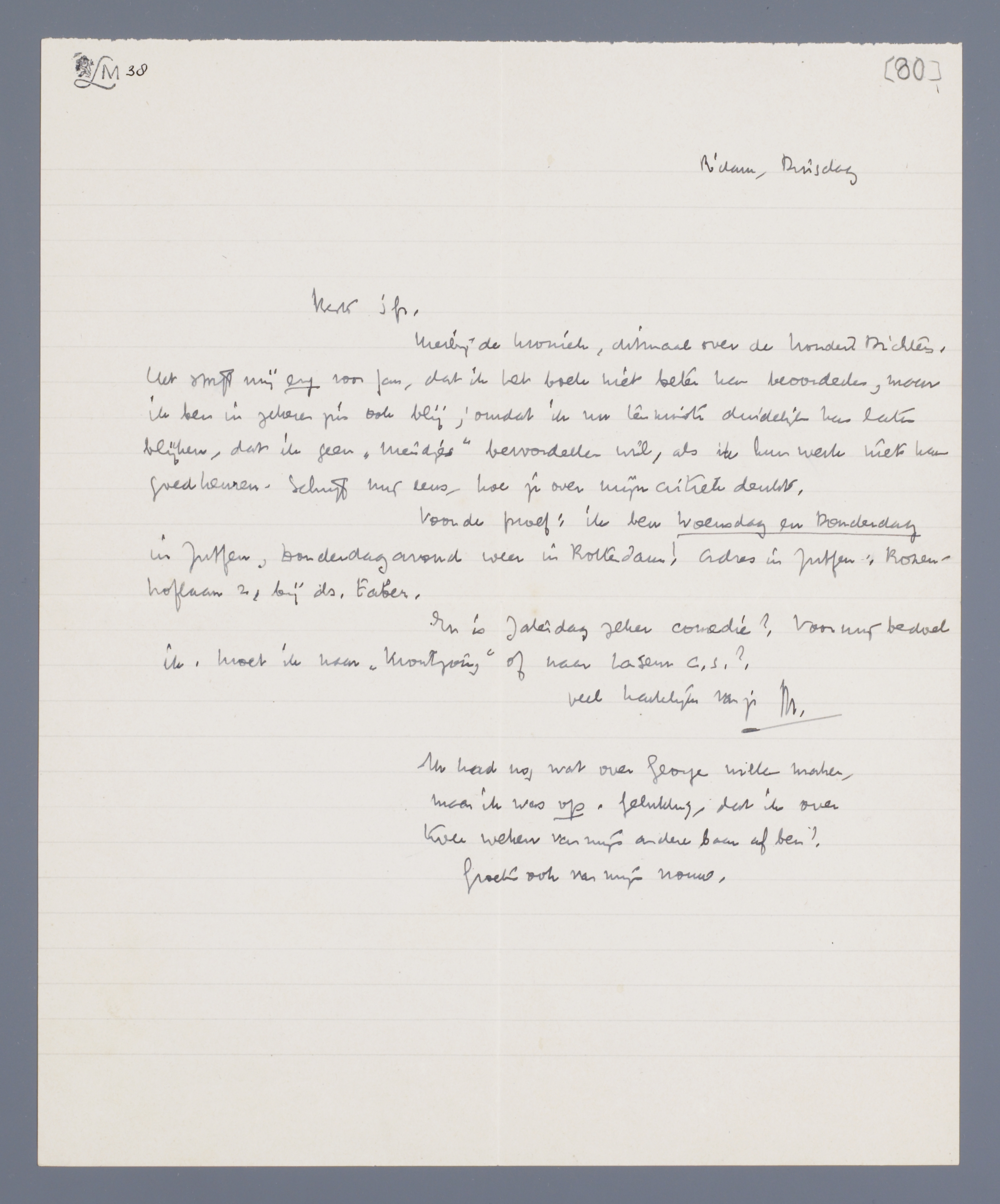 Hierbij de kroniek, ditmaal over de honderd dichters. Het spijt mij erg voor Jan, dat ik het boek niet beter kan beoordeelen, maar ik ben in zekeren zin ook blij; omdat ik nu tenminste duidelijk kan laten blijken, dat ik geen ‘vriendjes’ bevoordeelen wil, als ik hun werk niet kan goedkeuren. Schrijf mij eens, hoe je over mijn critiek denkt.