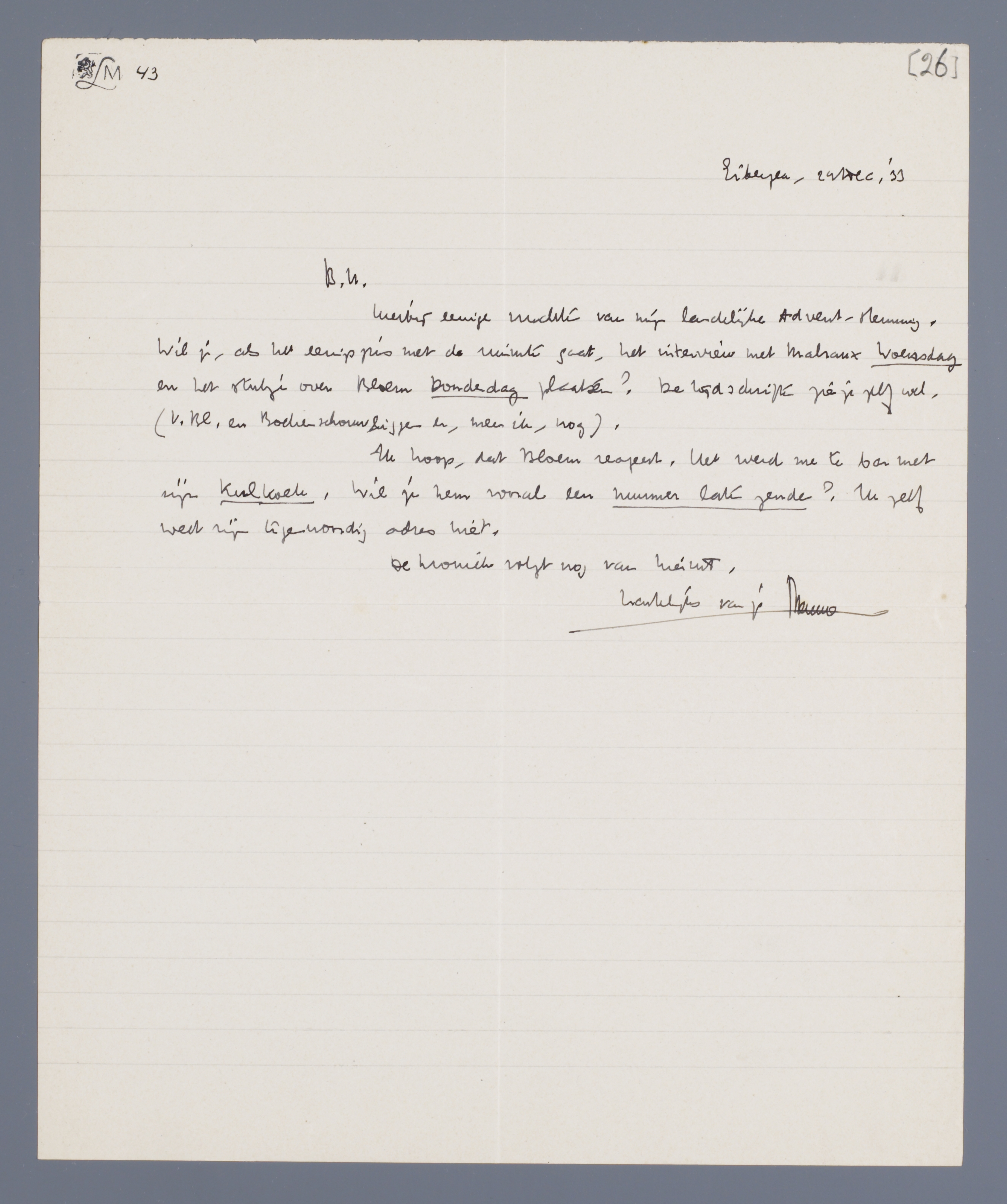 Hierbij eenige vruchten van mijn landelijke Advent-stemming. Wil je, als het eenigszins met de ruimte gaat, het interview met Malraux Woensdag en het stukje over Bloem Donderdag plaatsen? De tijdschriften zie je zelf wel, (V.Bl. en Boekenschouw liggen er, meen ik, nog).