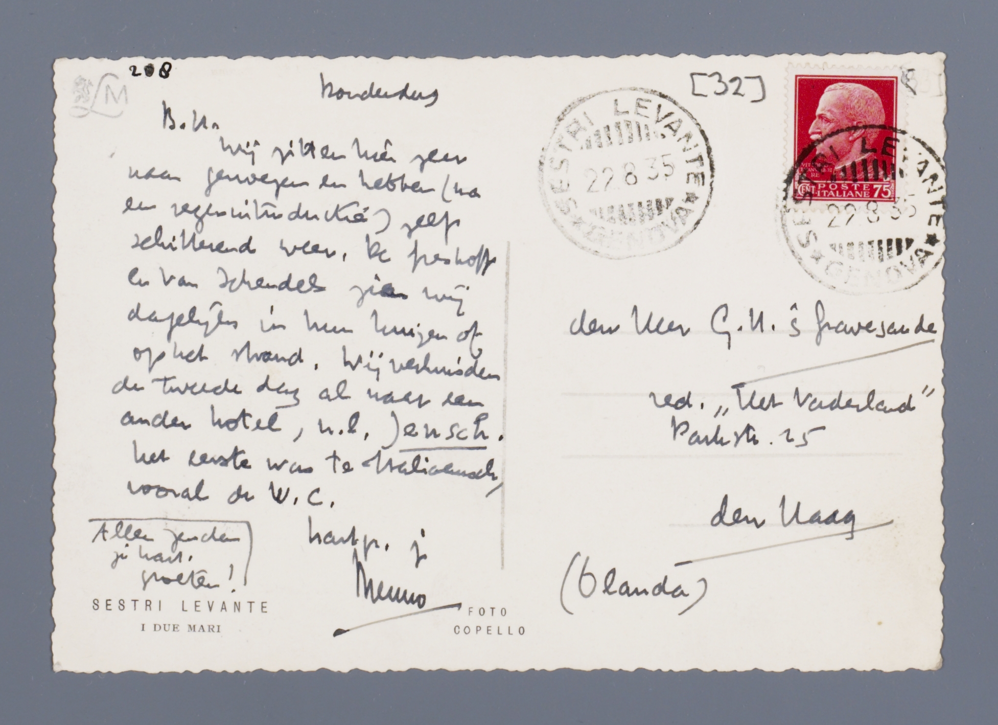 Wij zitten hier zeer naar genoegen en hebben (na een regenintroductie) zelfs schitterend weer. De Greshoffs en Van Schendels zien wij dagelijks in hun huisjes of op het strand. Wij verhuisden de tweede dag al naar een ander hotel, n.l. Jensch. Het eerste was te Italiaansch, vooral de W.C.