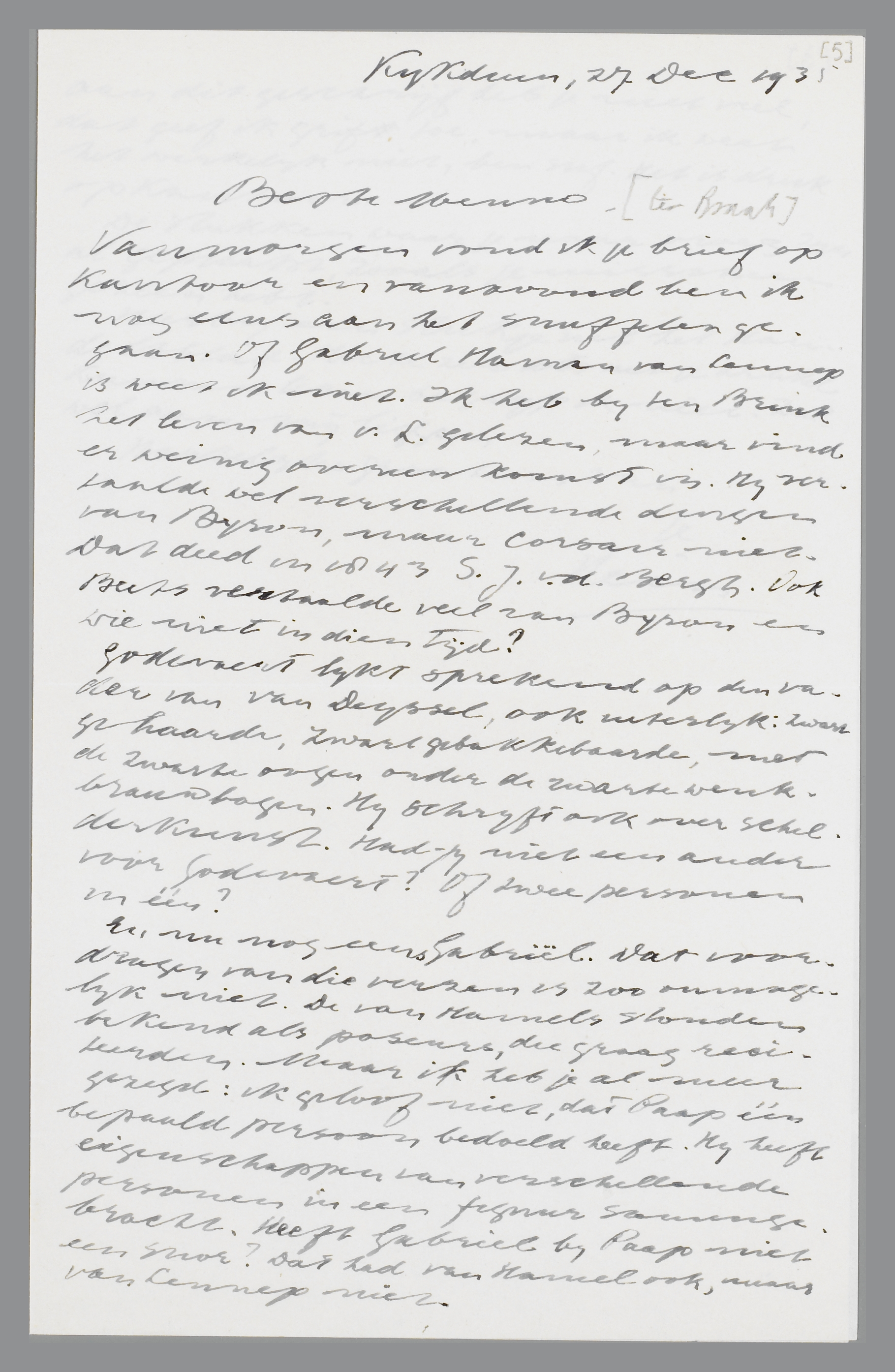 Vanmorgen vond ik je brief op Kantoor en vanavond ben ik nog eens aan het snuffelen gegaan. Of Gabriël Haman van Lennep is weet ik niet. Ik heb bij ten Brink het leven van v.L. gelezen, maar vind er weinig overeenkomst in. Hij vertaalde wel verschillende dingen van Byron, maar Corsair niet. Dat deed in 1843 S.J.v.d. Bergh. Ook Beets vertaalde veel van Byron en wie niet in dien Tijd?