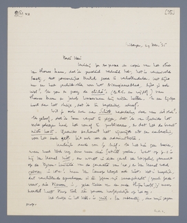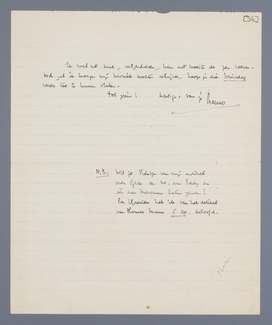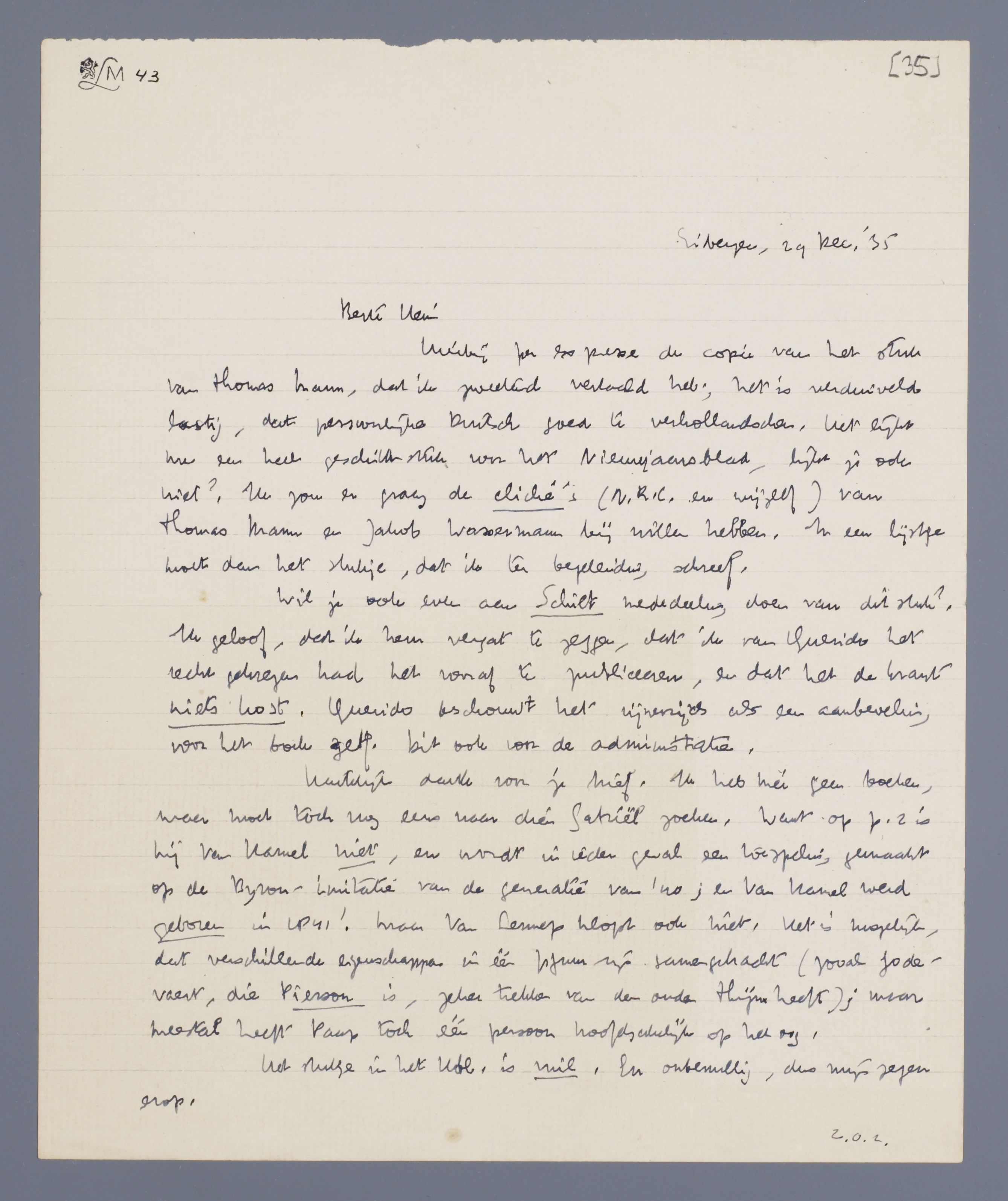 Hierbij per expresse de copie van het stuk van Thomas Mann, dat ik zweetend vertaald heb; het is verduiveld lastig, dat persoonlijke Duitsch goed te verhollandschen. Het lijkt me een heel geschikt stuk voor het Nieuwjaarsblad, lijkt je ook niet? Ik zou er graag de cliché's (N.R.C. en wijzelf) van Thomas Mann en Jacob Wassermann bij willen hebben. In een lijstje moet dan het stukje, dat ik ter begeleiding schreef.