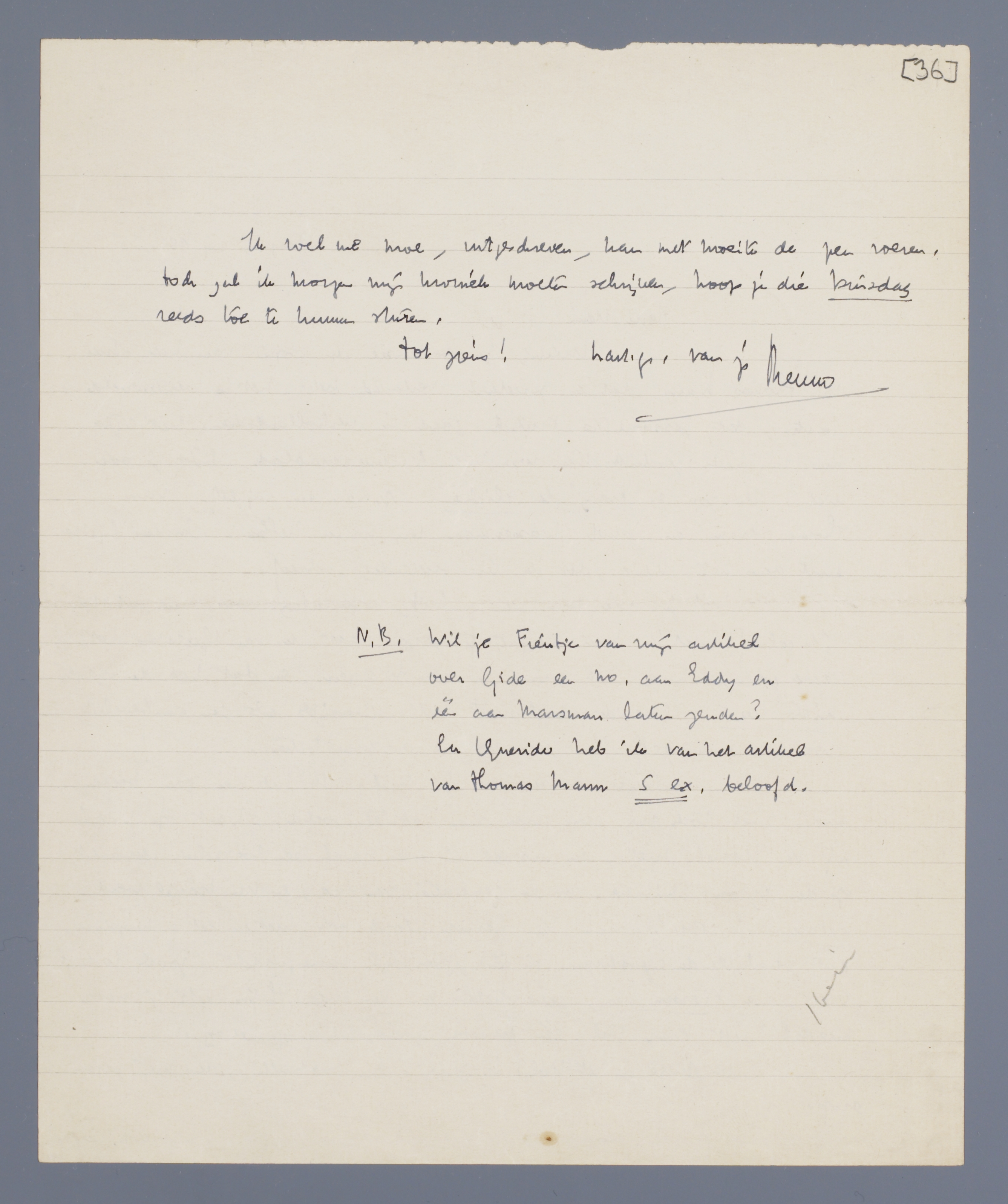 N.B. Wil je Fientje van mijn artikel over Gide een nr. aan Eddy en één aan Marsman laten zenden? En Querido heb ik van het artikel van Thomas Mann 5 ex. beloofd.