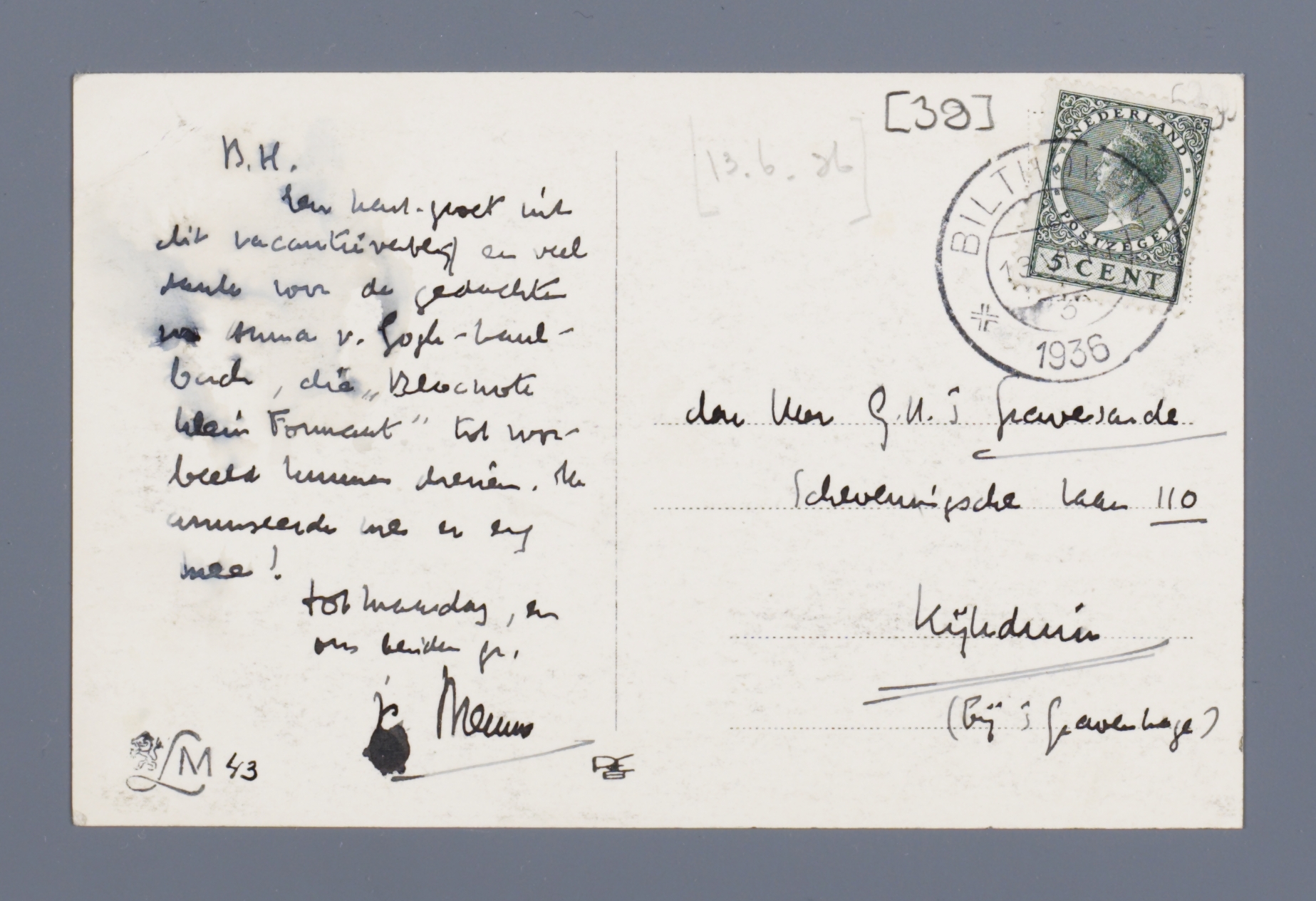 Een kaart-groet uit dit vacantieverblijf en veel dank voor de gedachten van Anna v. Gogh-Kaulbach, die ‘Blocknote klein Formaat’ tot voorbeeld kunnen [dienen]. Ik amuseerde me er erg mee!