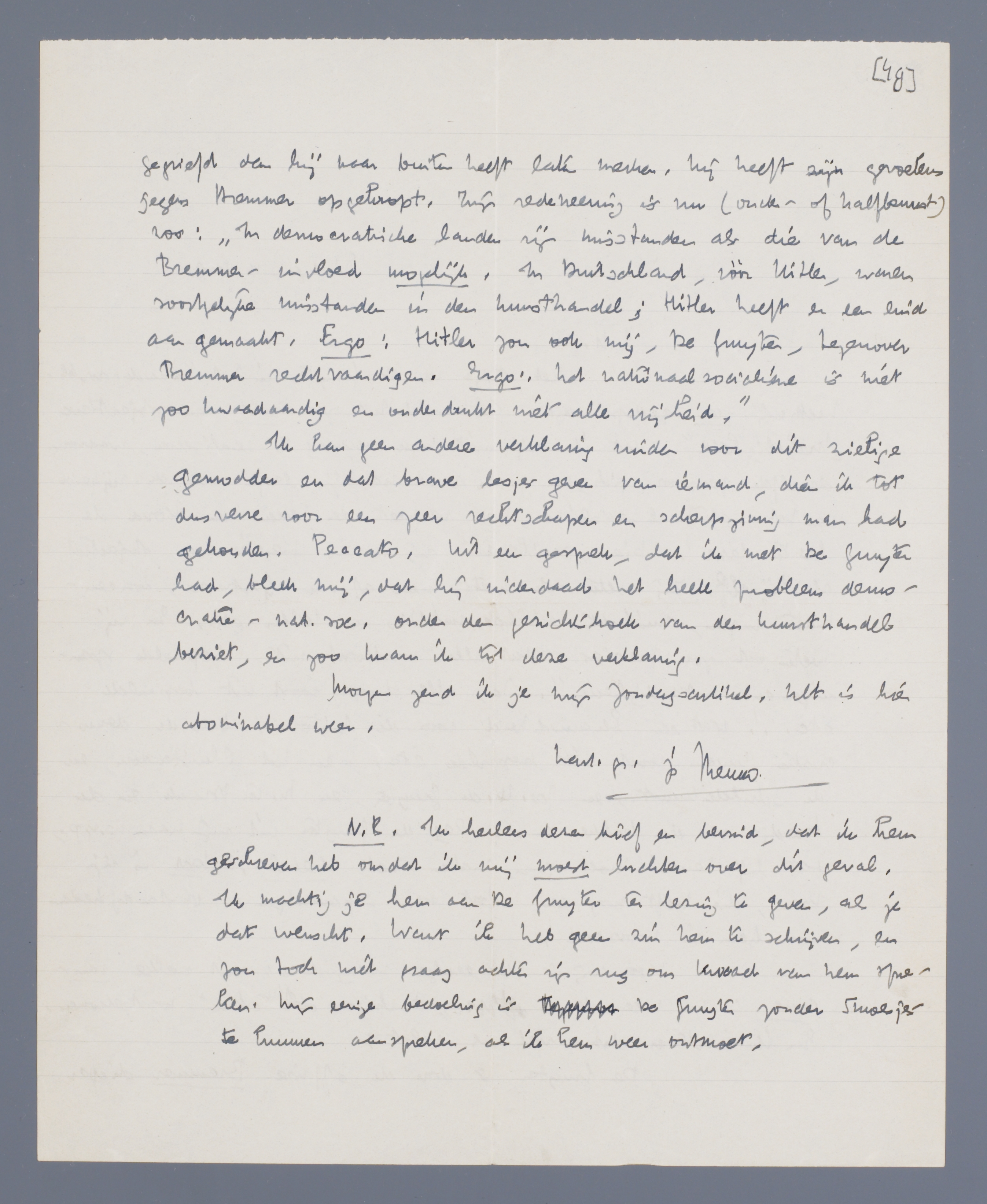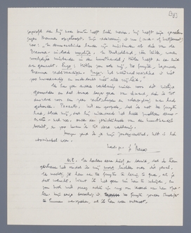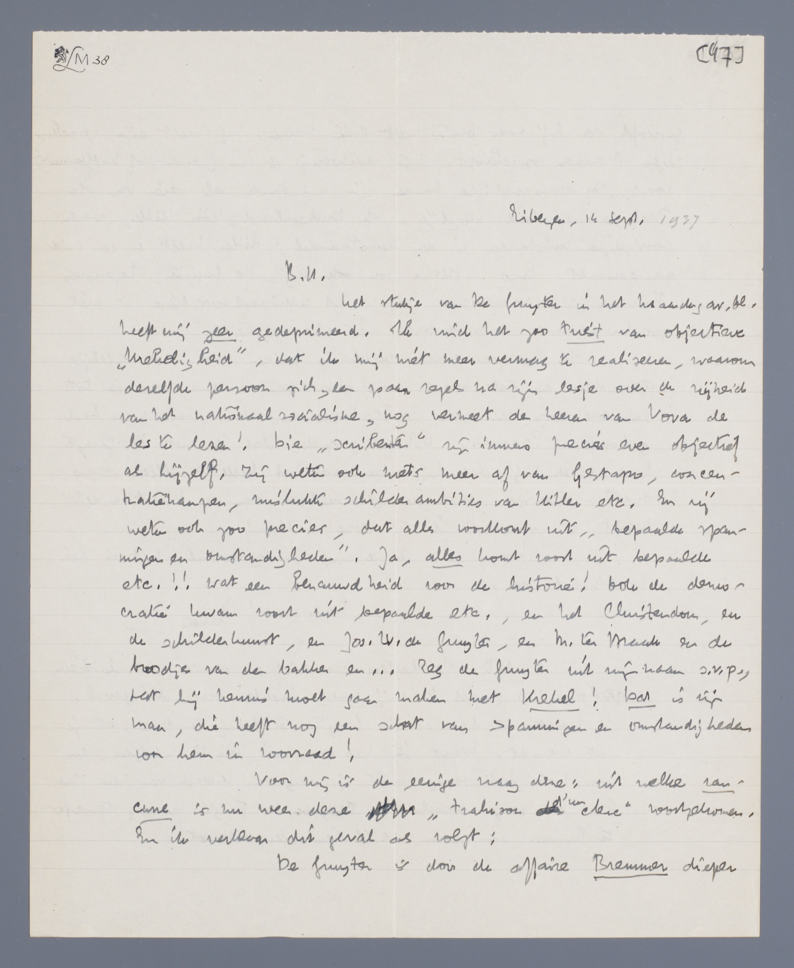 N.B. Ik herlees deze brief en bevind, dat ik hem geschreven heb omdat ik mij moest luchten over dit geval. Ik machtig je hem aan De Gruyter ter lezing te geven, als je dat wenscht, want ik heb geen zin hem te schrijven, en zou toch niet graag achter zijn rug om kwaad van hem spreken. Mijn eenige bedoeling is De Gruyter zonder smoesjes te kunnen aanspreken, als ik hem weer ontmoet.