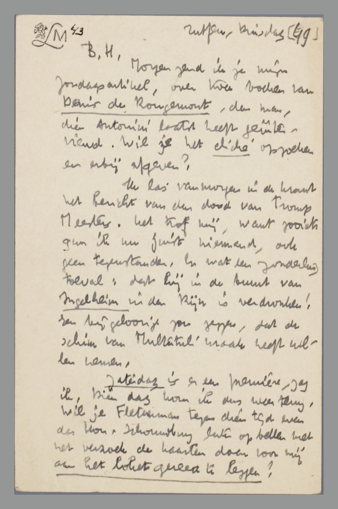 Morgen zend ik je mijn Zondagsartikel, over twee boeken van Denis de Rougemont, de man, die Antonini laatst heeft geïnterviewd. Wil je het cliché opzoeken en erbij afgeven?