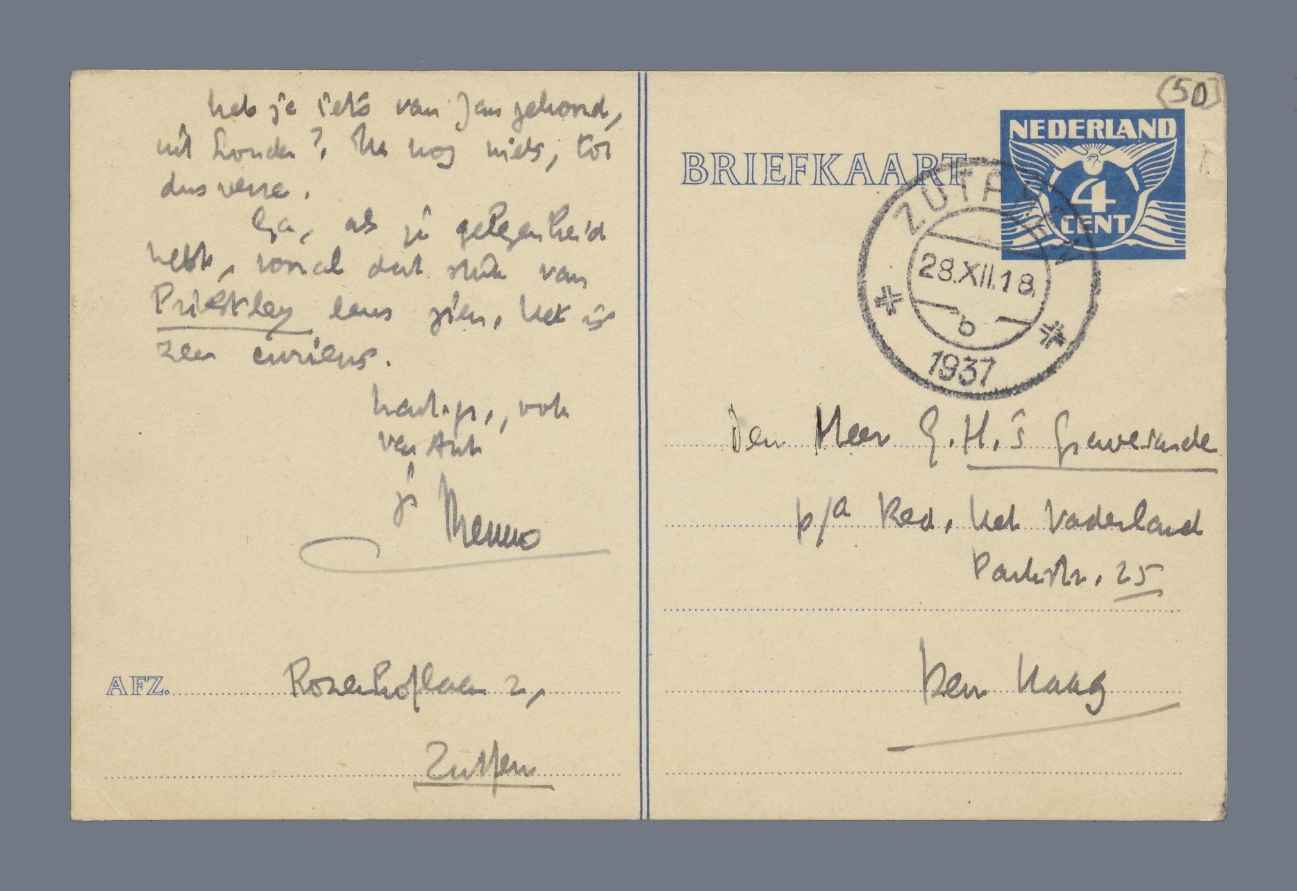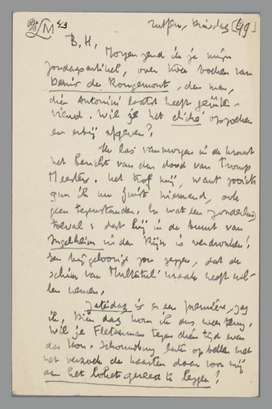 Zaterdag is er een première, zag ik. Dien dag kom ik dus weer terug. Wil je [Flettermans] tegen dien tijd even de Kon. Schouwburg laten opbellen met het verzoek de kaarten daar voor mij aan het loket gereed te leggen?