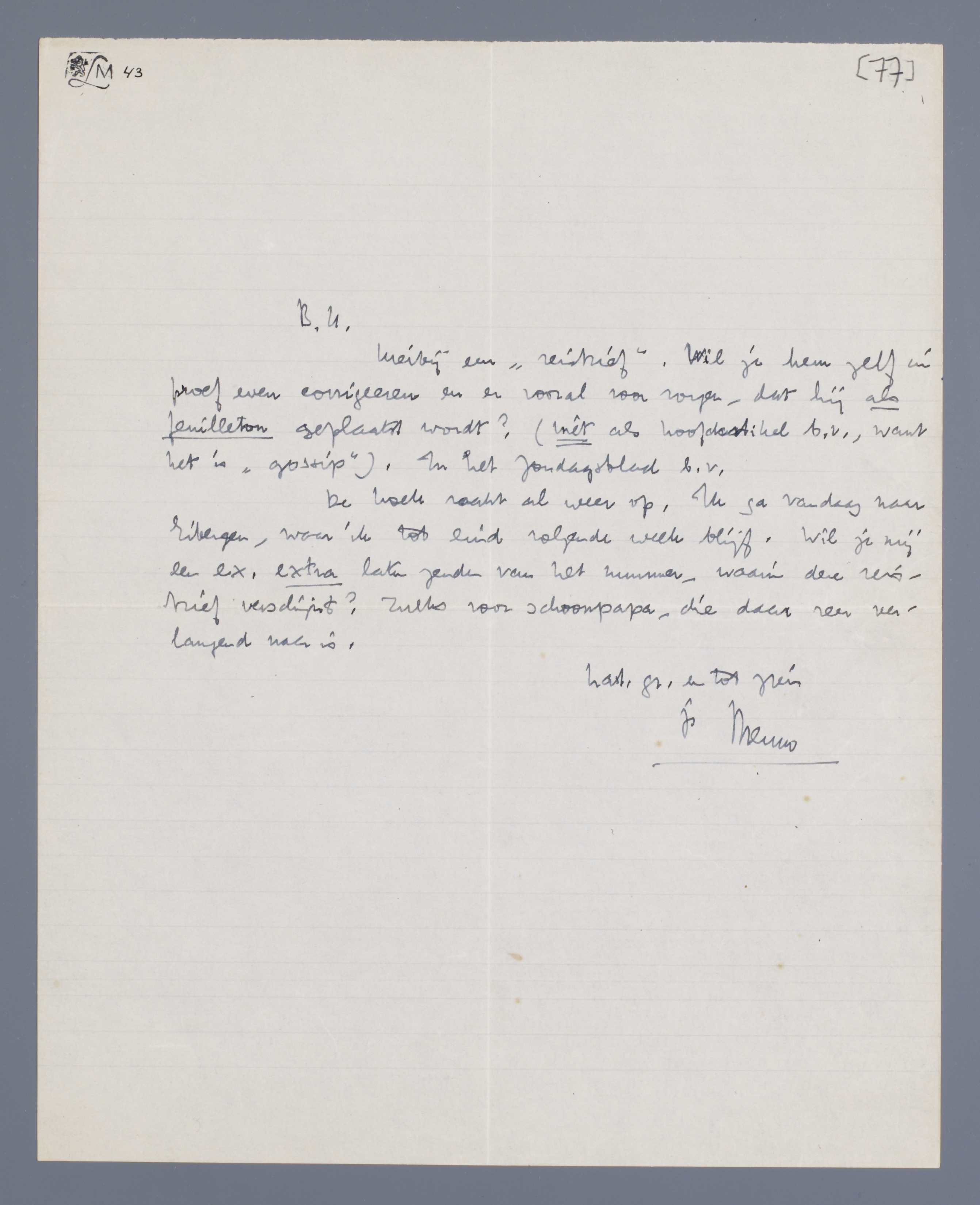 Hierbij een ‘reisbrief’. Wil je hem zelf in proef even corrigeeren en er vooral voor zorgen, dat hij als feuilleton geplaatst wordt? (Niet als hoofdartikel b.v., want het is ‘gossip’). In het Zondagsblad b.v.