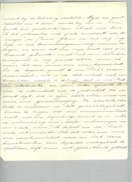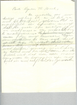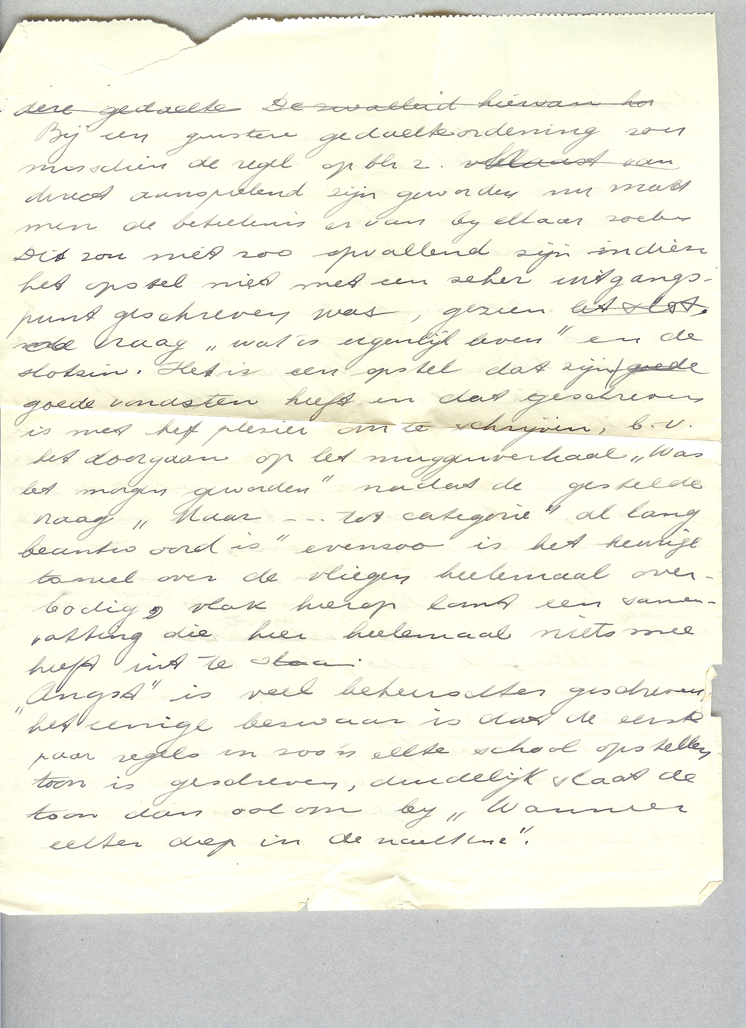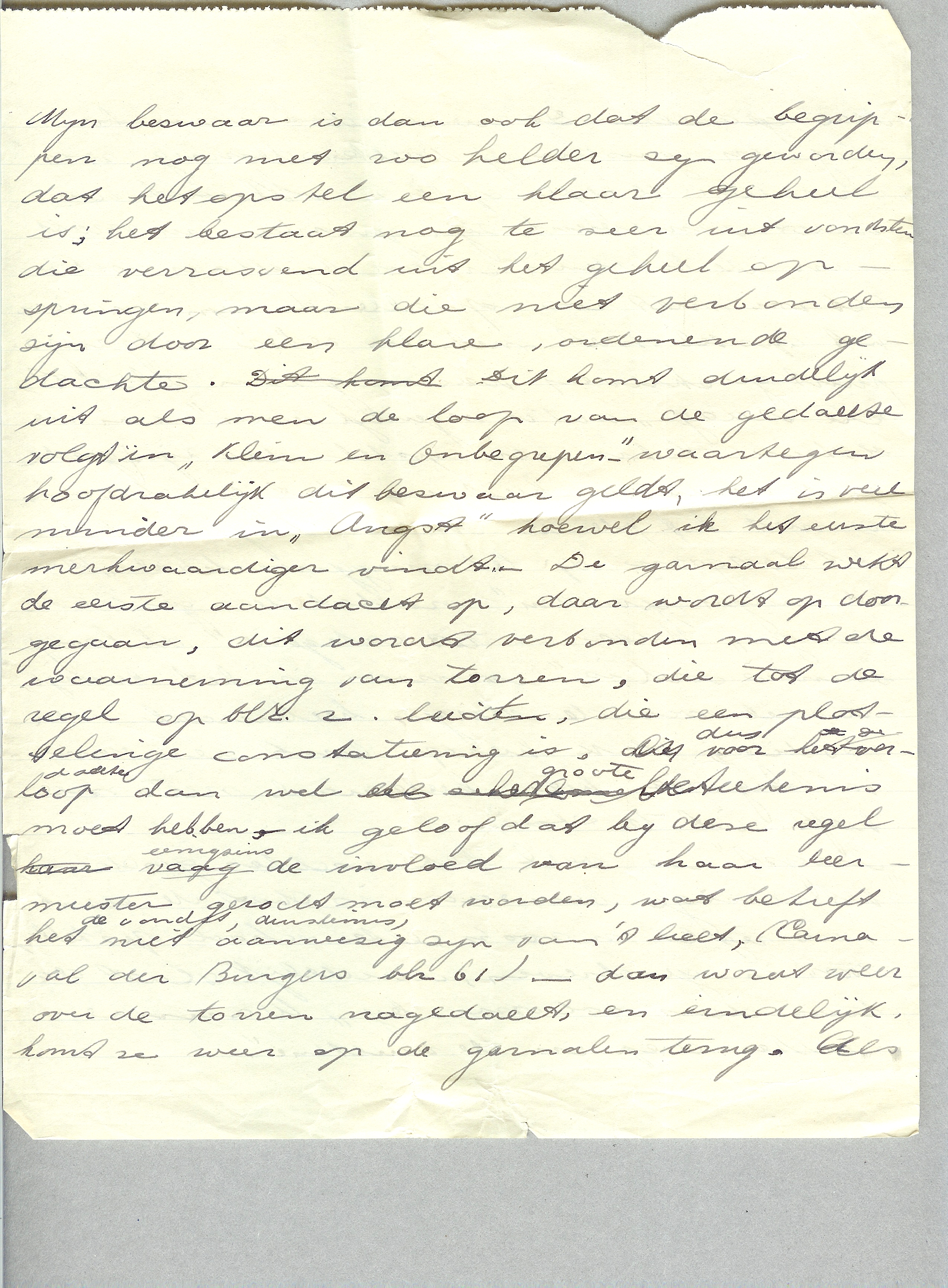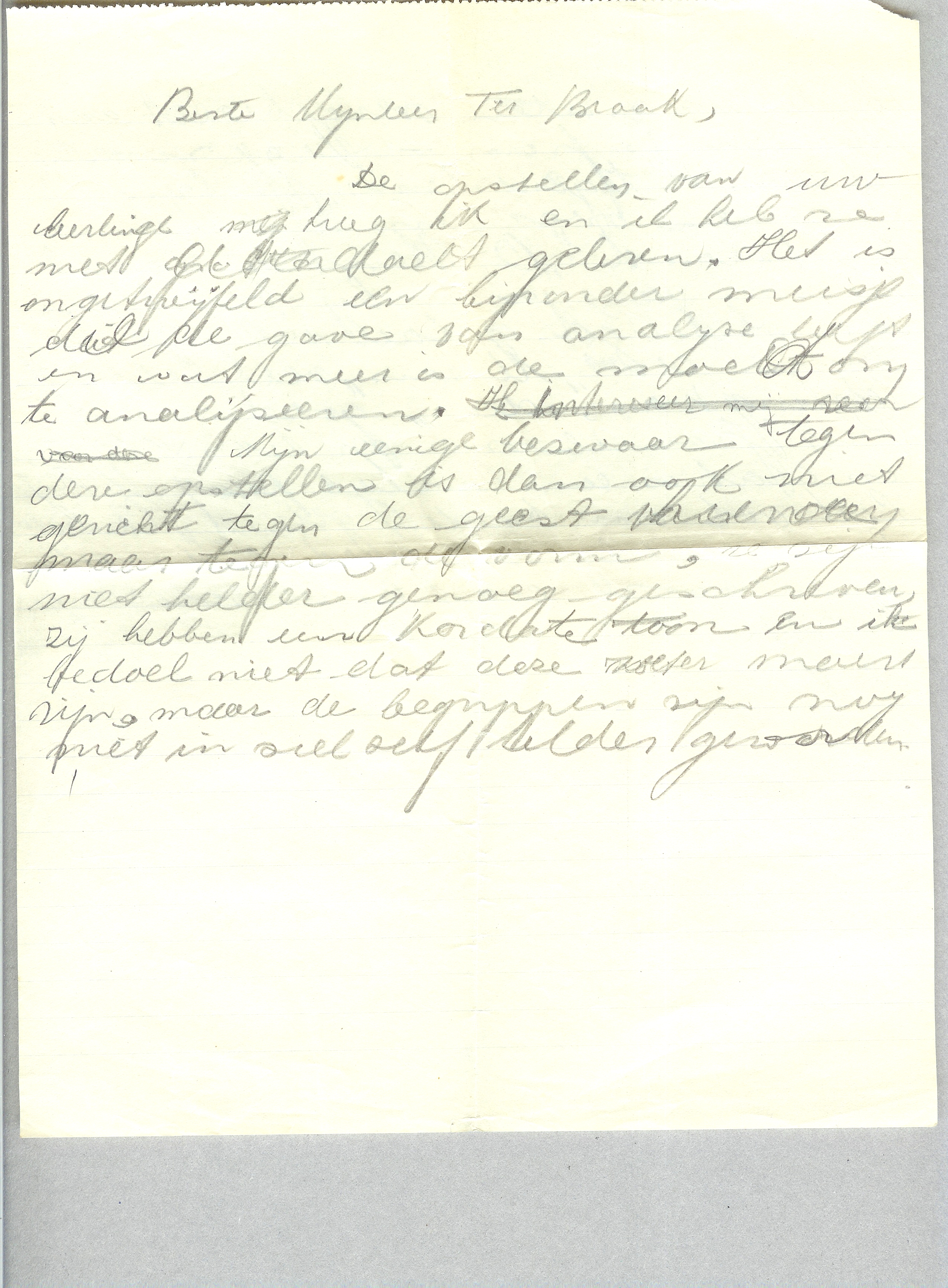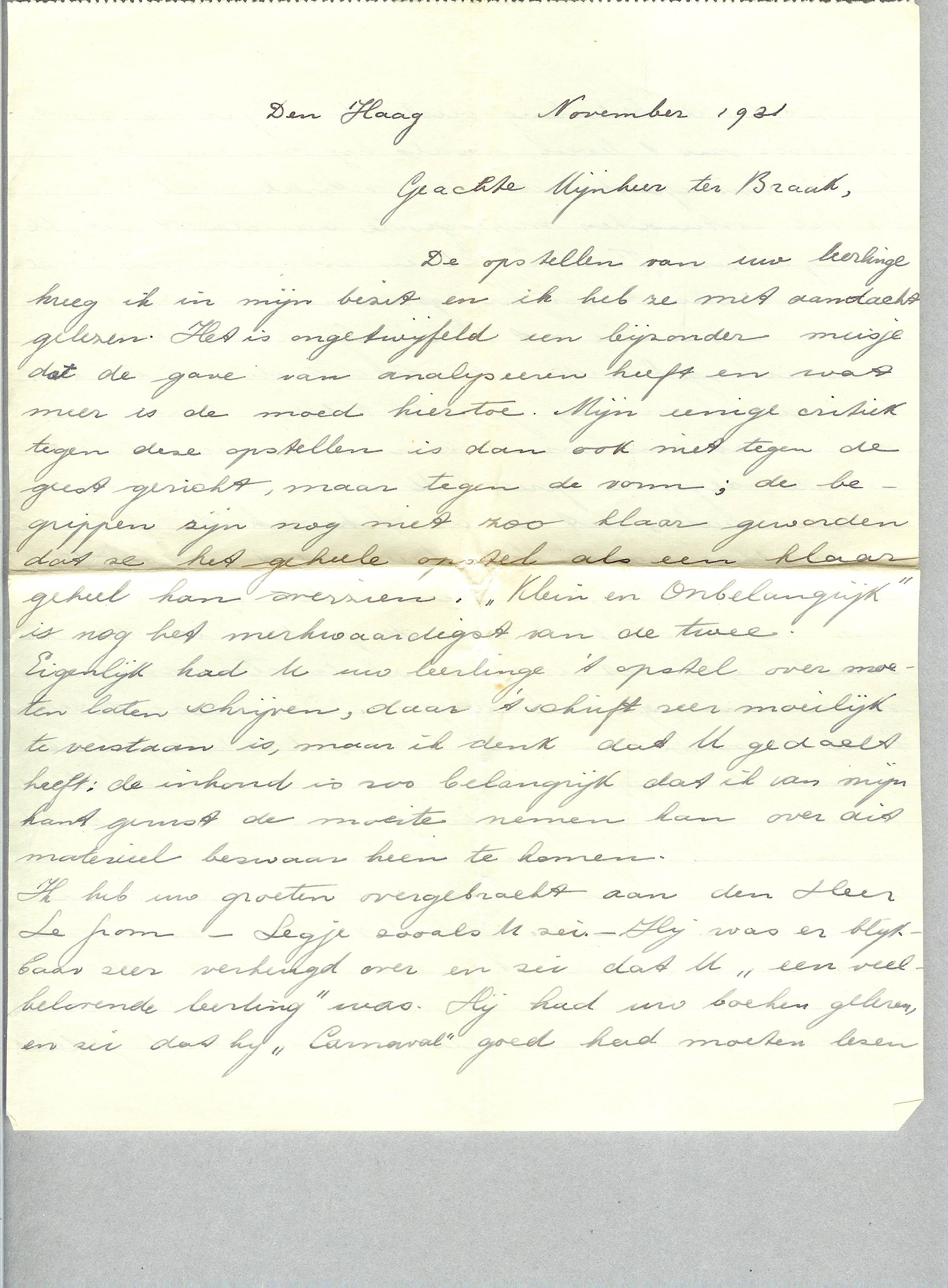 De opstellen van uw leerlinge kreeg ik in mijn bezit en ik heb ze met aandacht gelezen. Het is ongetwijfeld een bijzonder meisje dat de gave van analyseeren heeft en wat meer is de moed hiertoe. Mijn eenige critiek tegen deze opstellen is dan ook niet tegen de geest gericht, maar tegen de vorm; de begrippen zijn nog niet zoo klaar geworden dat ze het geheele opstel als een klaar geheel kan overzien. "Klein en Onbelangrijk" is nog het merkwaardigst van de twee.