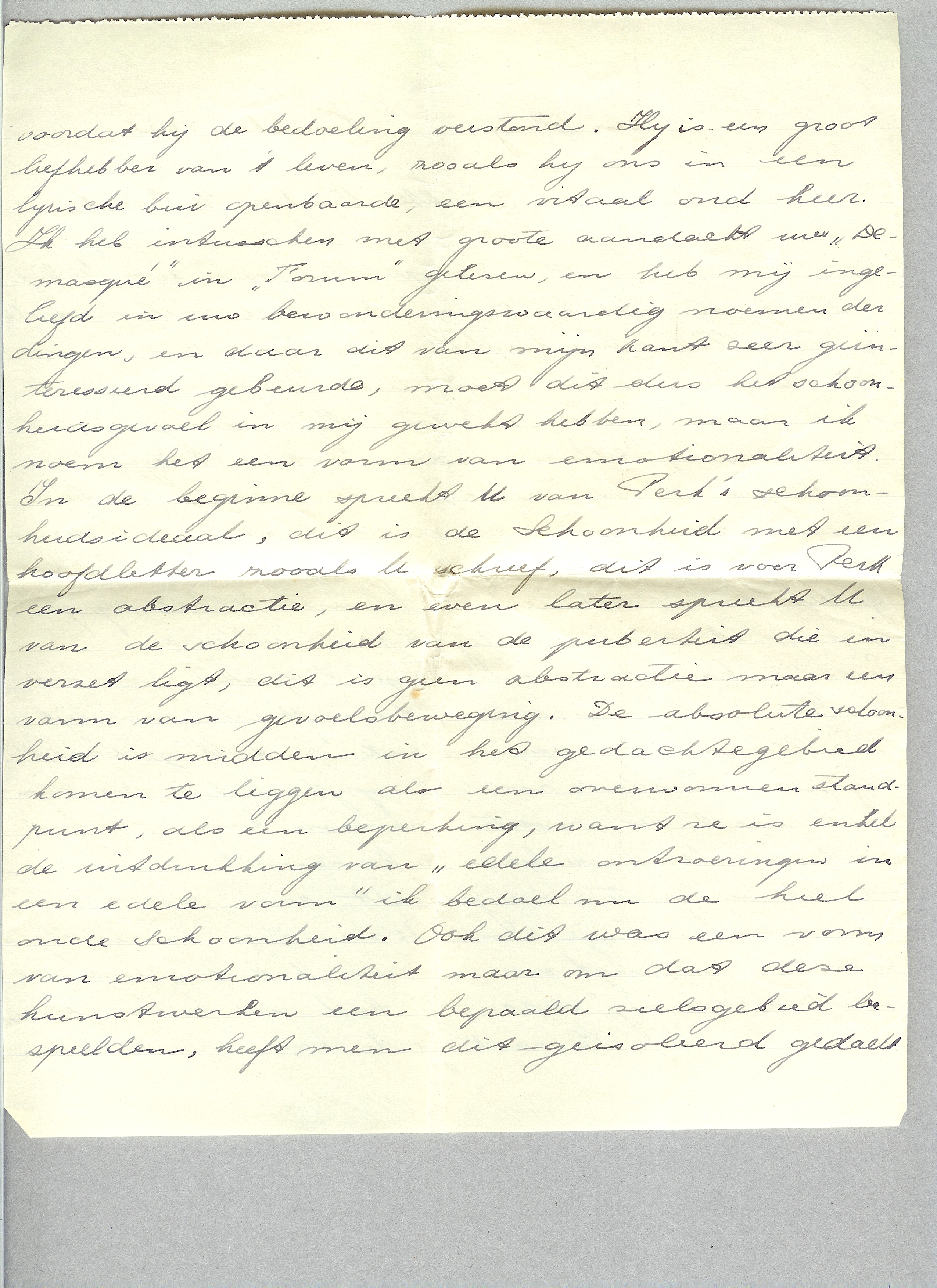 In de beginne spreekt U van Perk’s schoonheidsidiaal, dit is de schoonheid met een hoofdletter zooals U schreef, dit is voor Perk een abstractie, en even later spreekt U van de schoonheid van de puberteit die in verzet ligt, dit is geen abstractie maar een vorm van gevoelsbeweging. De absolute schoonheid is midden in het gedachtegebied komen te liggen als een overwonnen standpunt, als een beperking, want ze is enkel de uitdrukking van “edele ontroeringen in een edele vorm” ik bedoel nu de heel oude schoonheid. Ook dit was een vorm van emotionaliteit maar om dat deze kunstwerken een bepaald zielsgebied bespeelden, heeft men dit geïsoleerd gedacht en kwam daardoor tot de abstracte schoonheid.
