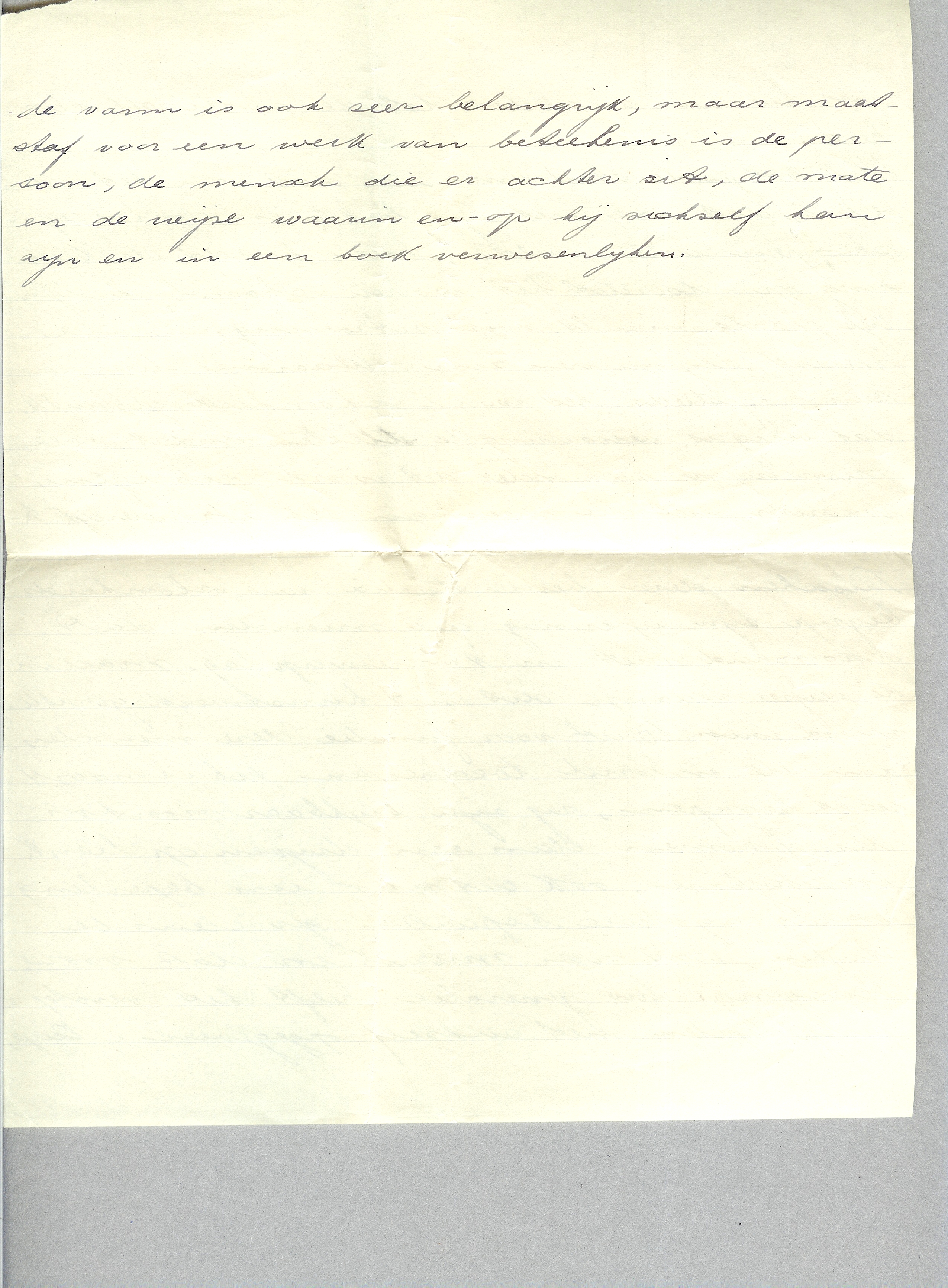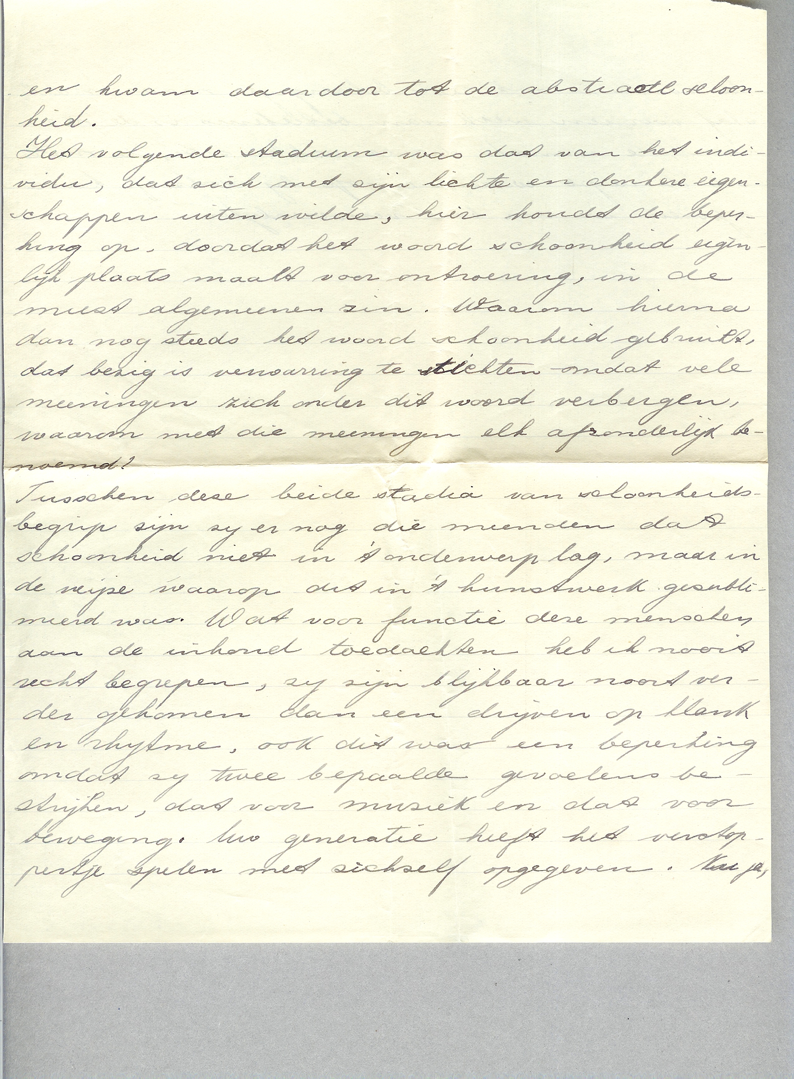Tusschen deze beide stadia van schoonheidsbegrip zijn zij er nog die meenden dat schoonheid niet in ’t onderwerp lag, maar in de wijze waarop dit in ’t kunstwerk gesublimeerd was. Wat voor functie deze menschen aan de inhoud toedachten heb ik nooit recht begrepen, zij zijn blijkbaar nooit verder gekomen dan een schrijven op een blank en rhytme, ook dit was een beperking omdat zij twee bepaalde gevoelens bestrijken, dat voor muziek en dat voor beweging. Uw generatie heeft het verstoppertje spelen met zichzelf opgegeven. Nu ja, de vorm is ook zeer belangrijk, maar maatstaf voor een werk van beteekenis is de persoon, de mensch die er achter zit, de mate en de wijze waarin en -op hij zichzelf kan zijn en in een boek verwezenlijken.