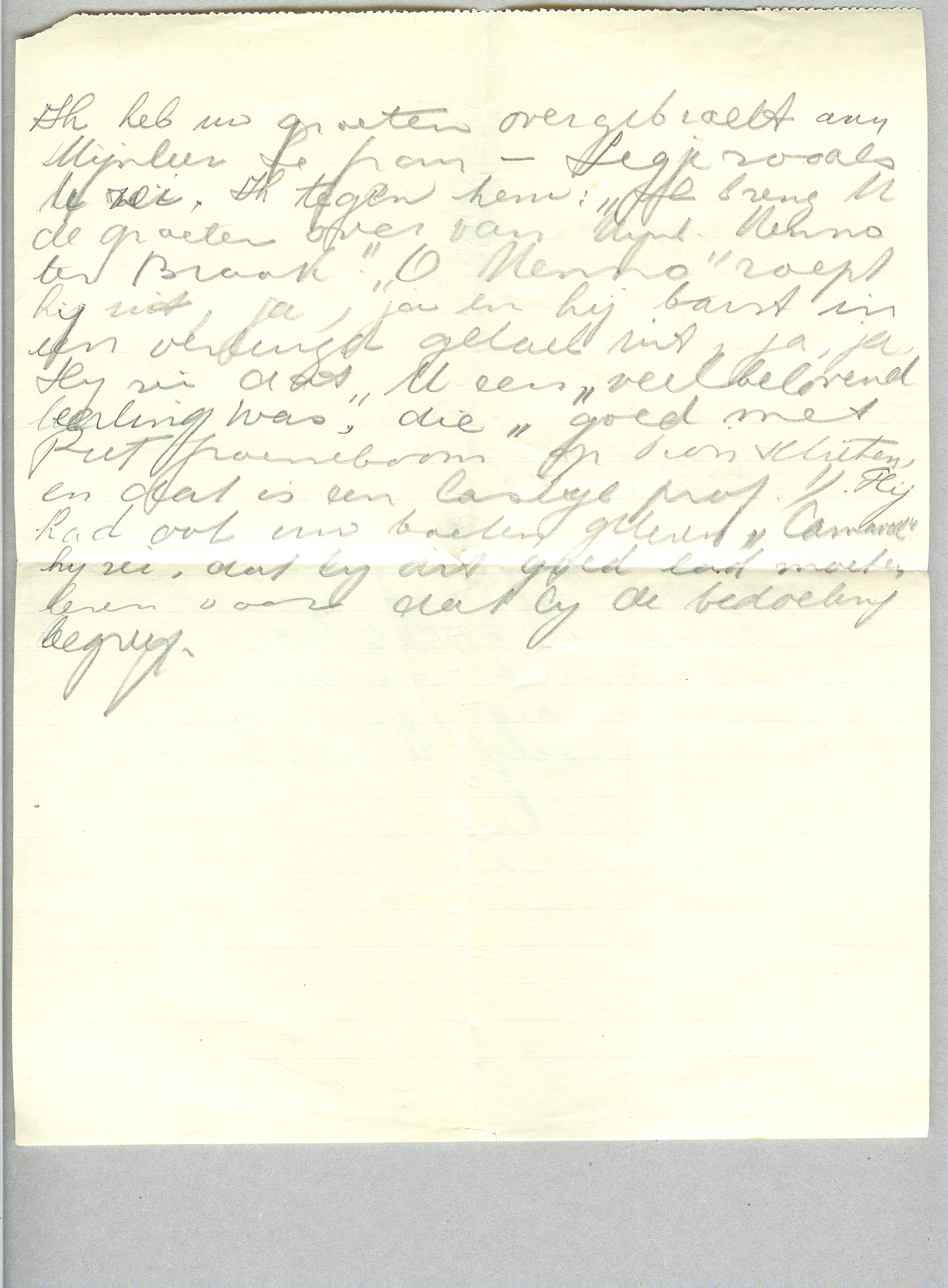 Ik heb uw groeten overgebracht aan den Heer Le Grom-Legje zooals U zei – Hij was er blijkbaar zeer verheugd over en zei dat U “een veelbelovende leerling” was. Hij had uw boeken gelezen, en zei dat hij “Carnaval” goed had moeten lezen voordat hij de bedoeling verstond. Hij is een groot liefhebber van ’t leven, zooals hij ons in een lyrische bui openbaarde, een vitaal oud heer.