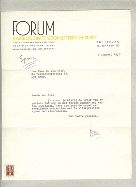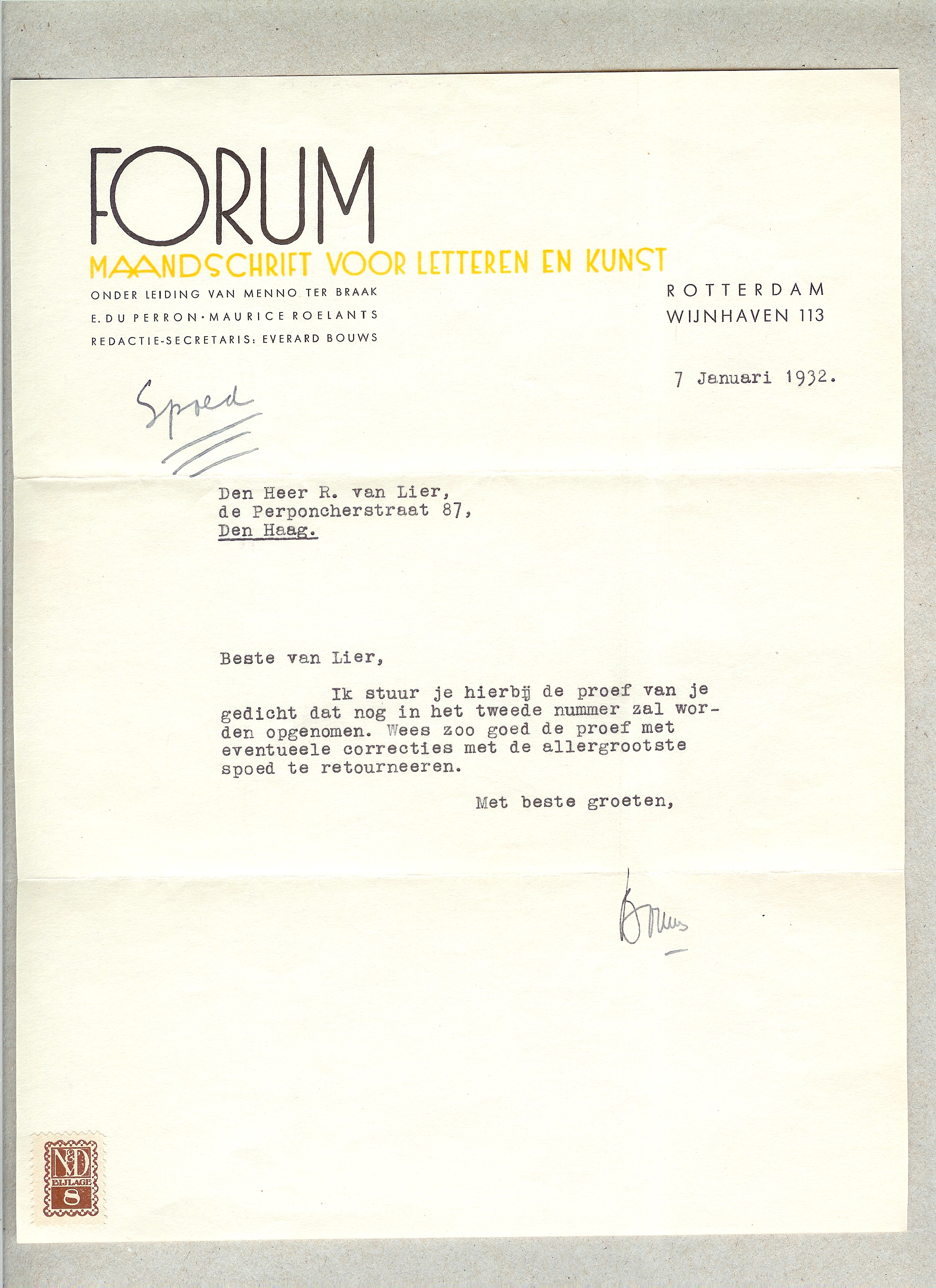 Ik stuur je hierbij de proef van je gedicht dat nog in het tweede nummer zal worden opgenomen. Wees zoo goed de proef met eventueele correcties met de allergrootste spoed te retourneeren.