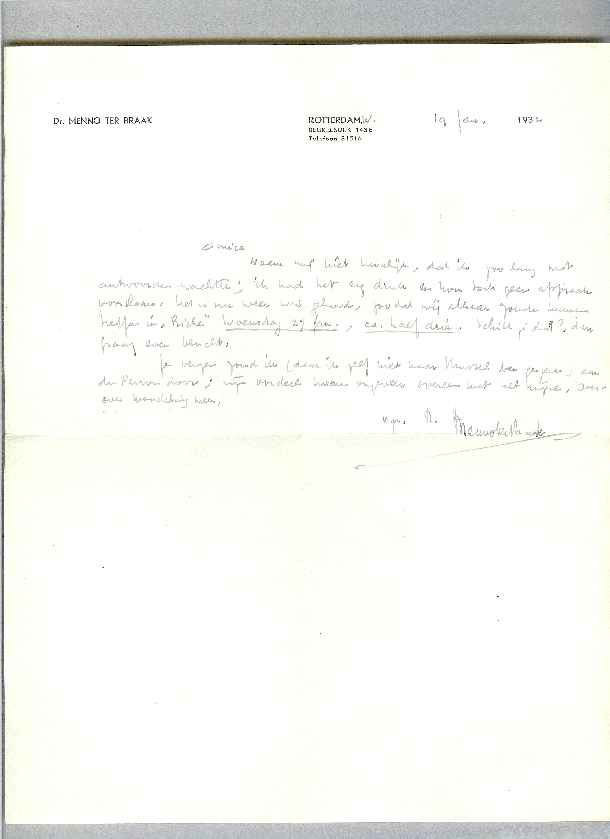 Neem mij niet kwalijk, dat ik zoo lang met antwoorden wachtte; ik had het erg druk en kon toch geen afspraak voorslaan. Het is nu weer wat geluwd, zoodat wij elkaar zouden kunnen treffen in ‘Riche’ Woensdag 27 Jan., ca. half drie. Schikt je dat? dan graag even bericht.