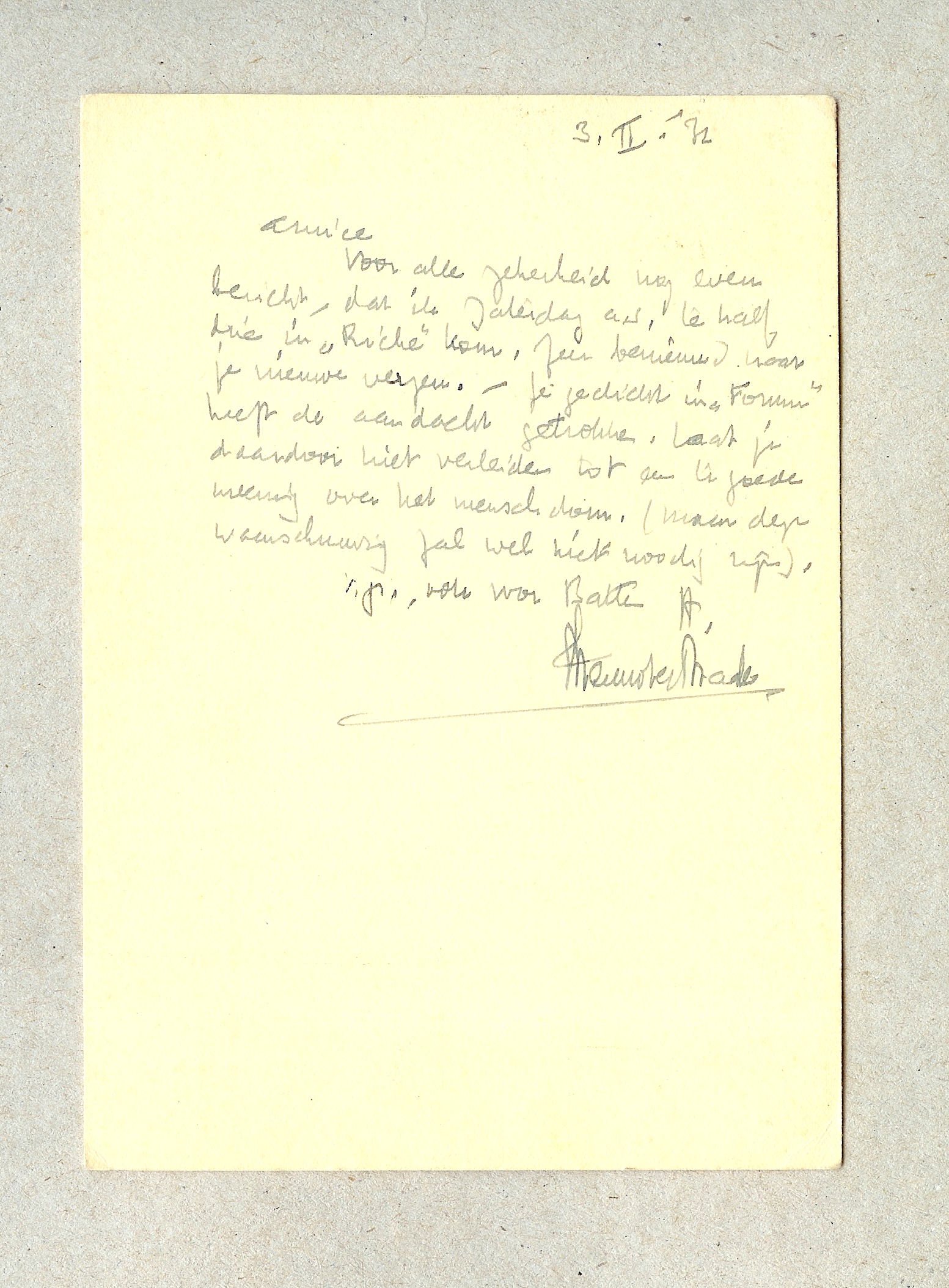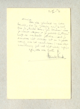 Voor alle zekerheid nog even bericht, dat ik Zaterdag a.s. te half drie in ‘Riche’ kom. Zeer benieuwd naar je nieuwe verzen. - Je gedicht in ‘Forum’ heeft de aandacht getrokken. Laat je daardoor niet verleiden tot een te goede meening over het menschdom. (maar deze waarschuwing zal wel niet noodig zijn).