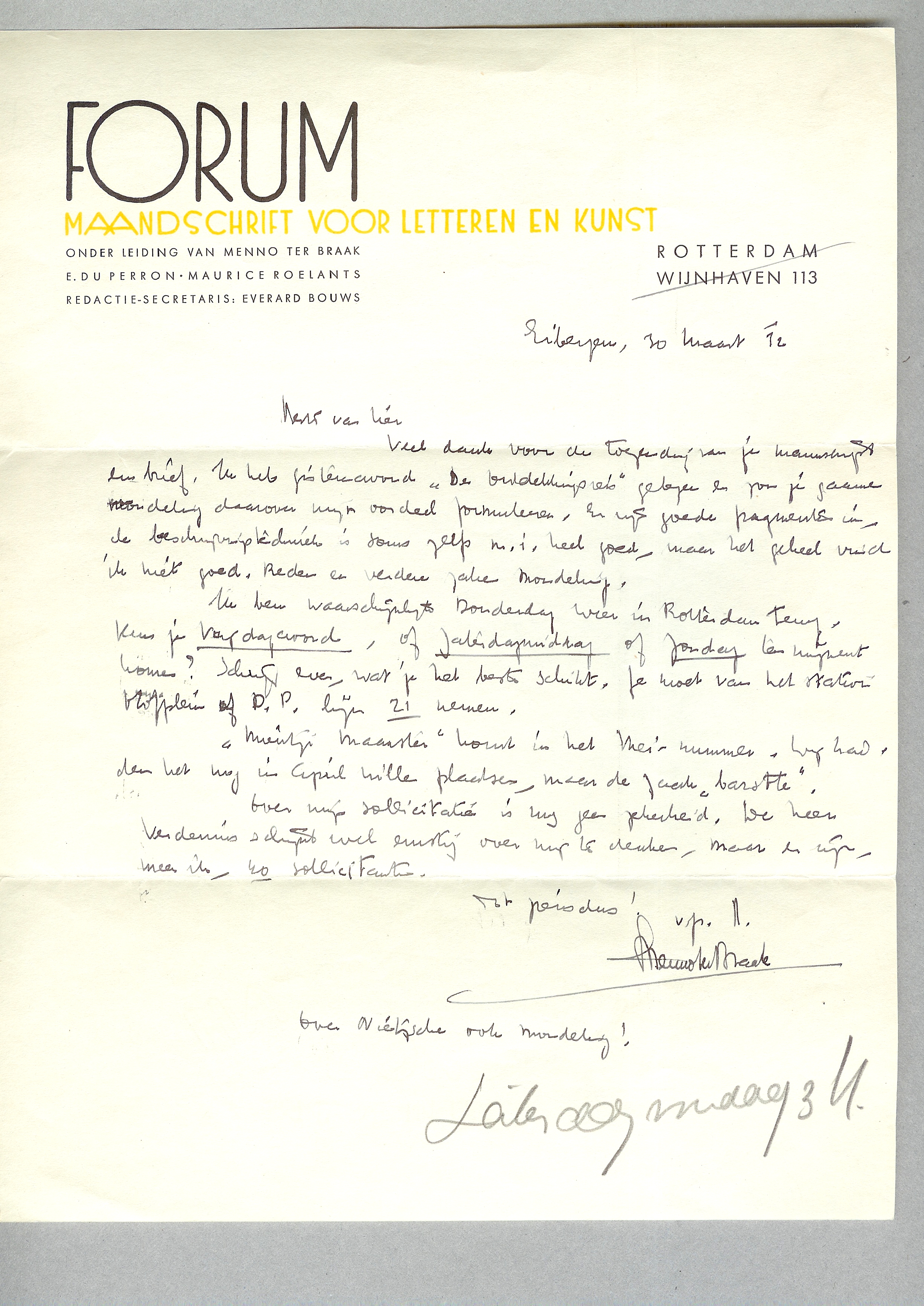 Veel dank voor de toezegging van je manuscript en brief. Ik heb gisterenavond ‘De Ontdekkingsreis’ gelezen en zou je gaarne mondeling daarover mijn oordeel formuleren. Er zijn goede fragmenten in, de beschrijvingstechniek is zelfs m.i. heel goed, maar het geheel vind ik niet goed. Reden en verdere zaken mondeling.