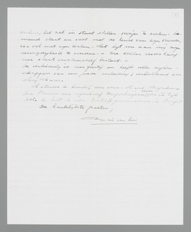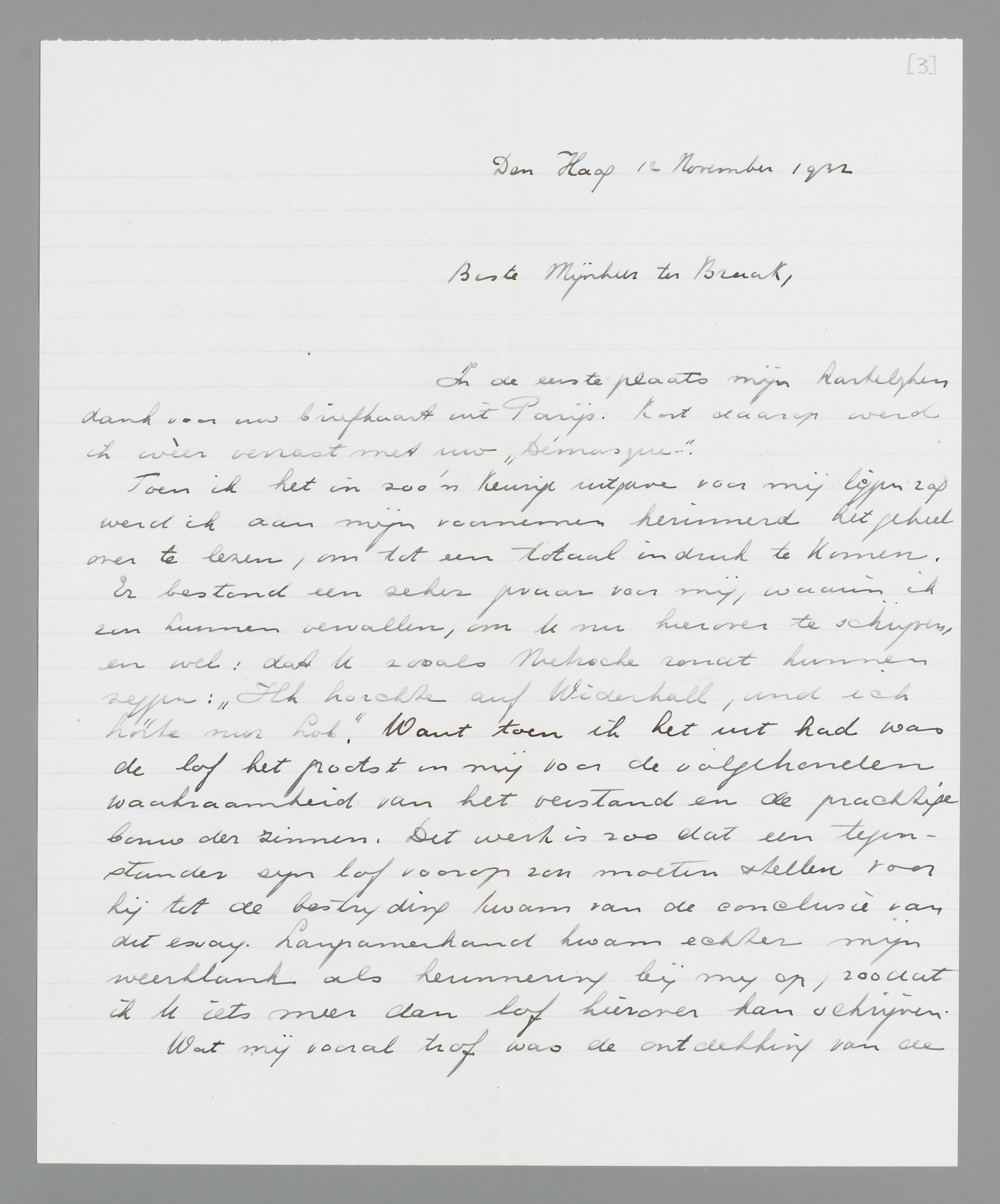 Er bestond een zeker gevaar voor mij, waarin ik zou kunnen vervallen, om U nu hierover te schrijven, en wel: dat U zooals Nietzsche zoudt kunnen zeggen: ‘Ich horchte auf Widerhall, und ich hörte nur Lob.’ Want toen ik het uit had was de lof het grootst in mij voor de volgehouden waakzaamheid van het verstand en de prachtige bouw der zinnen. Dit werk is zoo dat een tegenstander zijn lof voorop zou moeten stellen voor hij tot de bestrijding kwam van de conclusie van dit essay. Langzamerhand kwam echter mijn weerklank als herinnering bij mij op, zoodat ik U iets meer dan lof hierover kan schrijven.