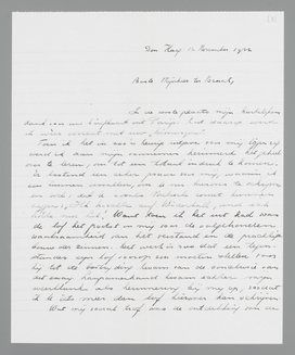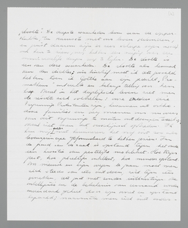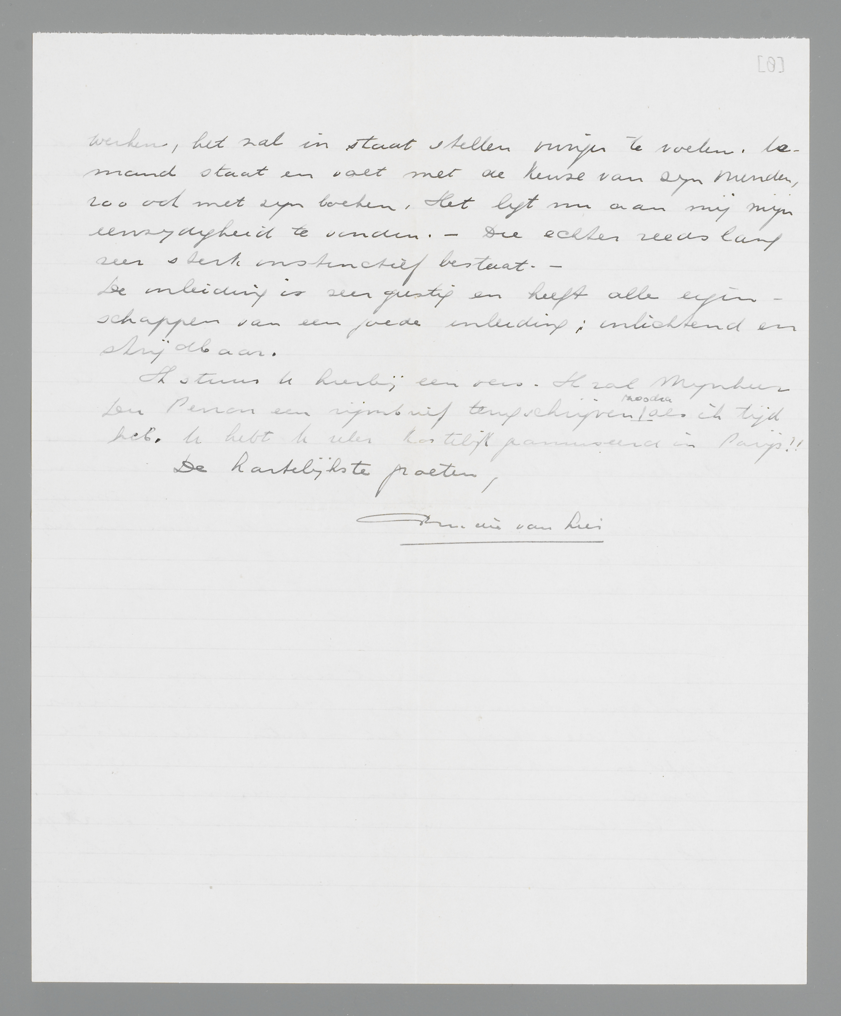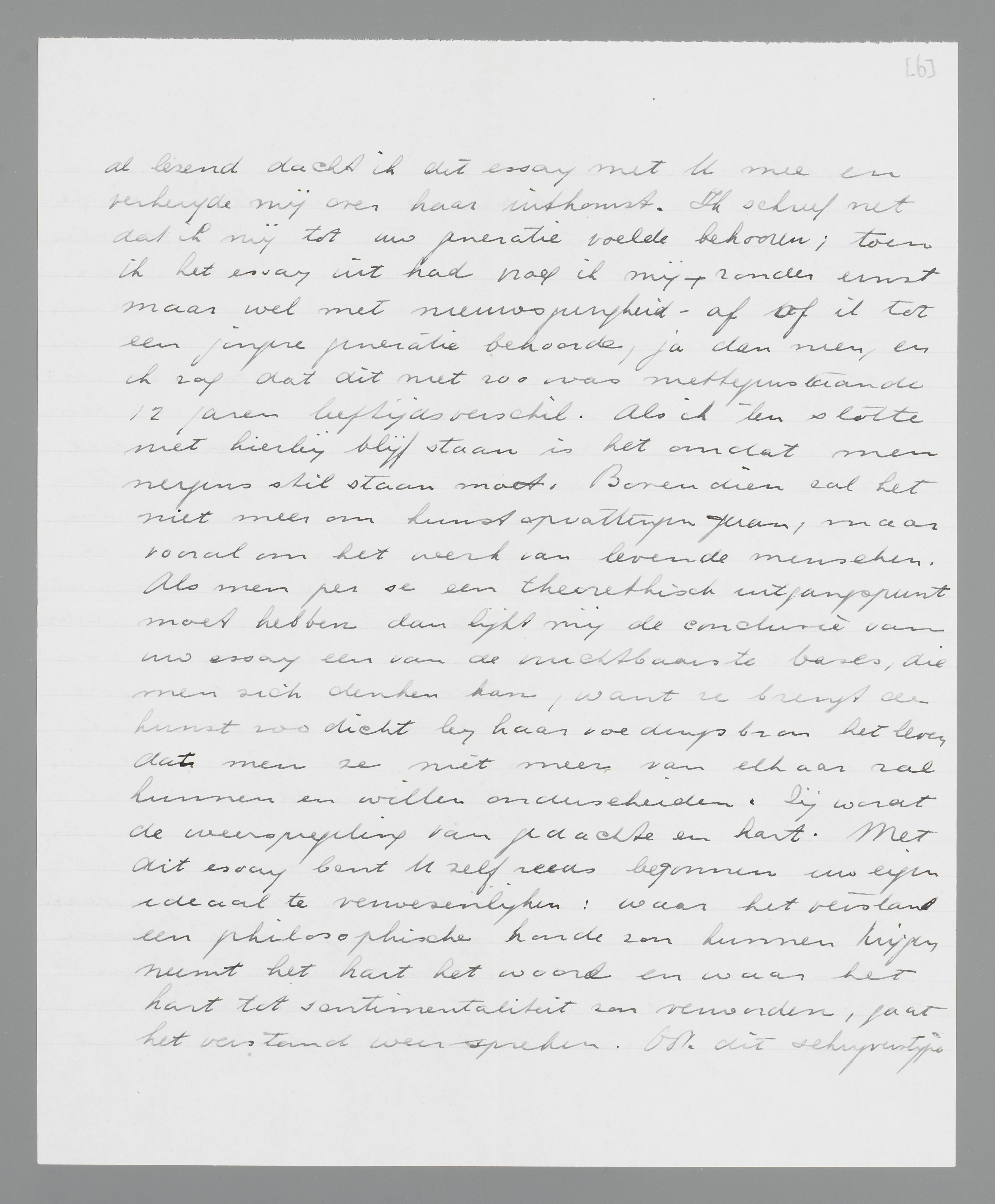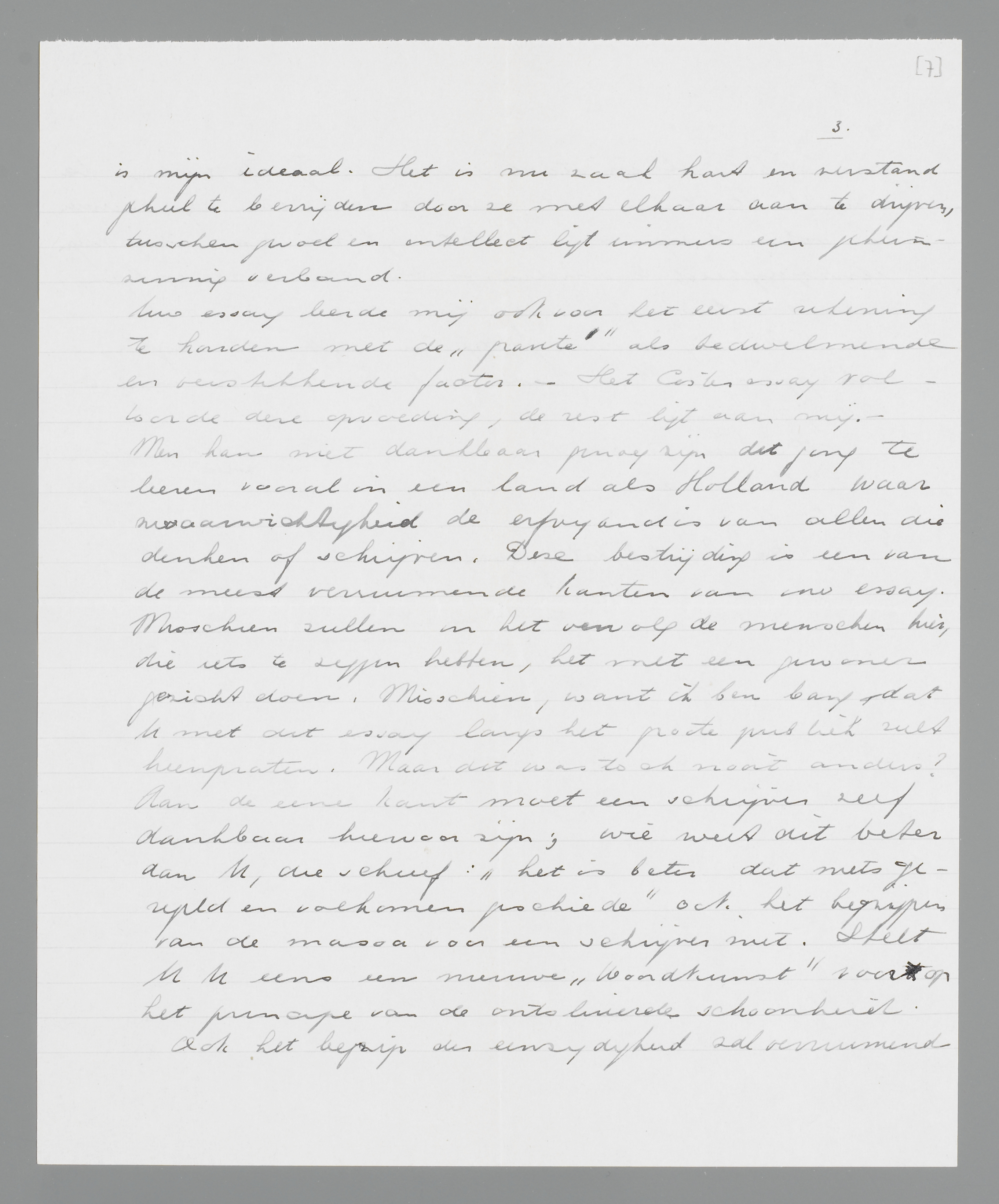 Uw essay leerde mij ook voor het eerst rekening te houden met de ‘gravité’ als bedwelmende en verstikkende factor. - Het Coster essay voltooide deze opvoeding - de rest ligt aan mij.- Men kan niet dankbaar genoeg zijn dit jong te leeren vooral in een land als Holland waar zwaarwichtigheid de erfvijand is van allen die denken of schrijven. Deze bestrijding is een van de meest verruimende kanten van uw essay. Misschien zullen in het vervolg de menschen hier, die iets te zeggen hebben, het met een gewoner gezicht doen. Misschien, want ik ben bang dat U met dit essay langs het groote publiek zult heenpraten. Maar dit was toch nooit anders! Aan de eene kant moet een schrijver zelf dankbaar hiervoor zijn; wie weet dit beter dan U, die schreef: ‘het is beter dat niets geregeld en volkomen geschiede’ ook het begrijpen van de massa voor een schrijver niet. Stelt U U eens een nieuwe ‘Woordkunst’ voor op het principe van de ontsluierde schoonheid.