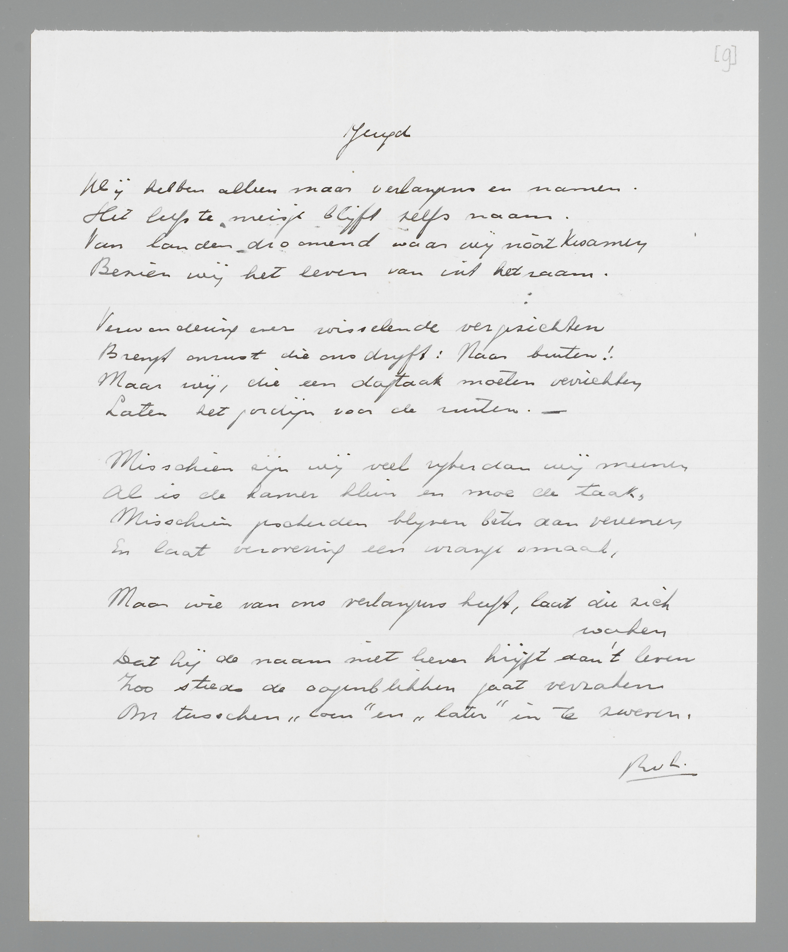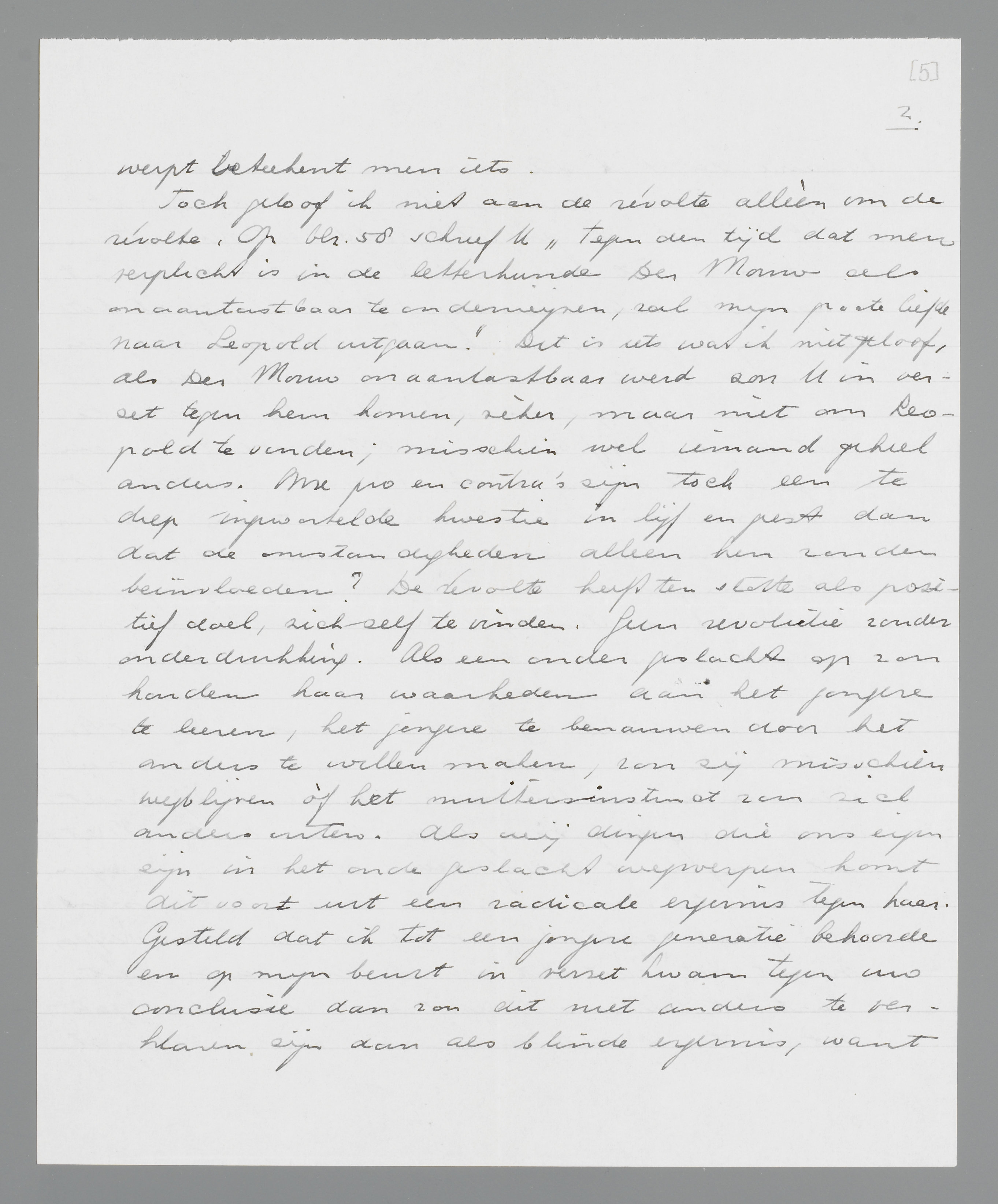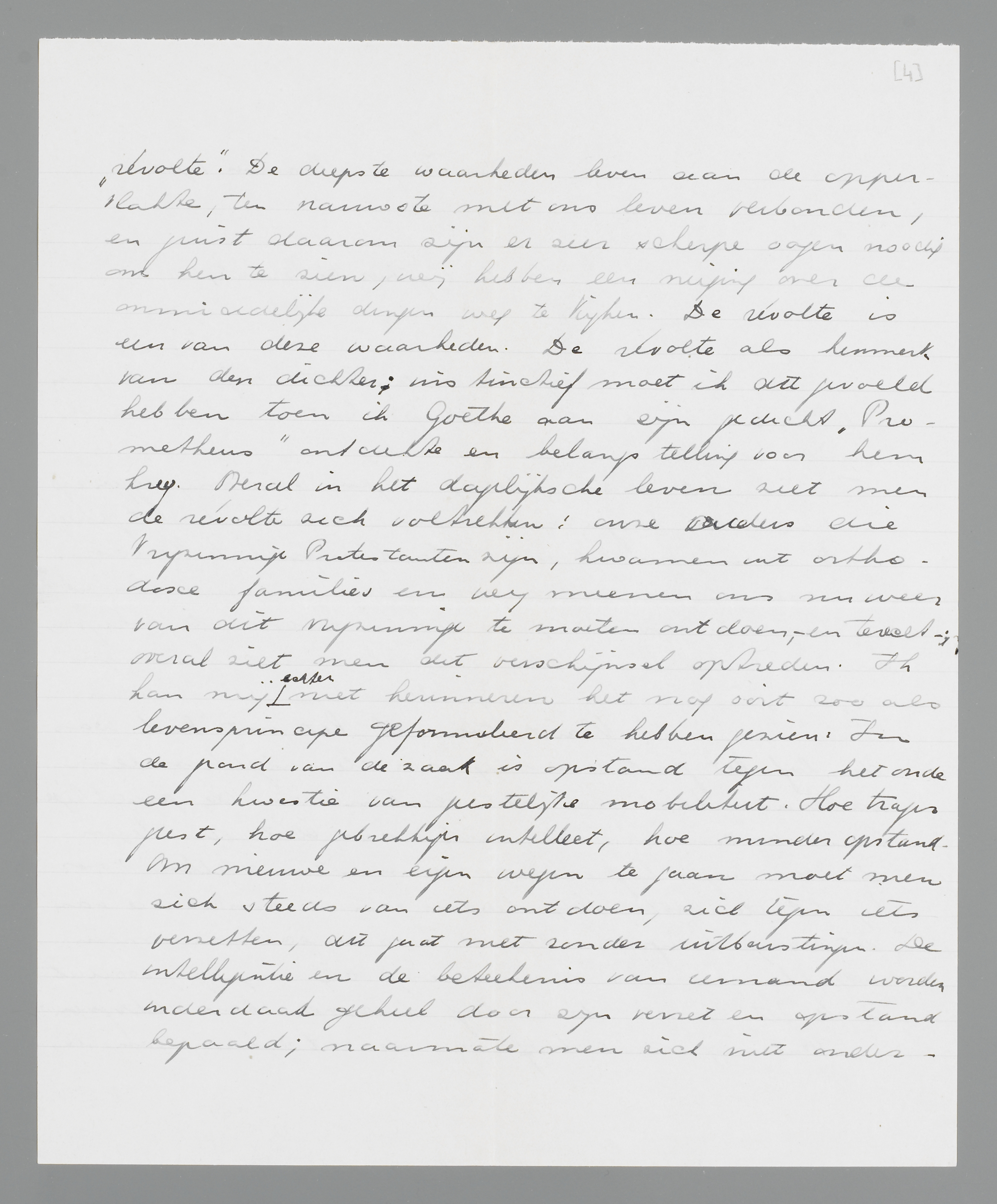 Wat mij vooral trof was de ontdekking van de ‘révolte’. De diepste waarheden leven aan de oppervlakte, ten nauwste met ons leven verbonden, en juist daarom zijn er zeer scherpe oogen noodig om hen te zien, wij hebben een neiging over de onmiddelijke dingen weg te kijken. De révolte is een van deze waarheden. De révolte als kenmerk van den dichter: instinctief moet ik dit gevoeld hebben toen ik Goethe aan zijn gedicht ‘Prometheus’ ontdekte en belangstelling voor hem kreeg. Overal in het dagelijksche leven ziet men de révolte zich voltrekken: onze ouders die Vrijzinnige Protestanten zijn, kwamen uit orthodoxe families en wij meenen ons nu weer van dit vrijzinnige te moeten ontdoen, - en [terecht] -; overal ziet men dat verschijnsel optreden. Ik kan mij echter niet herinneren het nog ooit zoo als levensprincipe geformuleerd te hebben gezien: In de grond van de zaak is opstand tegen het oude een kwestie van geestelijke mobiliteit. Hoe trager geest, hoe gebrekkiger intellect, hoe minder opstand. Om nieuwe en eigen wegen te gaan moet men zich steeds van iets ontdoen, zich tegen iets verzetten, dit gaat niet zonder uitbarstingen. De intelligentie en de beteekenis van iemand worden inderdaad geheel door zijn verzet en opstand bepaald; naarmate men zich niet onderwerpt beteekent men iets.