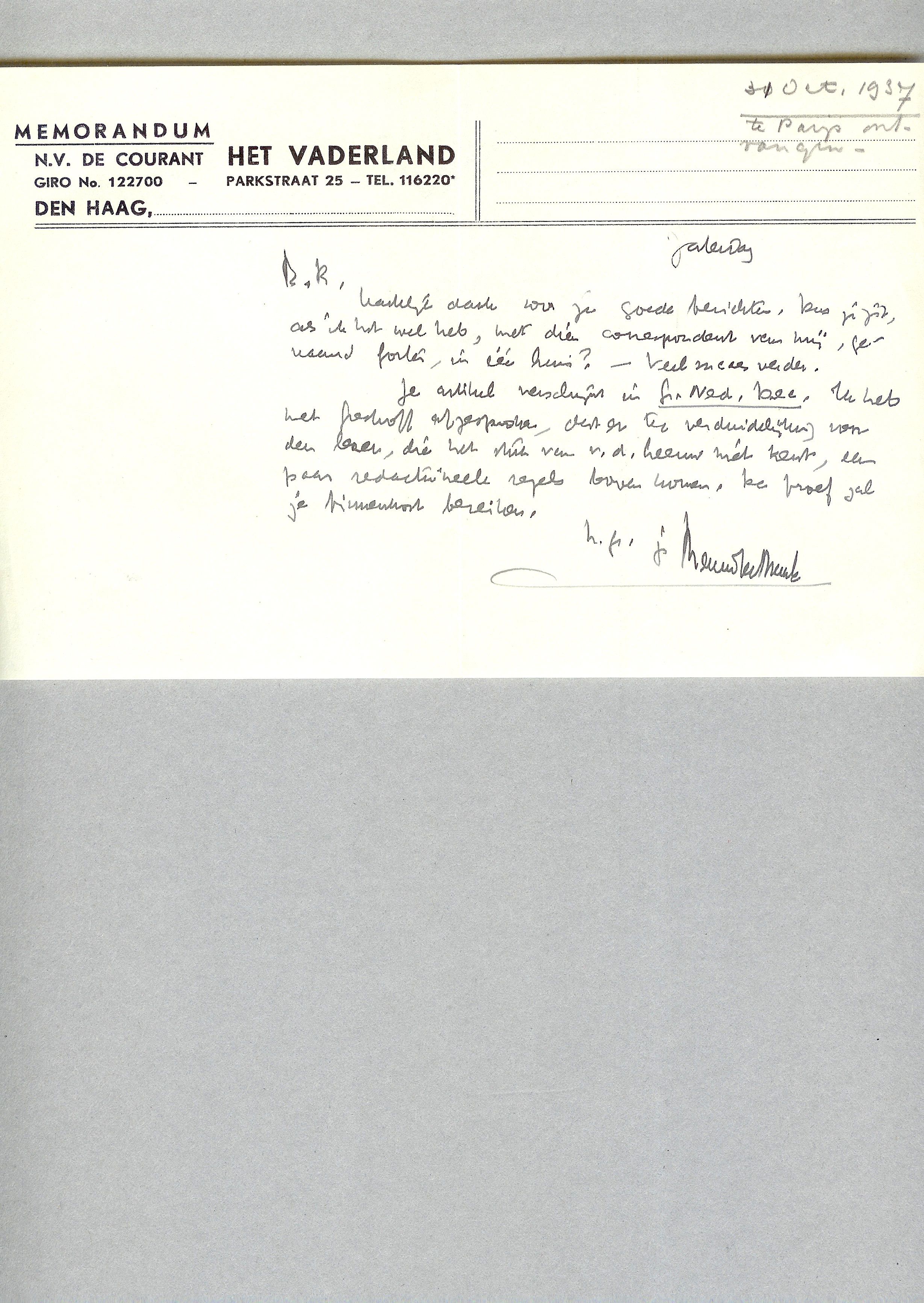 [in handschrift van Van Lier:] 31 oktober 1937: te Parijs ontvangen.