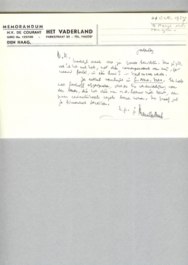 Je artikel verschijnt in Gr. Ned. Dec. Ik heb met Greshoff afgesproken, dat er ter verduidelijking voor den lezer, die het stuk van v.d. Leeuw niet kent, een paar redactioneele regels boven komen. De proef zal je binnenkort bereiken.